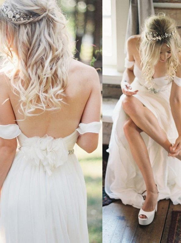 2024 Elegant Off-shoulder Beading Sash Backless White Long Chiffon Wedding Dresses RS174