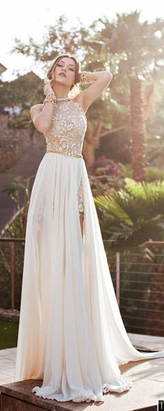 2024 Sexy Lace Backless Long Chiffon High Neckline Halter Side Slit Prom Dress Wedding Dress