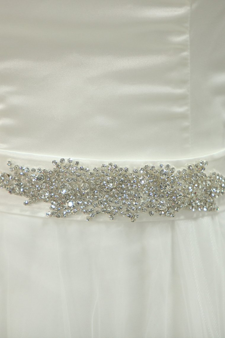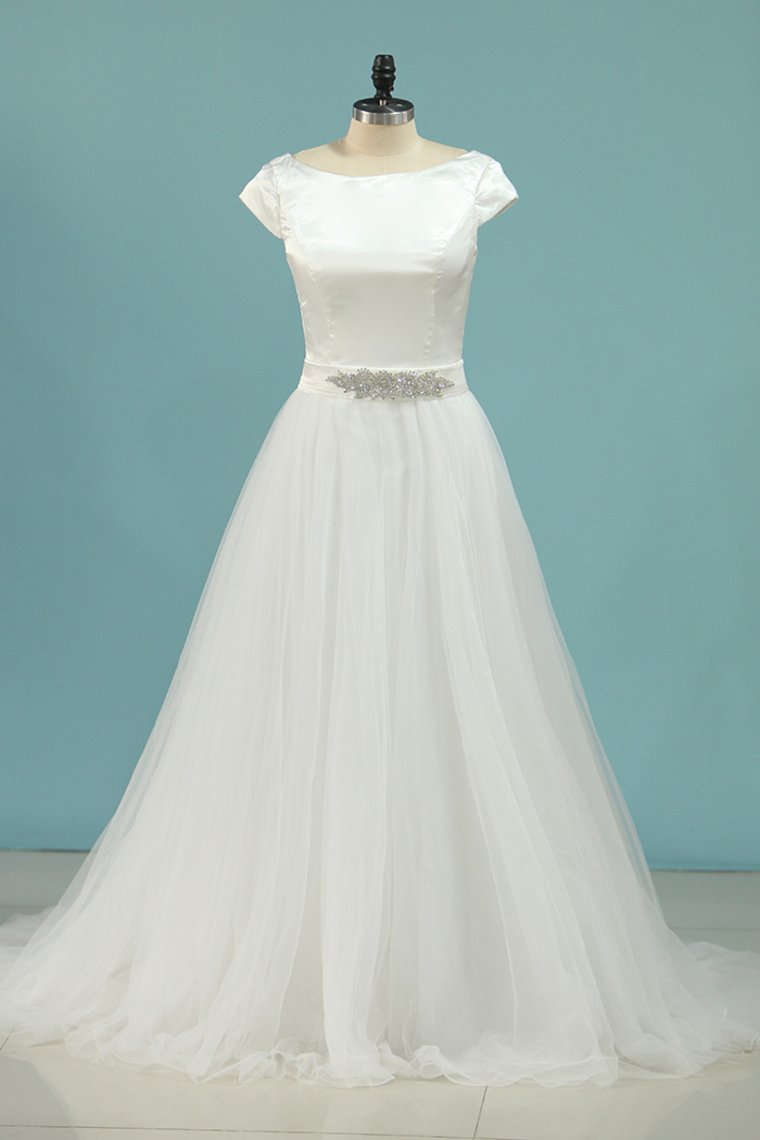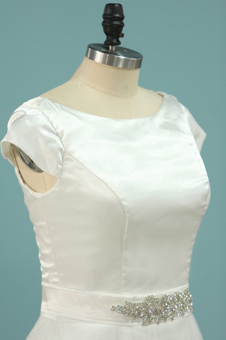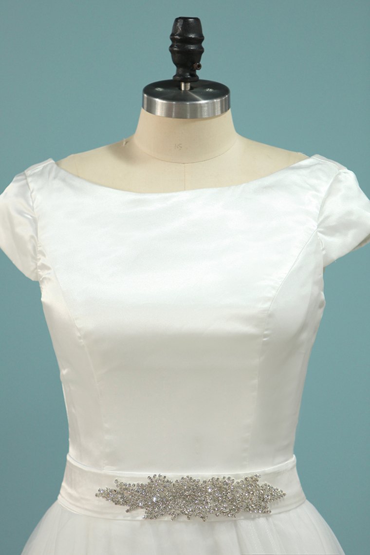 2024 A Line Bateau Short Sleeves Satin & Tulle With Beads Wedding Dresses