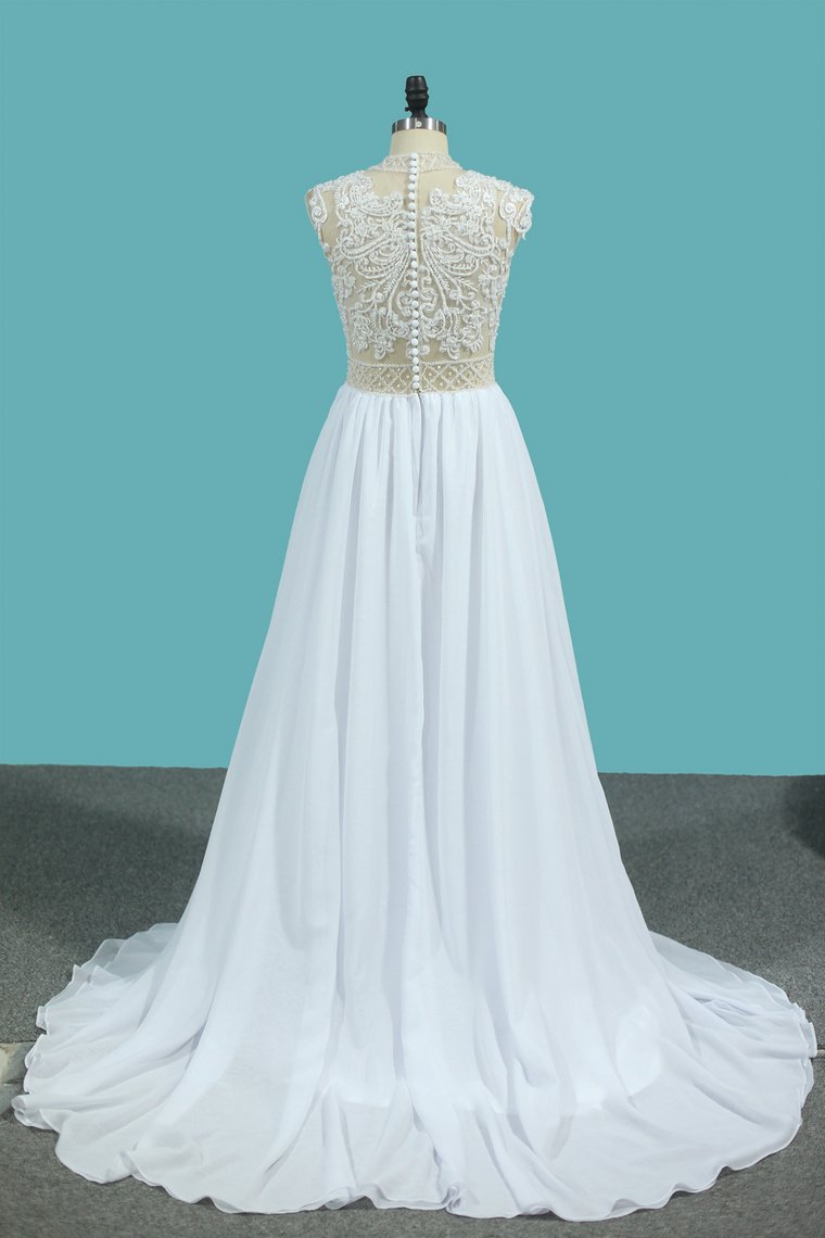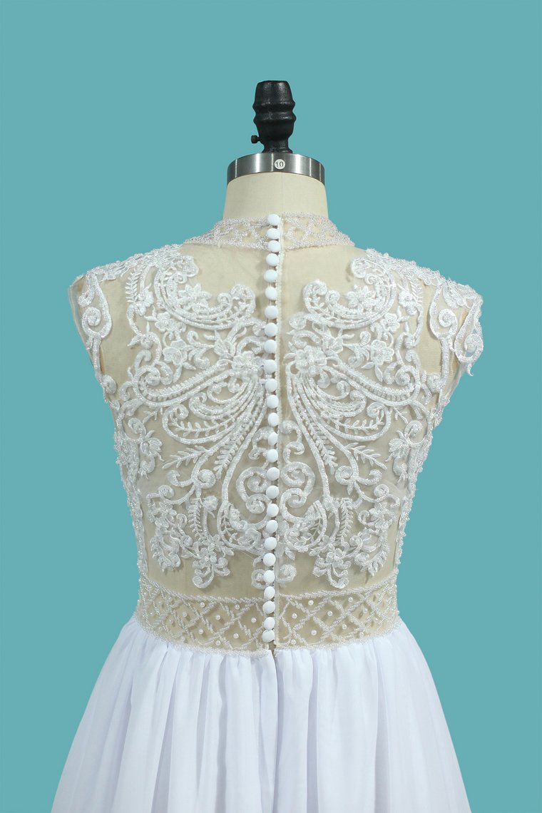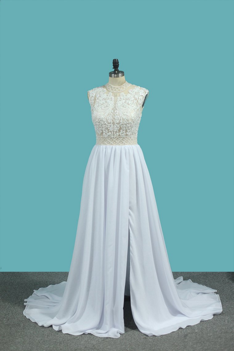 2024 A Line Chiffon High Neck Wedding Dresses With Beads And Slit Sweep Train