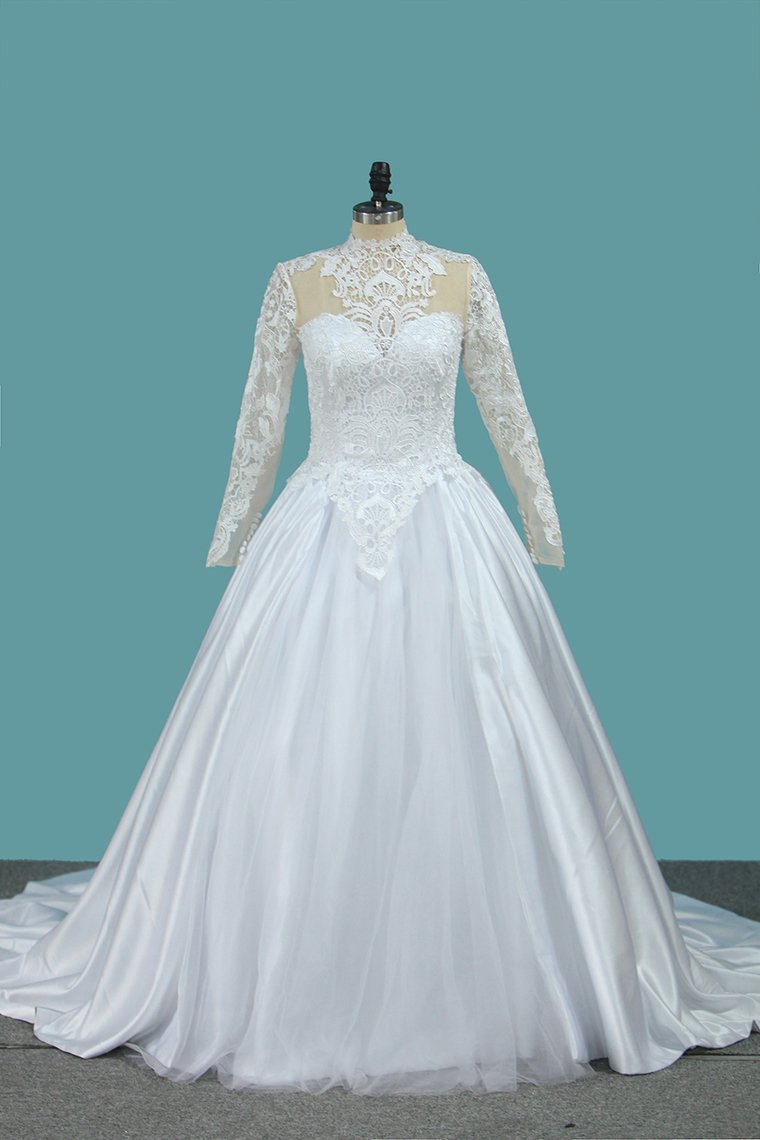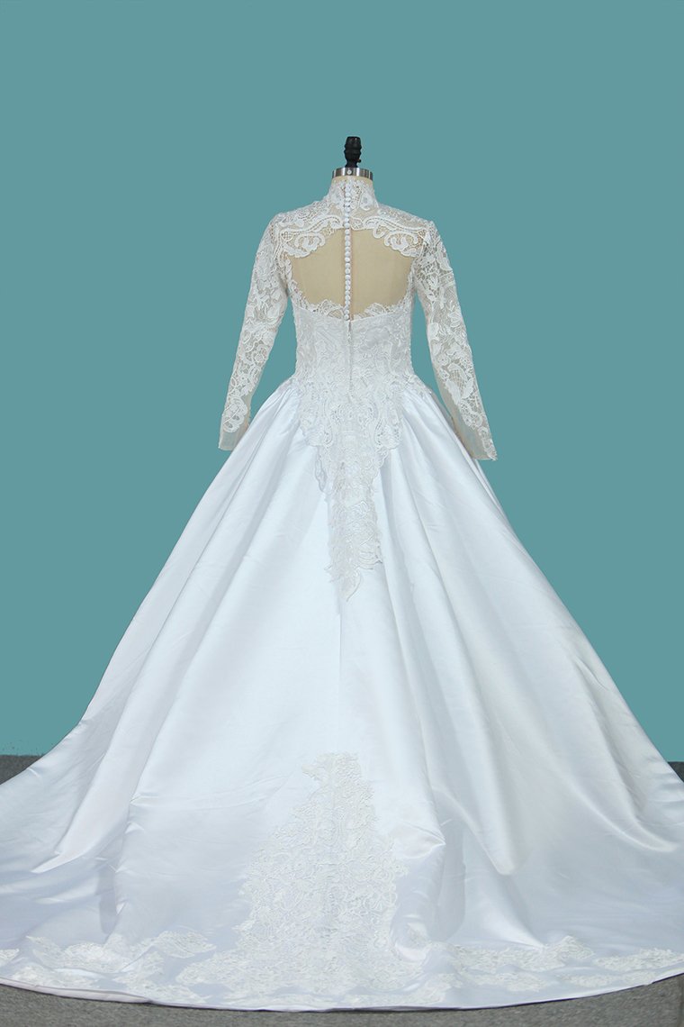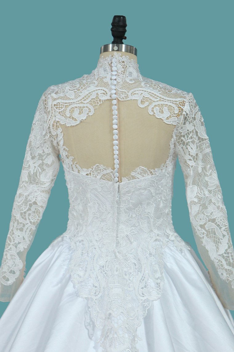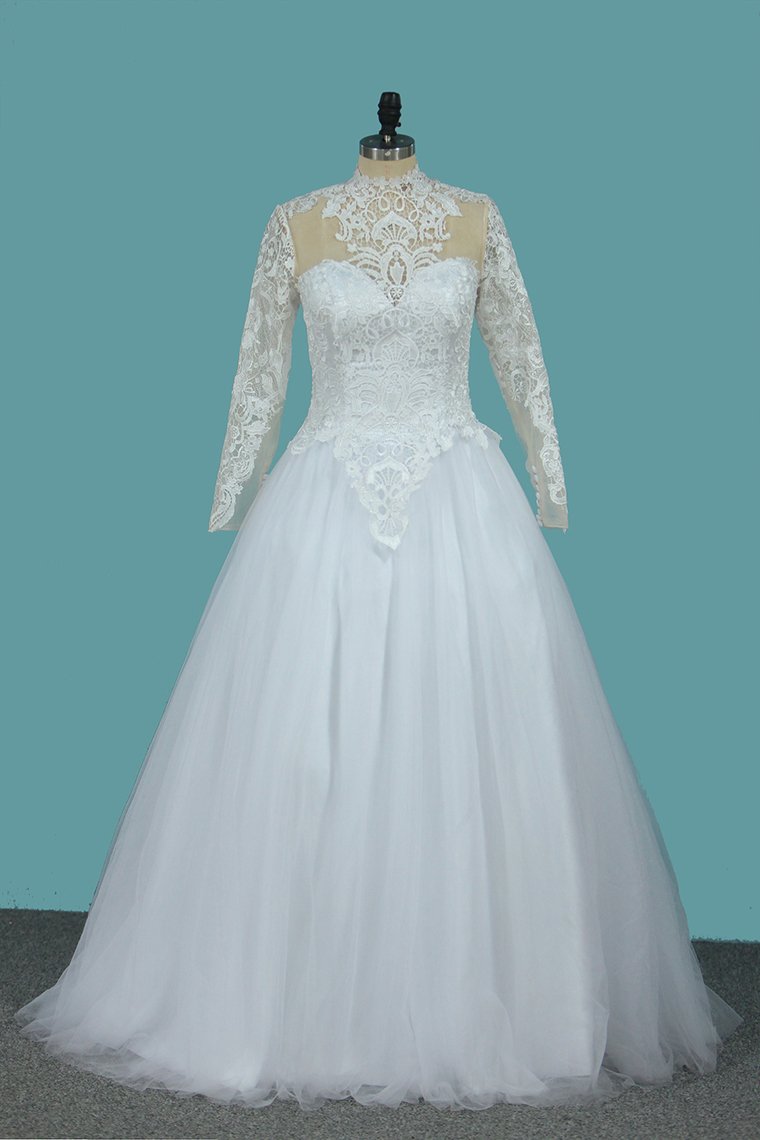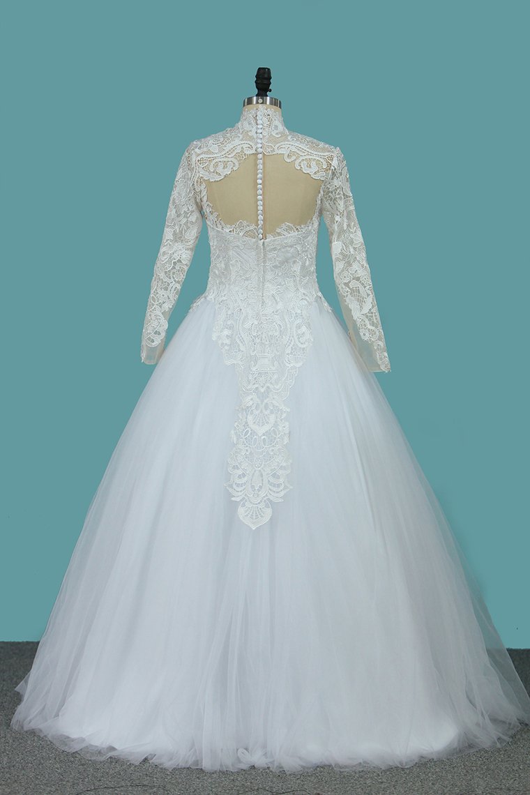 2024 A Line Long Sleeves High Neck Tulle With Applique Chapel Train Detachable Wedding Dresses