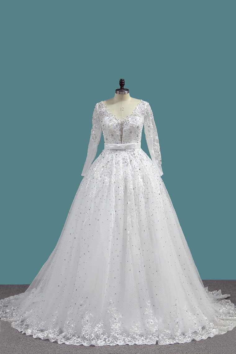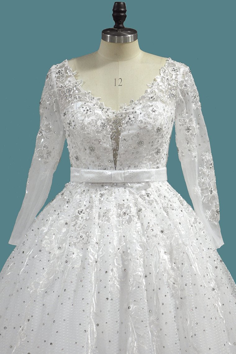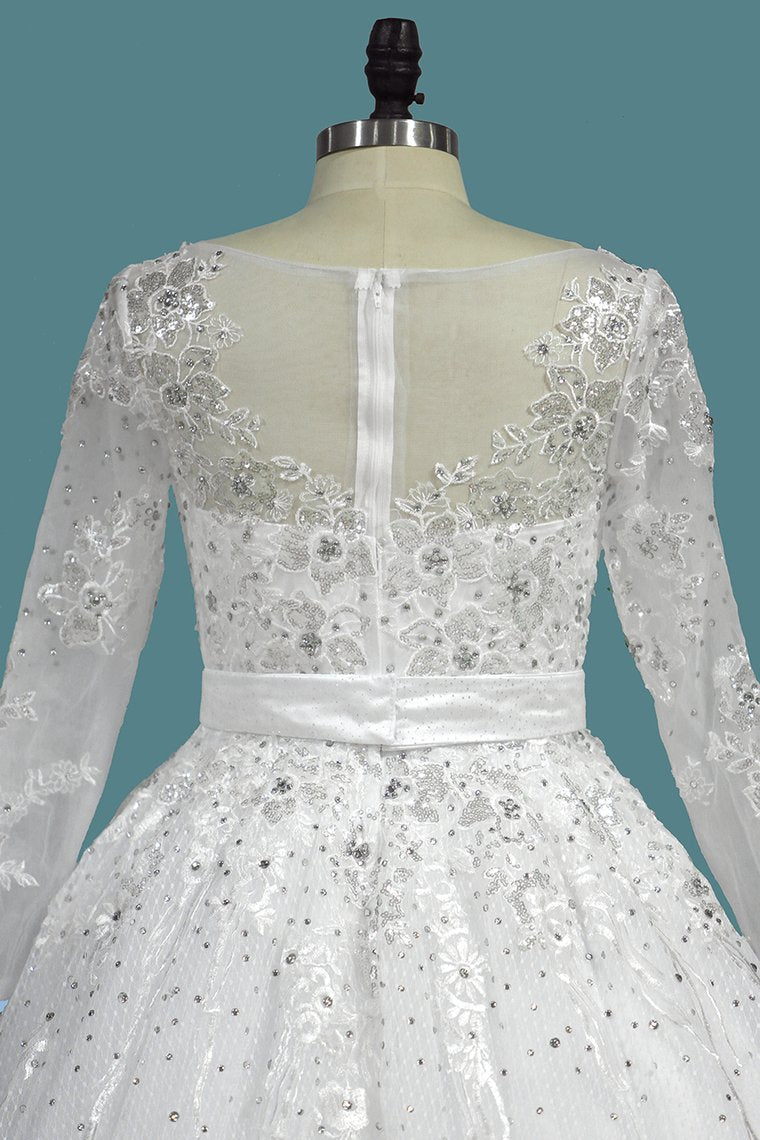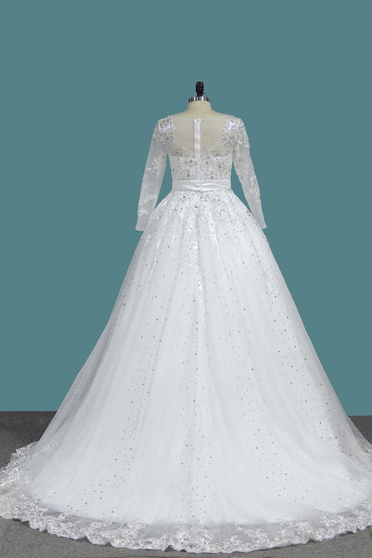 2024 A Line Long Sleeves Tulle Wedding Dresses With Applique And Sash