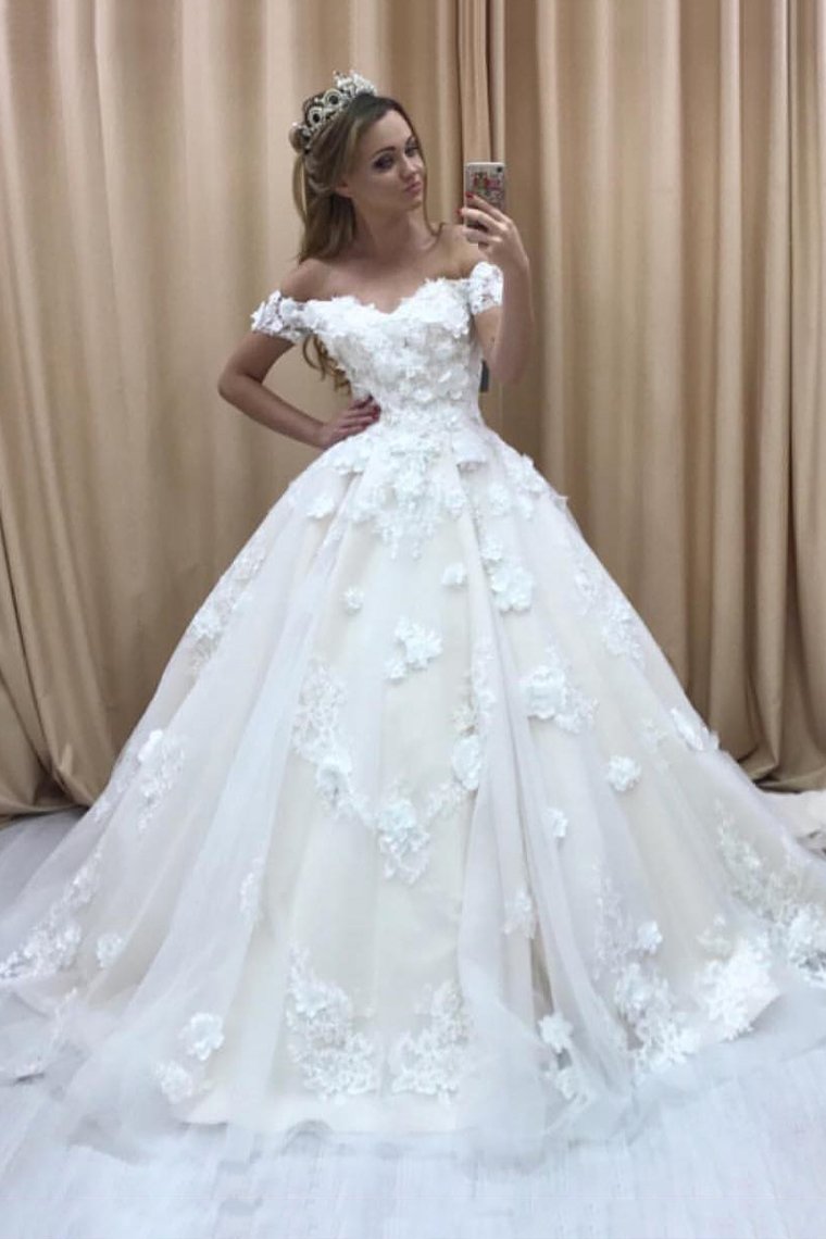 2024 A Line Off The Shoulder Wedding Dresses Tulle With Applique And Handmade Flower