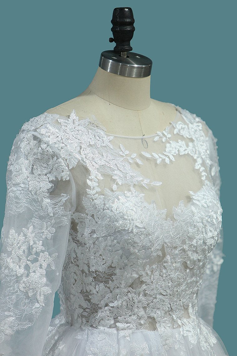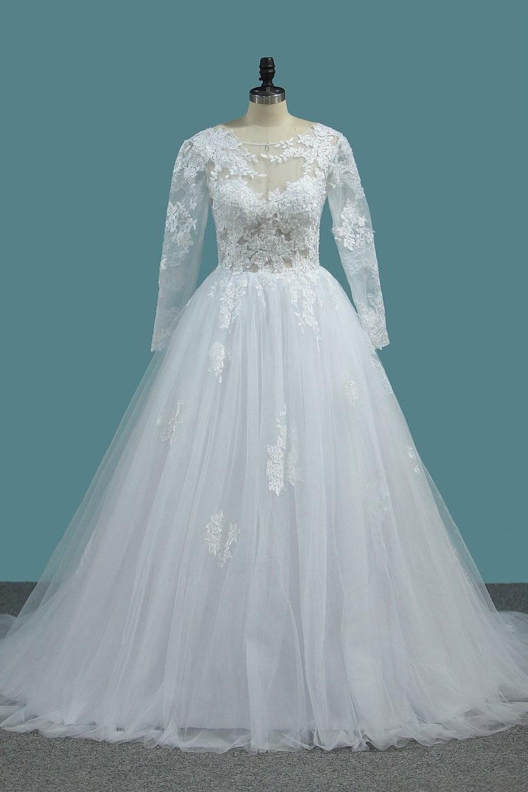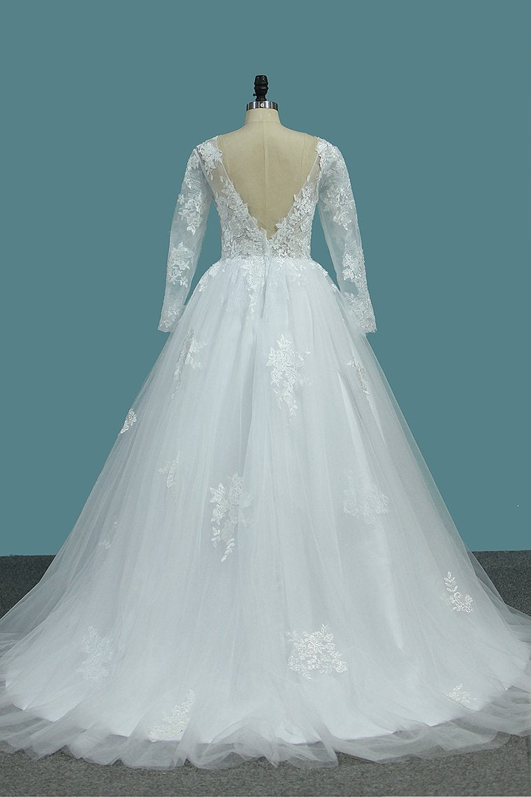 2024 A Line Open Back Long Sleeves Scoop Wedding Dresses Tulle With Applique