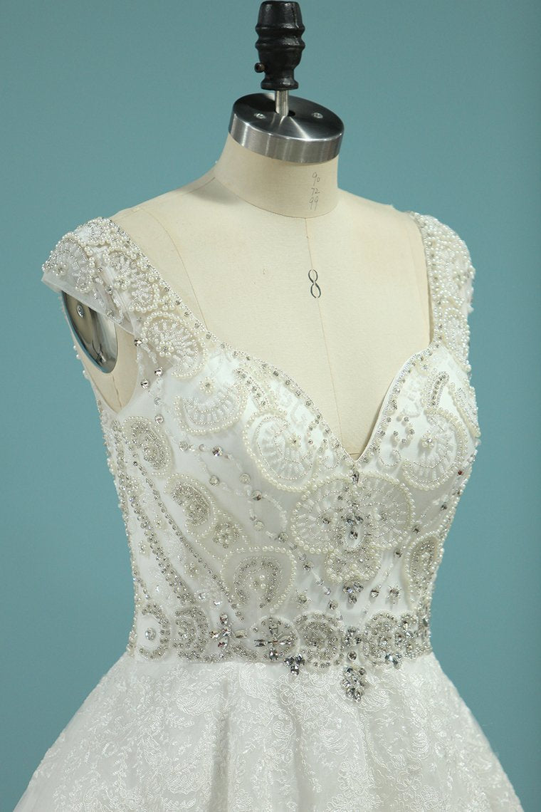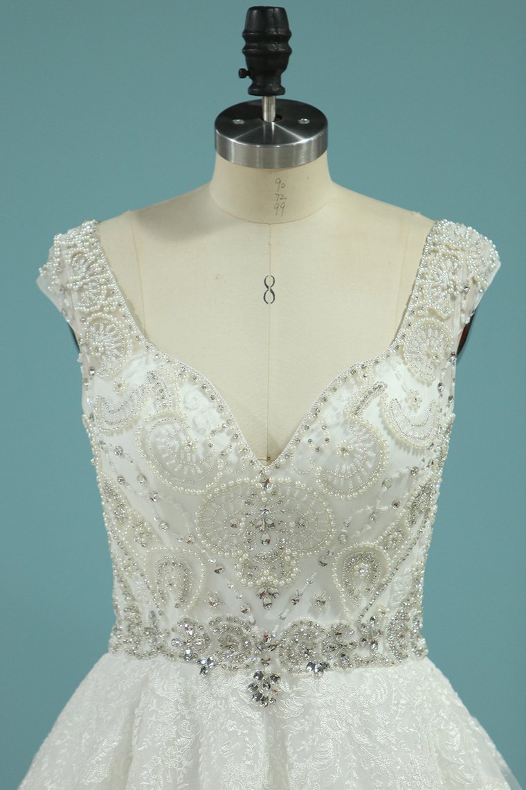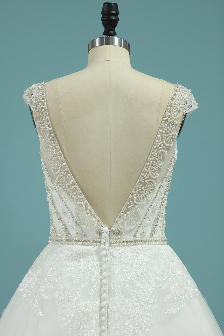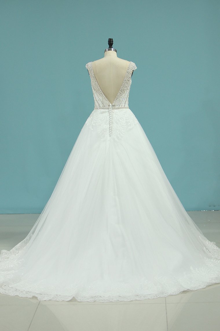 2024 A Line Open Back V Neck Wedding Dresses Tulle With Applique And Beading Chapel Train