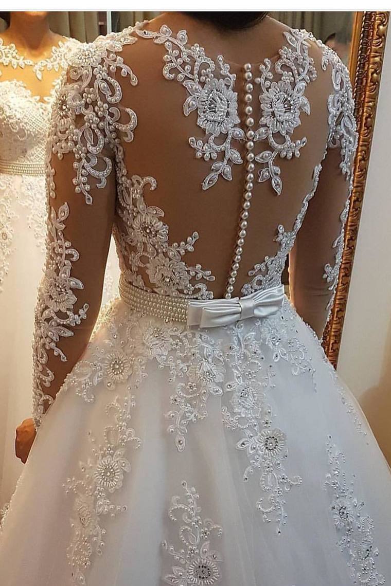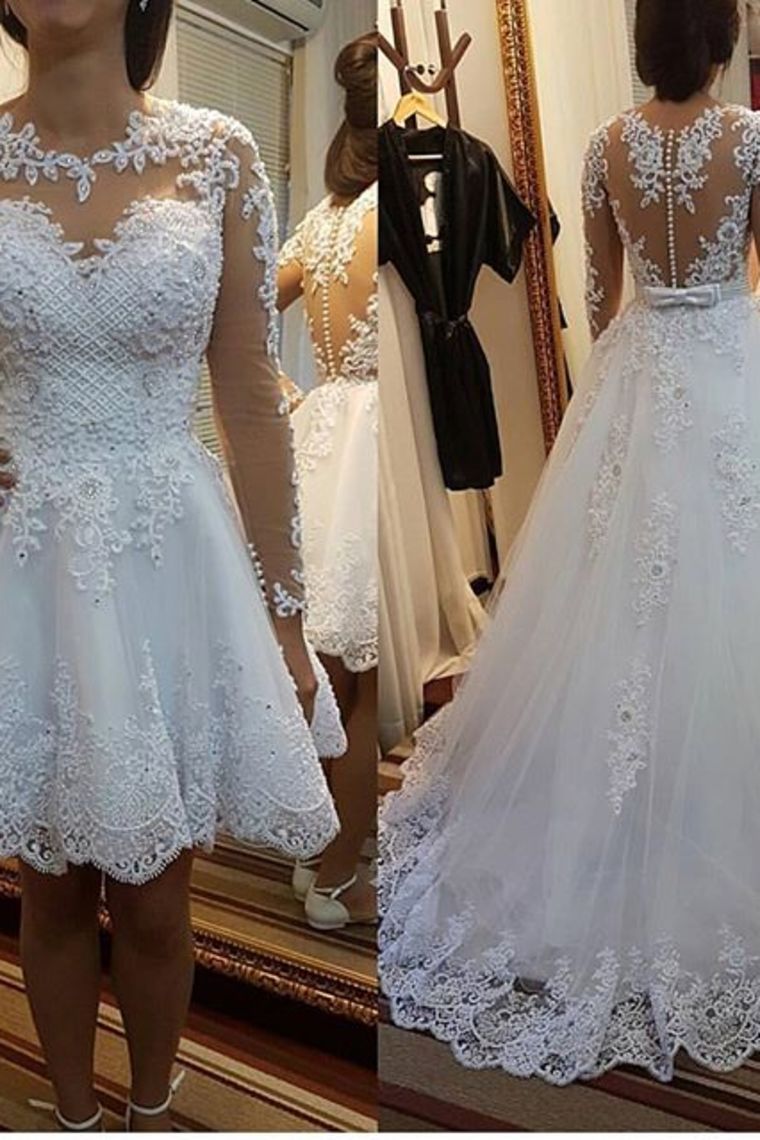 2024 A Line Scoop Neck Wedding Dresses Chapel Train Tulle With Applique & Beading Detachable Skirt Long Sleeves