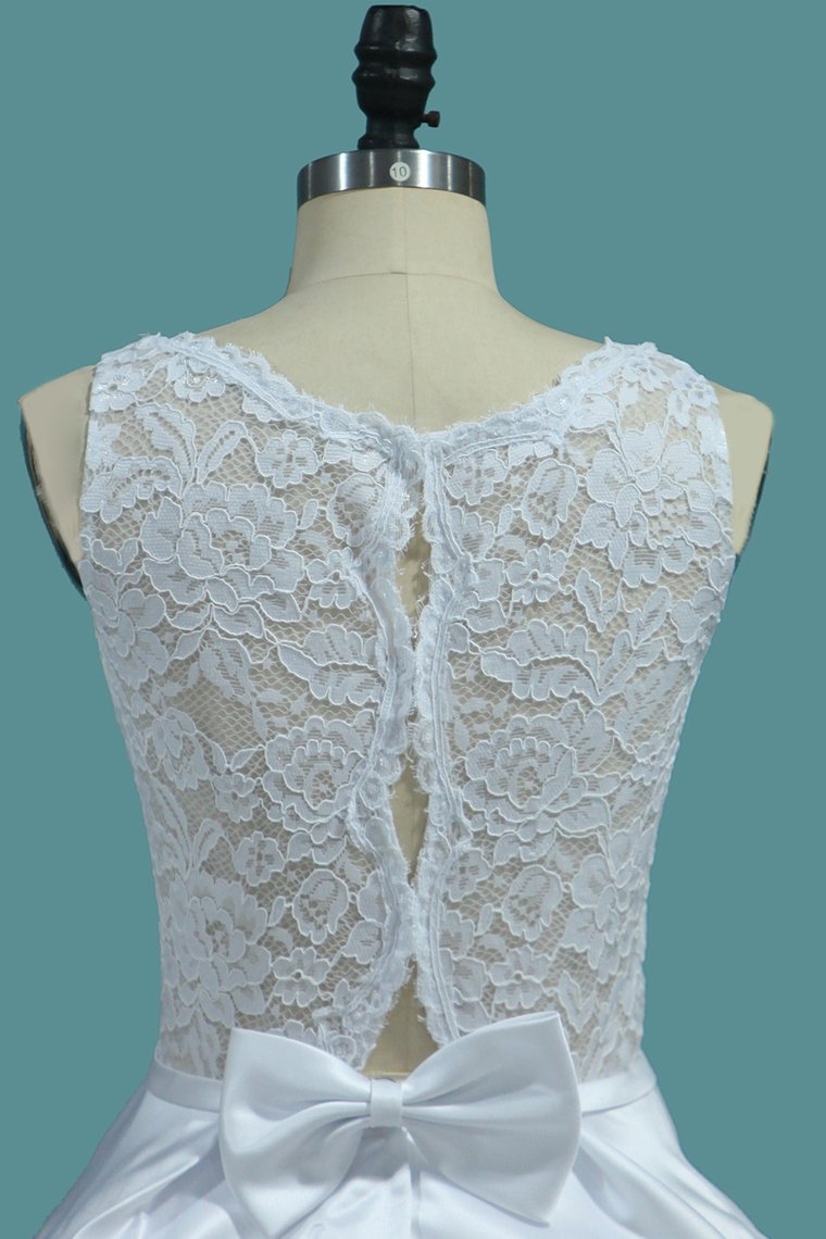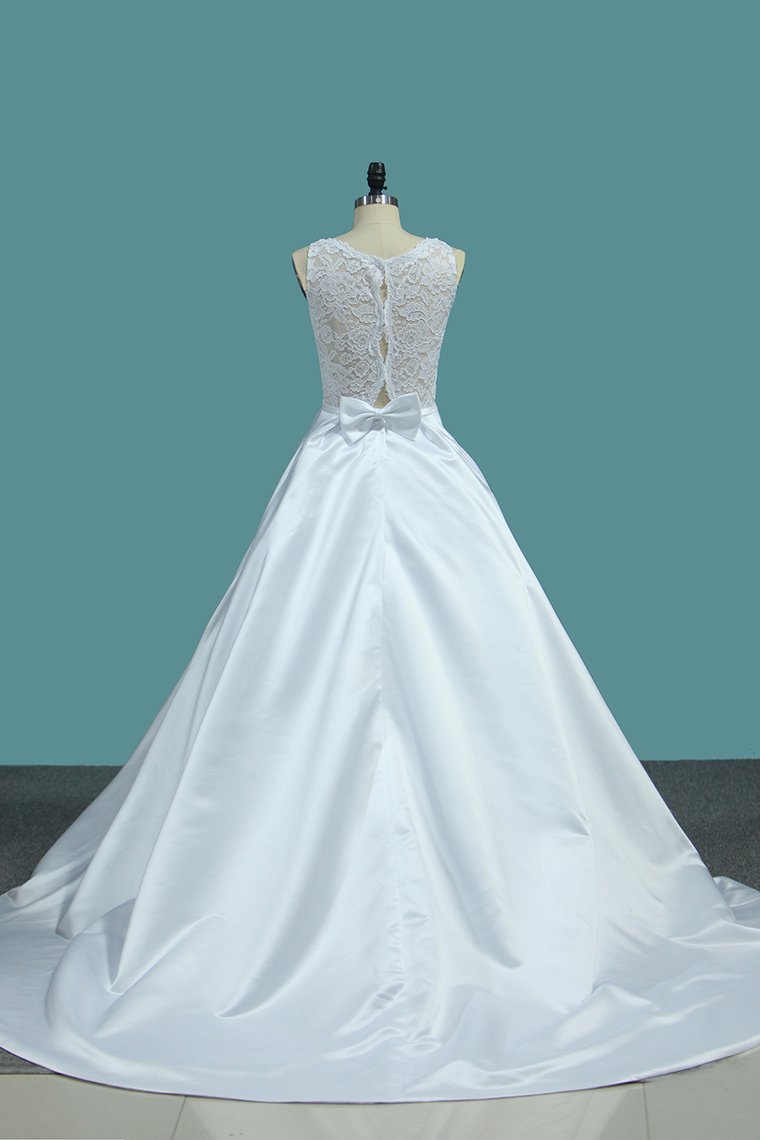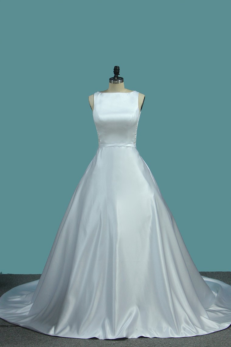2024 A Line Scoop Satin Wedding Dresses With Pocket Court Train