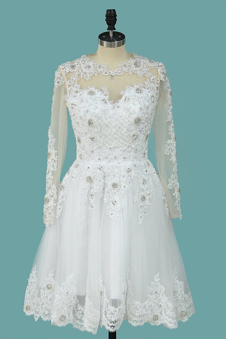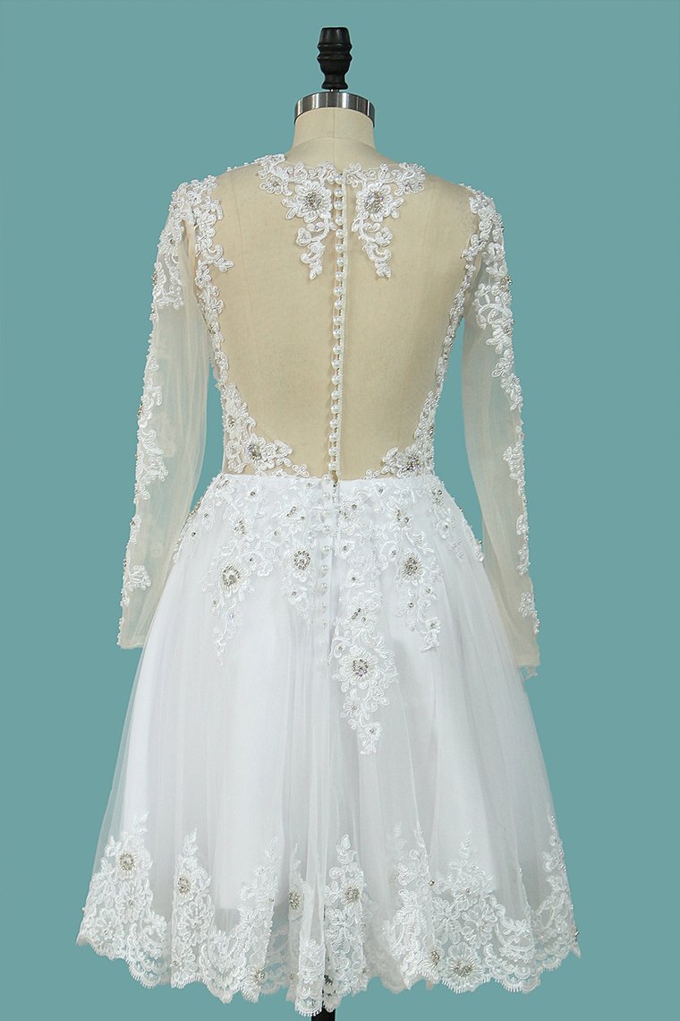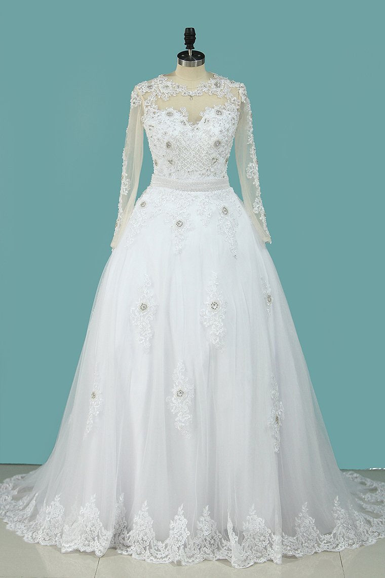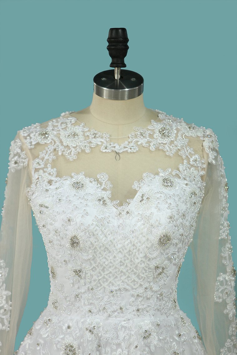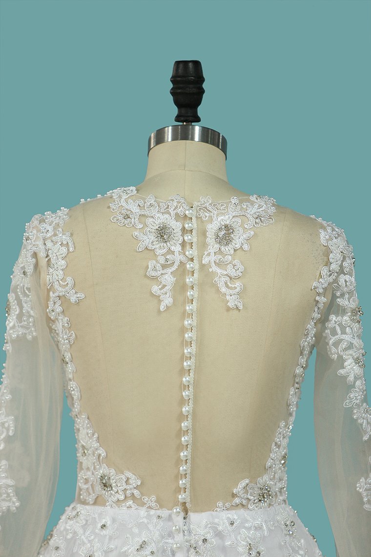 2024 A Line Scoop Wedding Dresses Long Sleeves Tulle With Applique & Beading Detachable Skirt Chapel Train