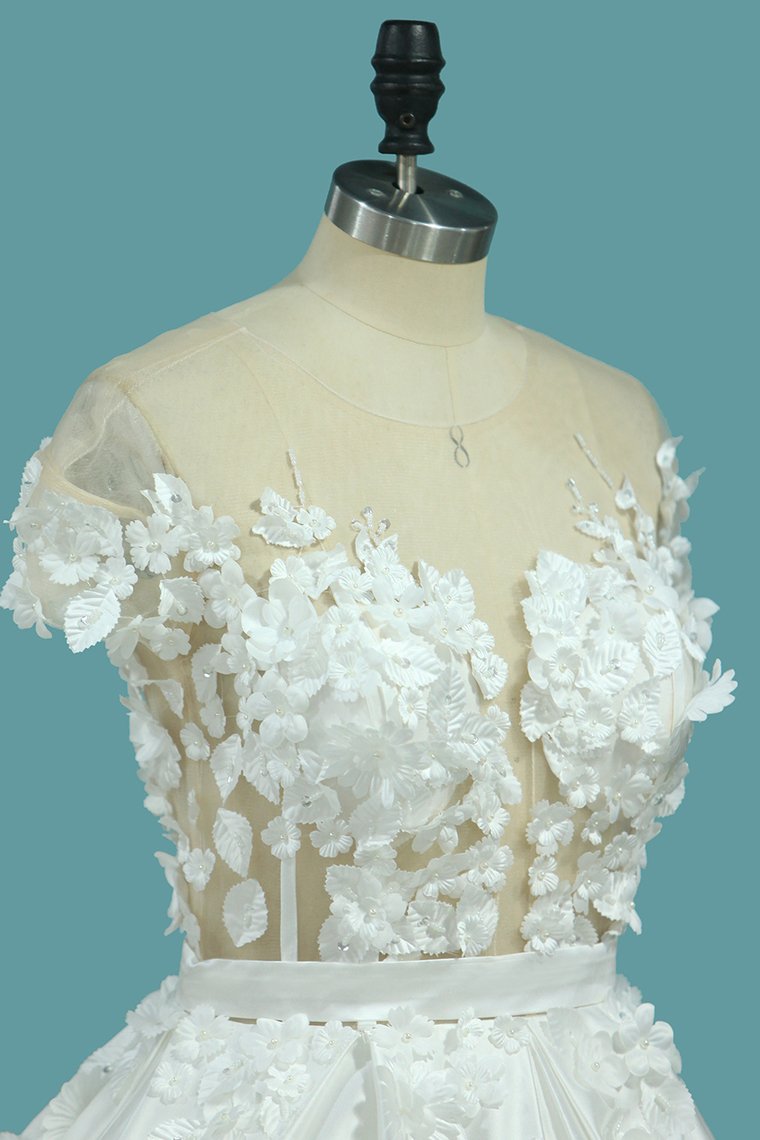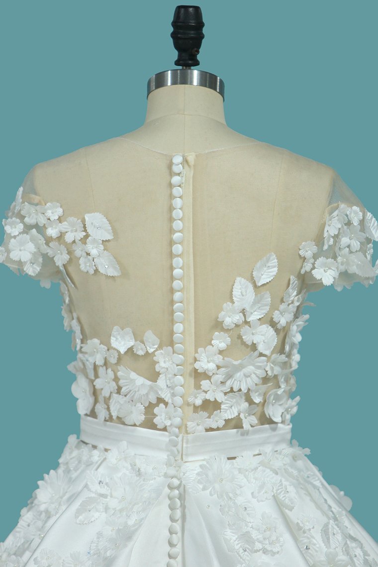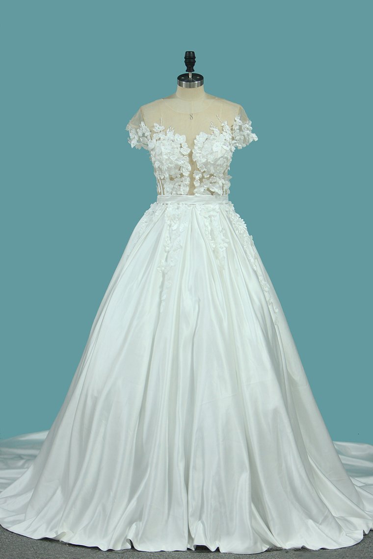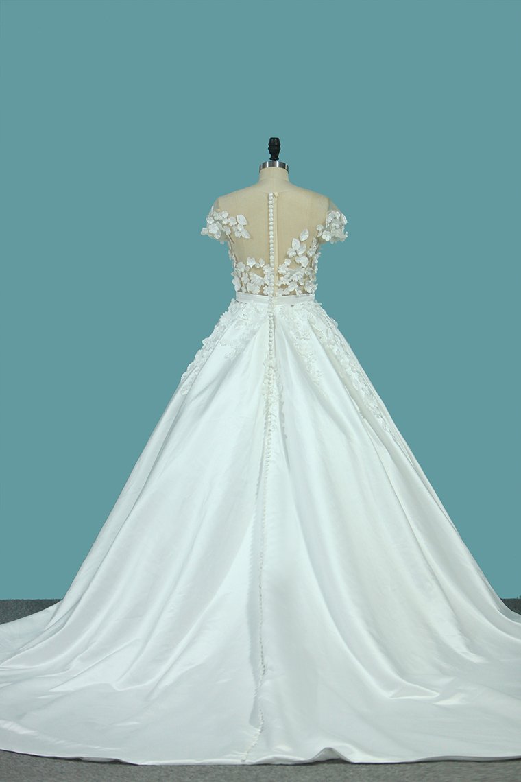 2024 A Line Scoop Wedding Dresses Satin With Handmade Flower And Sash Chapel Train