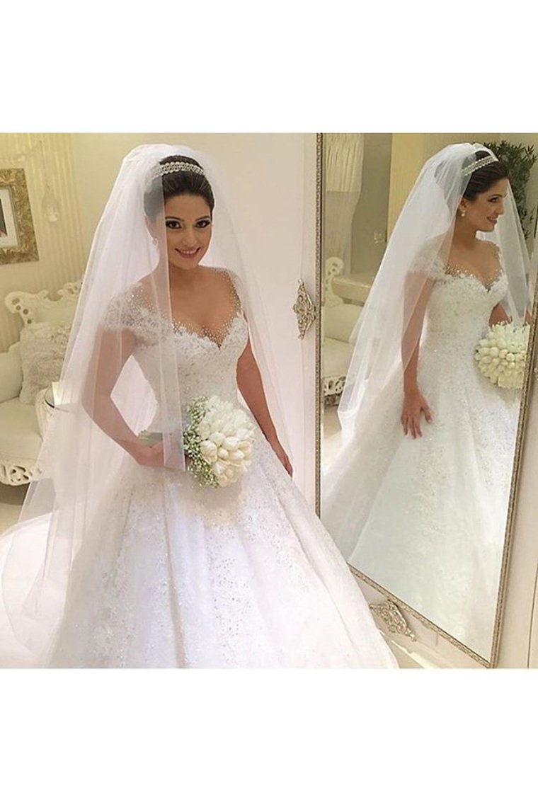 2024 A Line Scoop Wedding Dresses Tulle With Applique And Beads Court Train