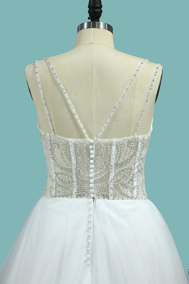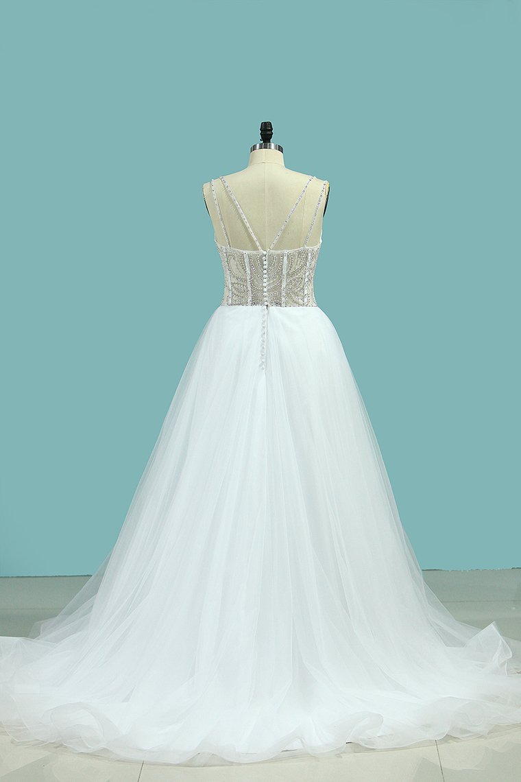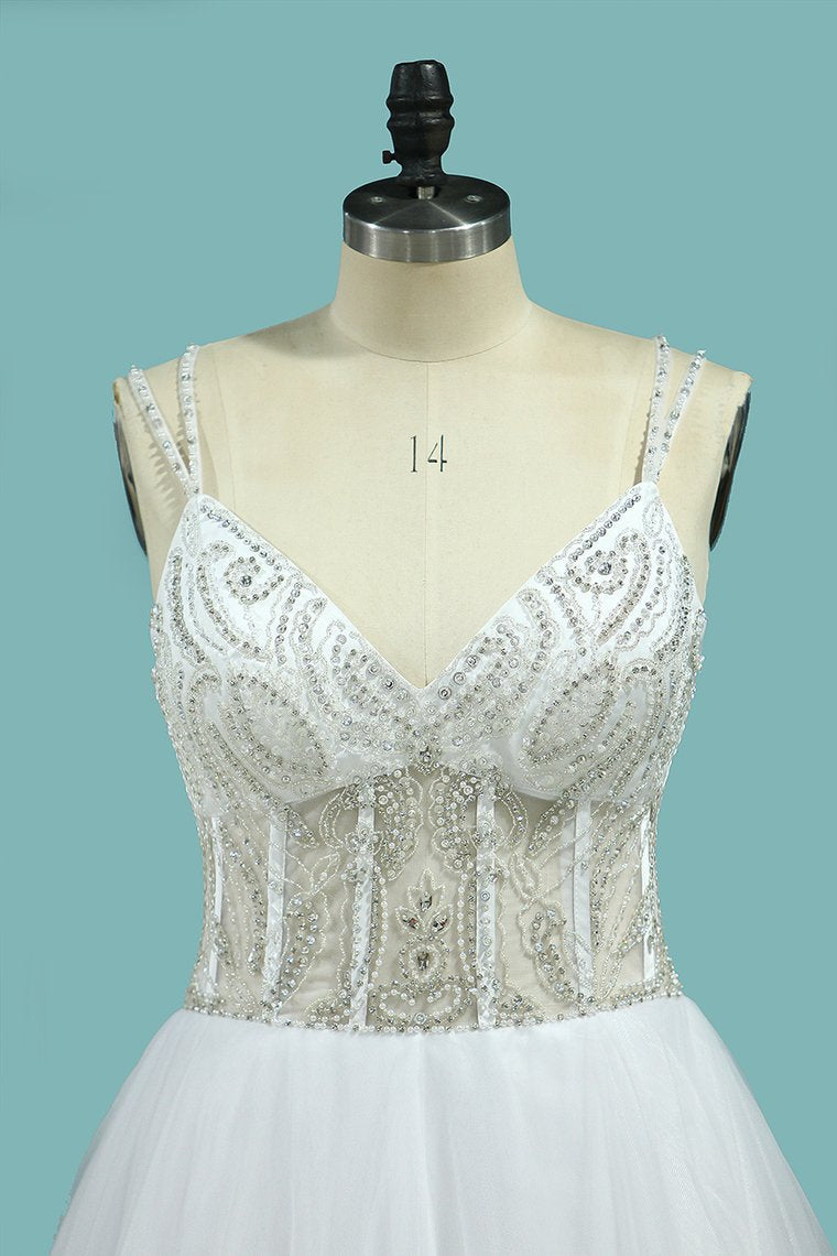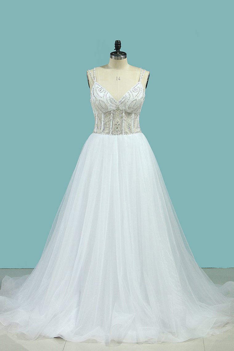 2024 A Line Spaghetti Straps Wedding Dresses Beaded Bodice Tulle Court Train