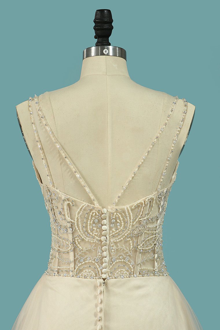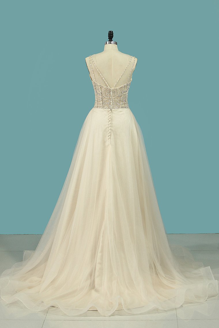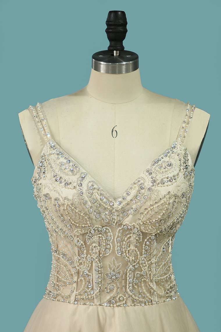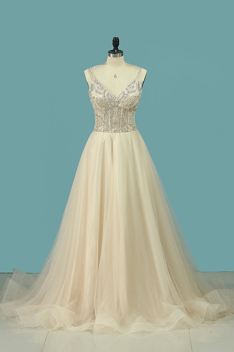 2024 A Line Spaghetti Straps Wedding Dresses Beaded Bodice Tulle Court Train