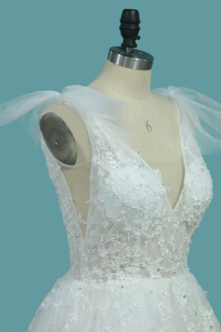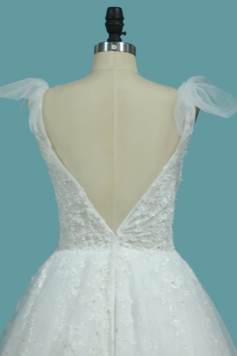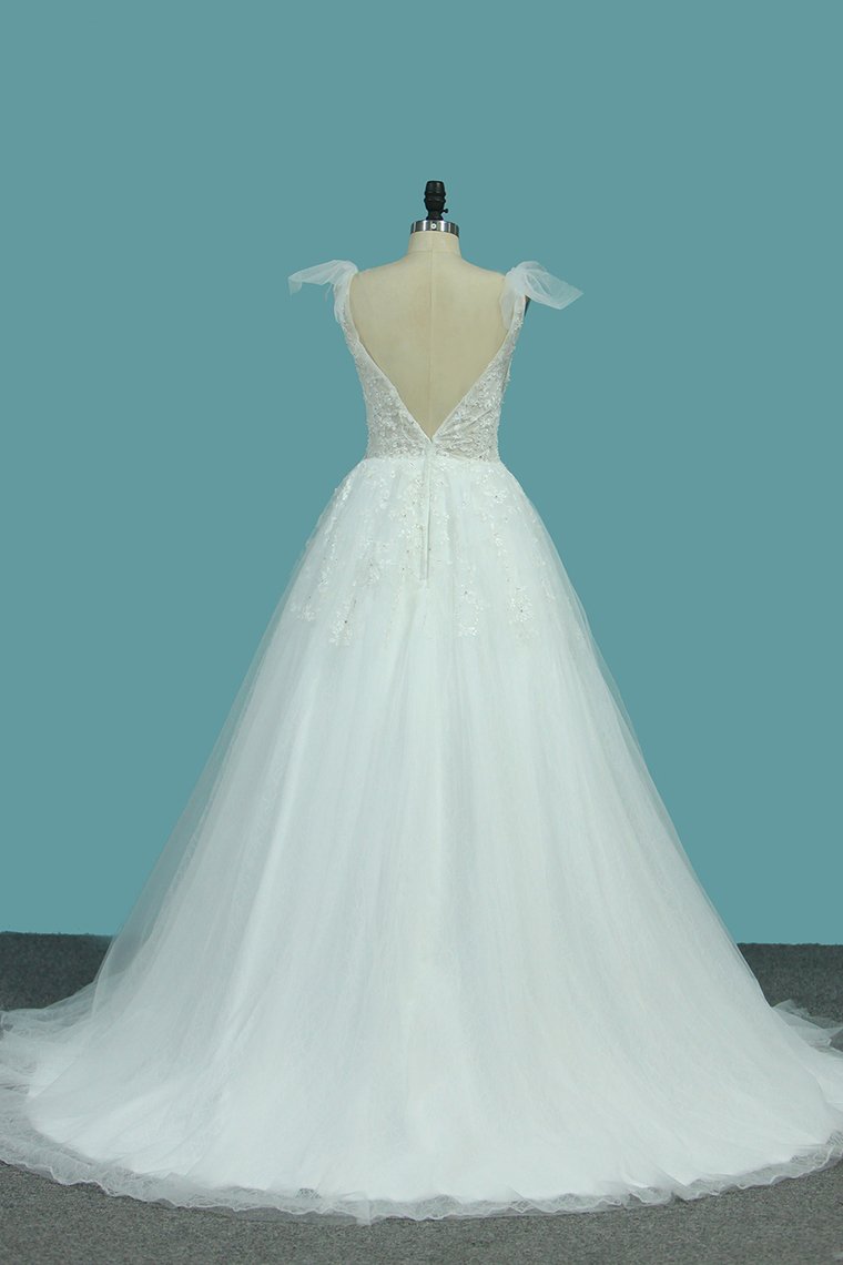 2024 A Line Spaghetti Straps Wedding Dresses Tulle & Lace With Applique Court Train
