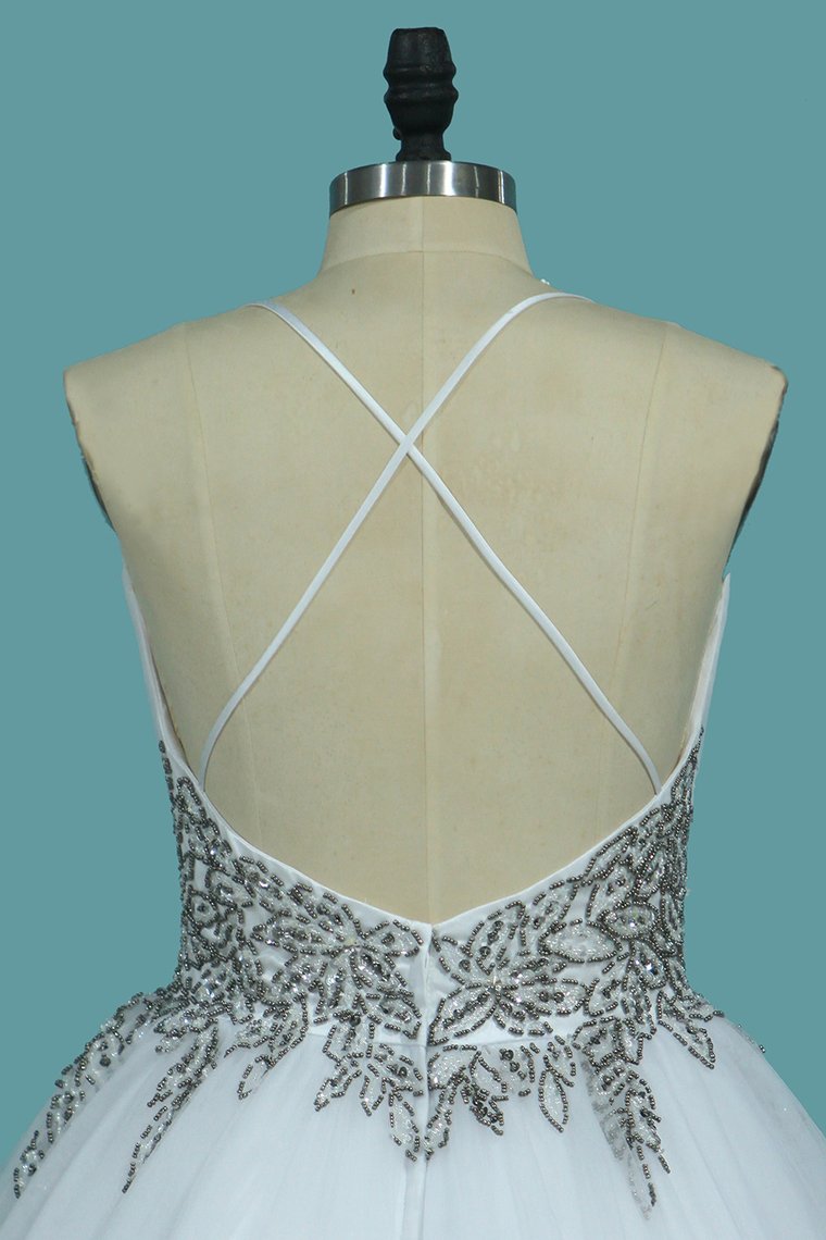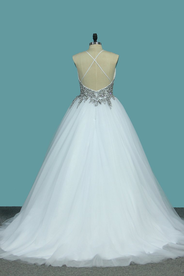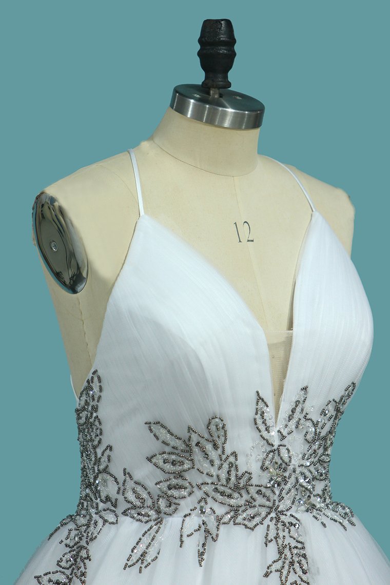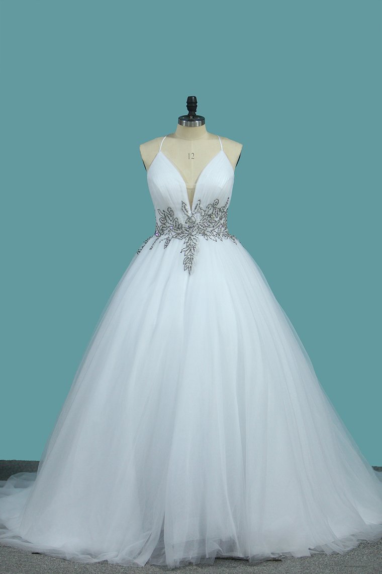 2024 A Line Spaghetti Straps Wedding Dresses Tulle With Beads Open Back