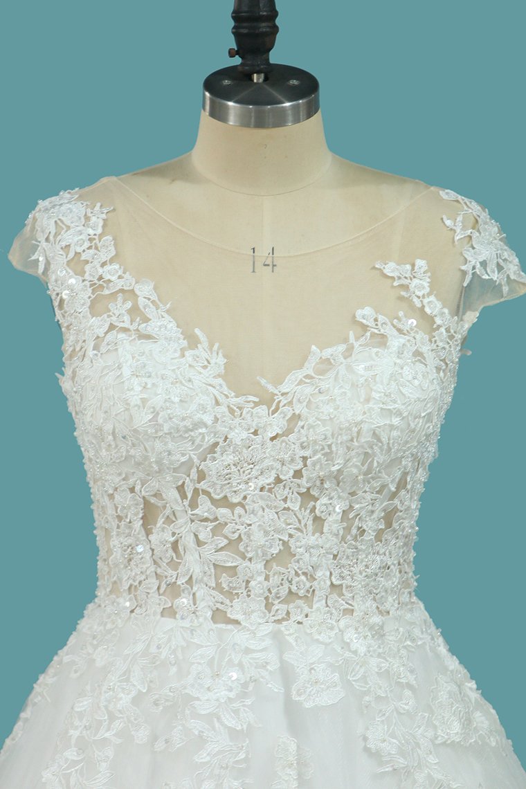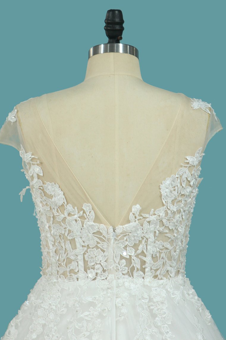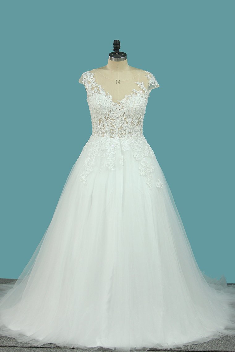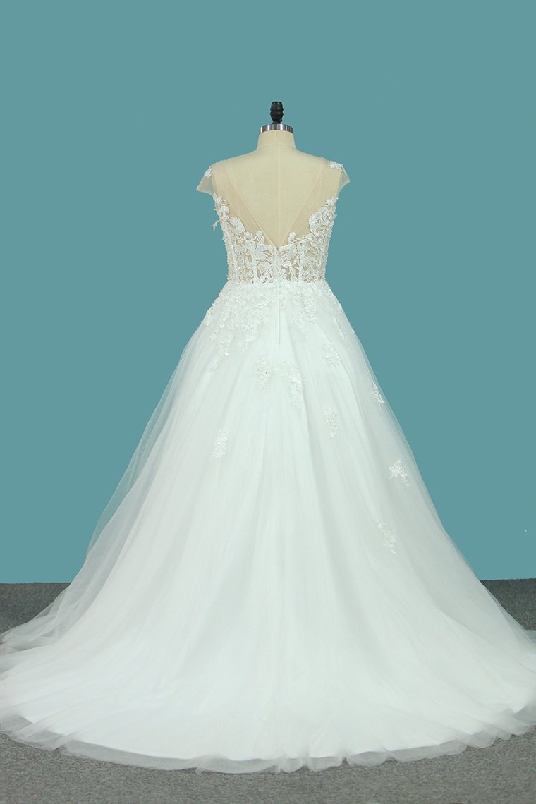 2024 A Line Tulle Cap Sleeve Scoop Wedding Dresses With Applique Court Train