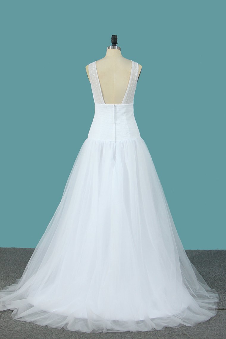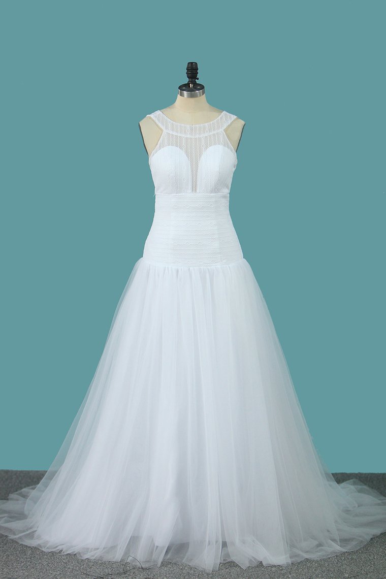 2024 A Line Tulle & Lace Wedding Dresses Scoop Sweep Train New Arrival