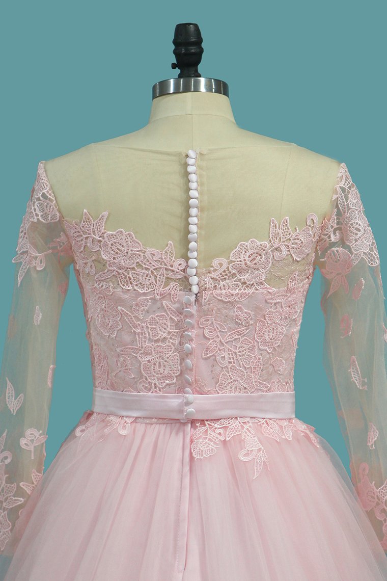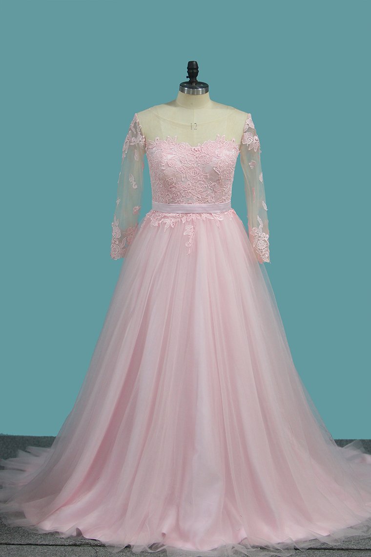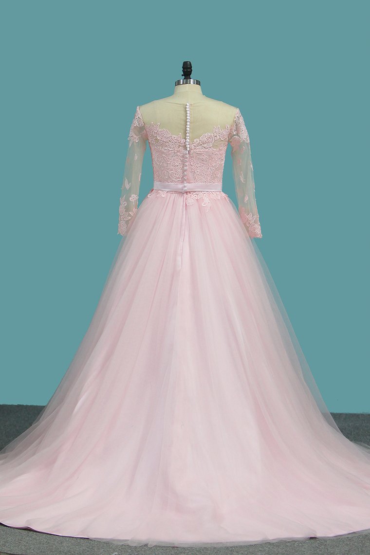 2024 A Line Tulle Long Sleeves Scoop Wedding Dresses With Applique And Sash Sweep Train