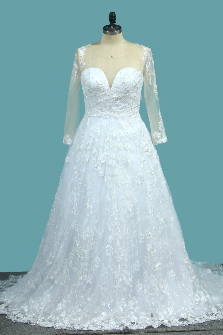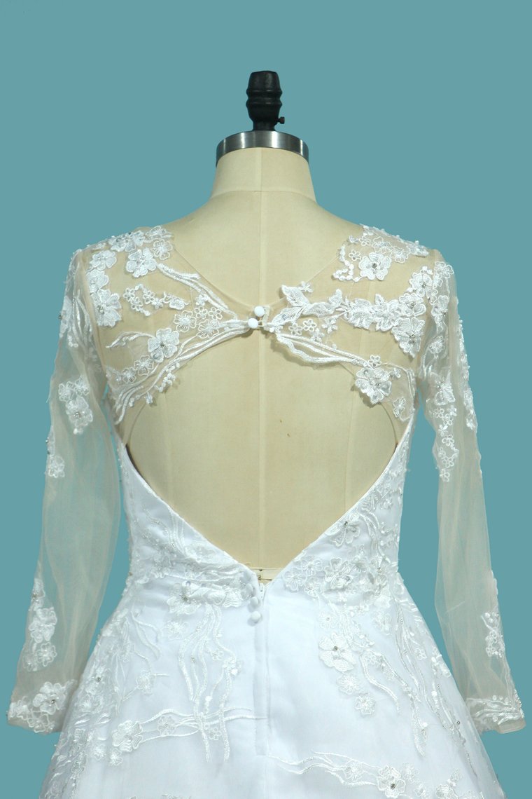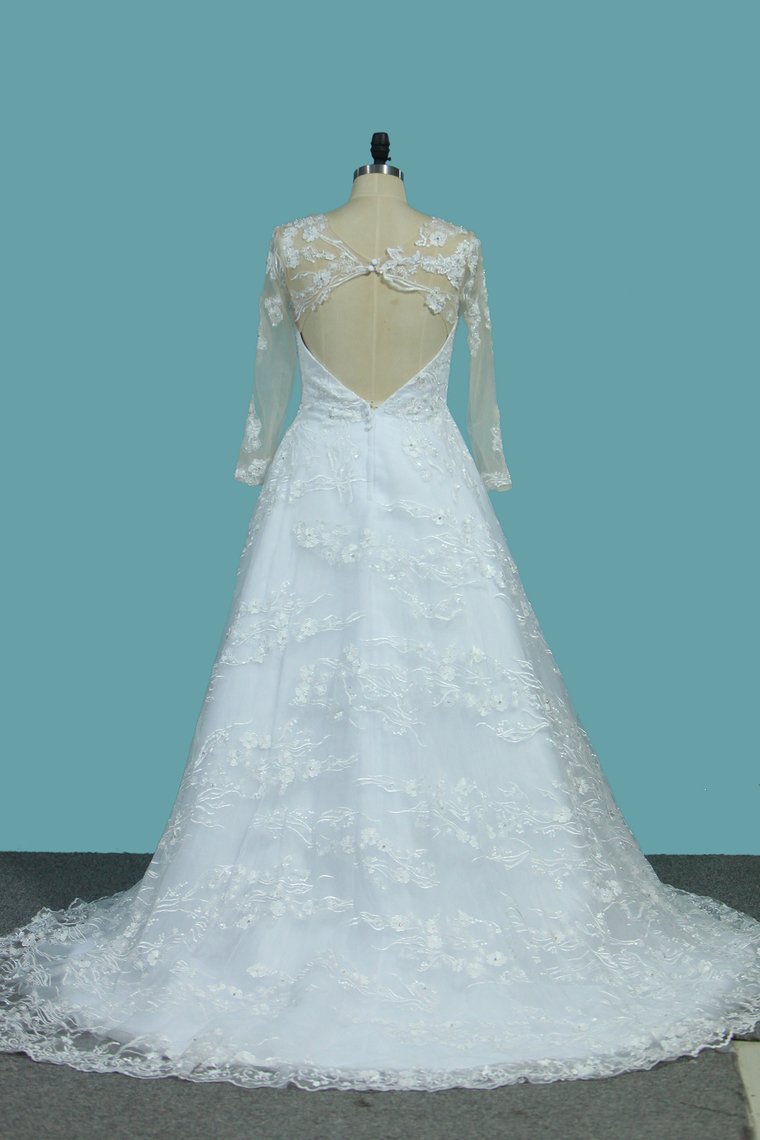 2024 A Line Tulle Long Sleeves Scoop Wedding Dresses With Applique Open Back