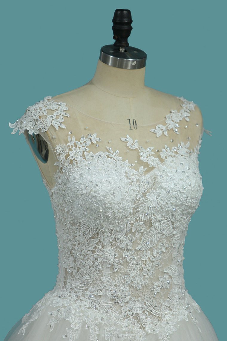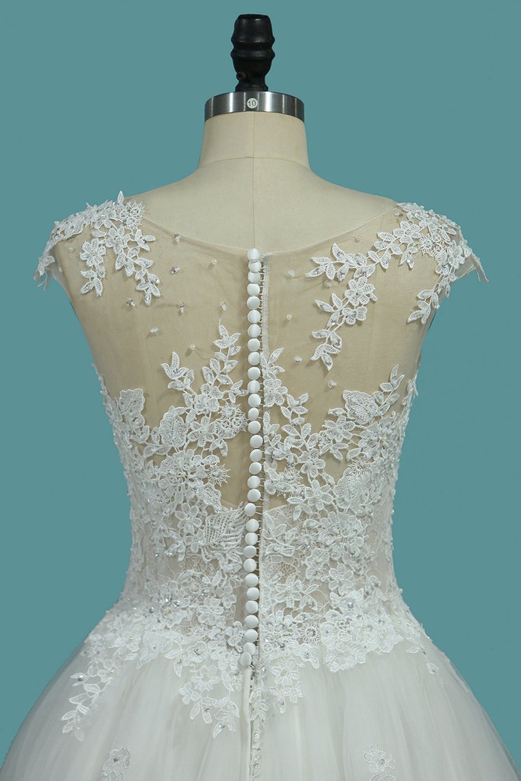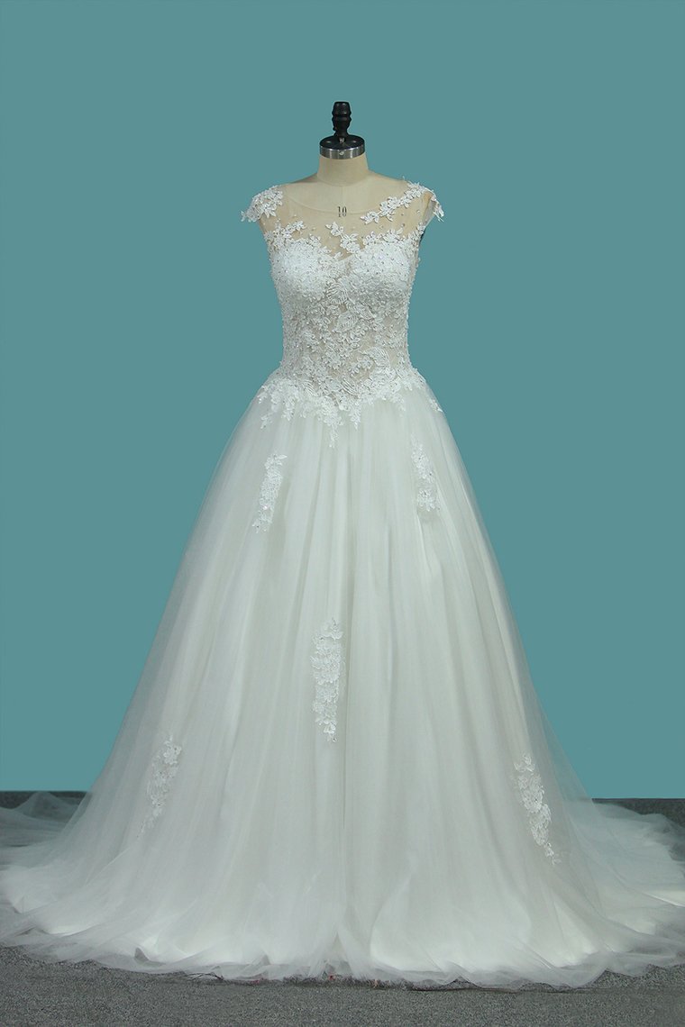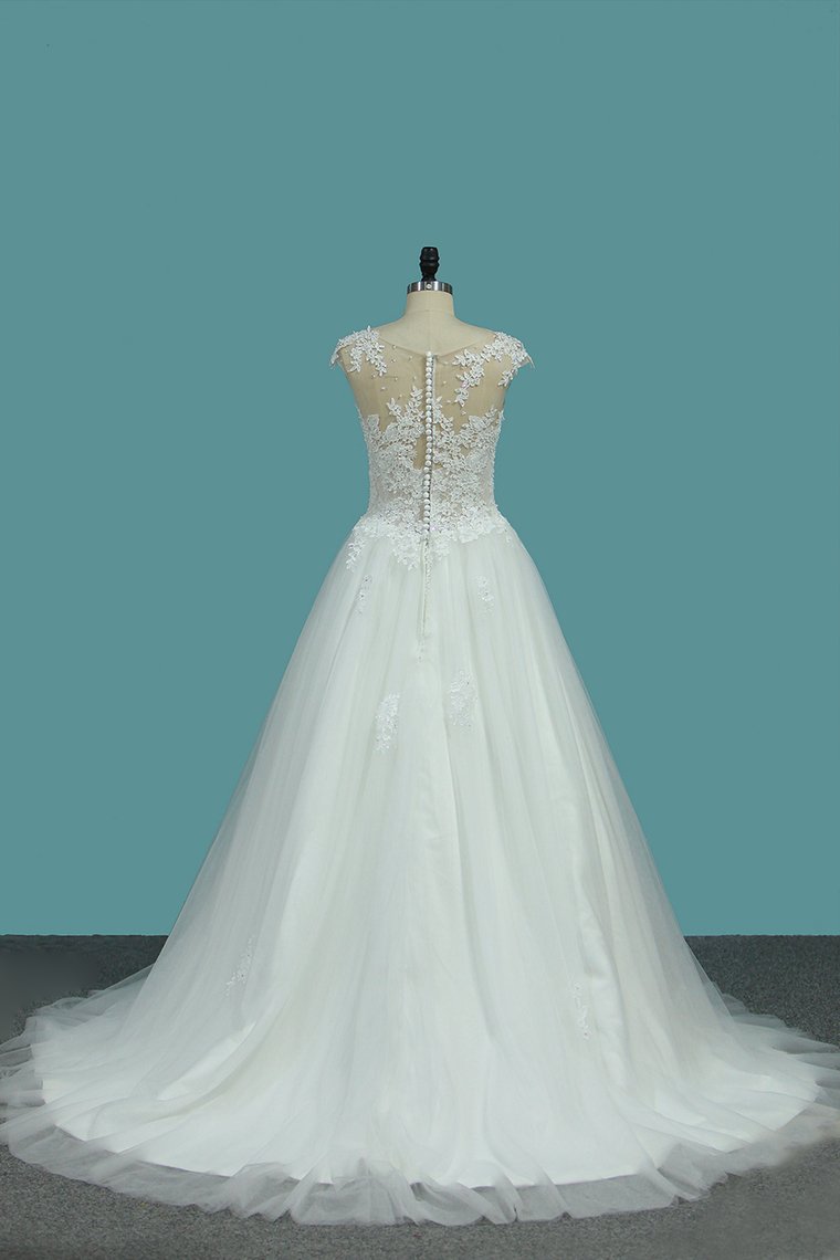 2024 A Line Tulle Scoop Wedding Dresses With Applique Sweep Train