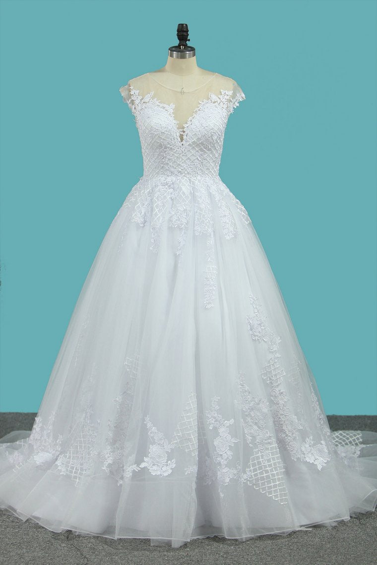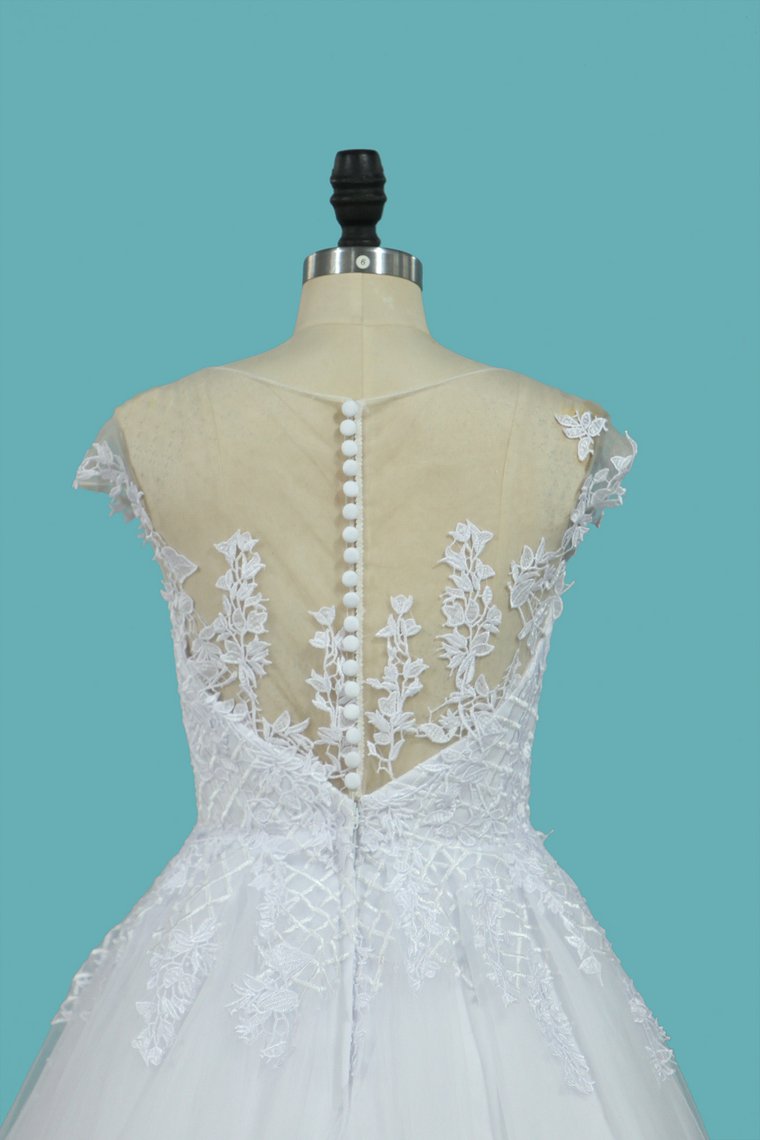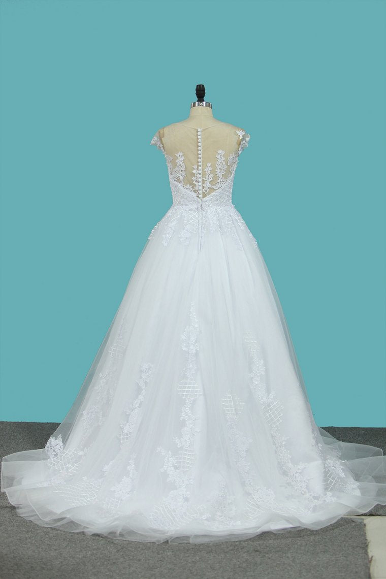 2024 A Line Tulle Wedding Dresses Scoop Cap Sleeves With Applique Court Train