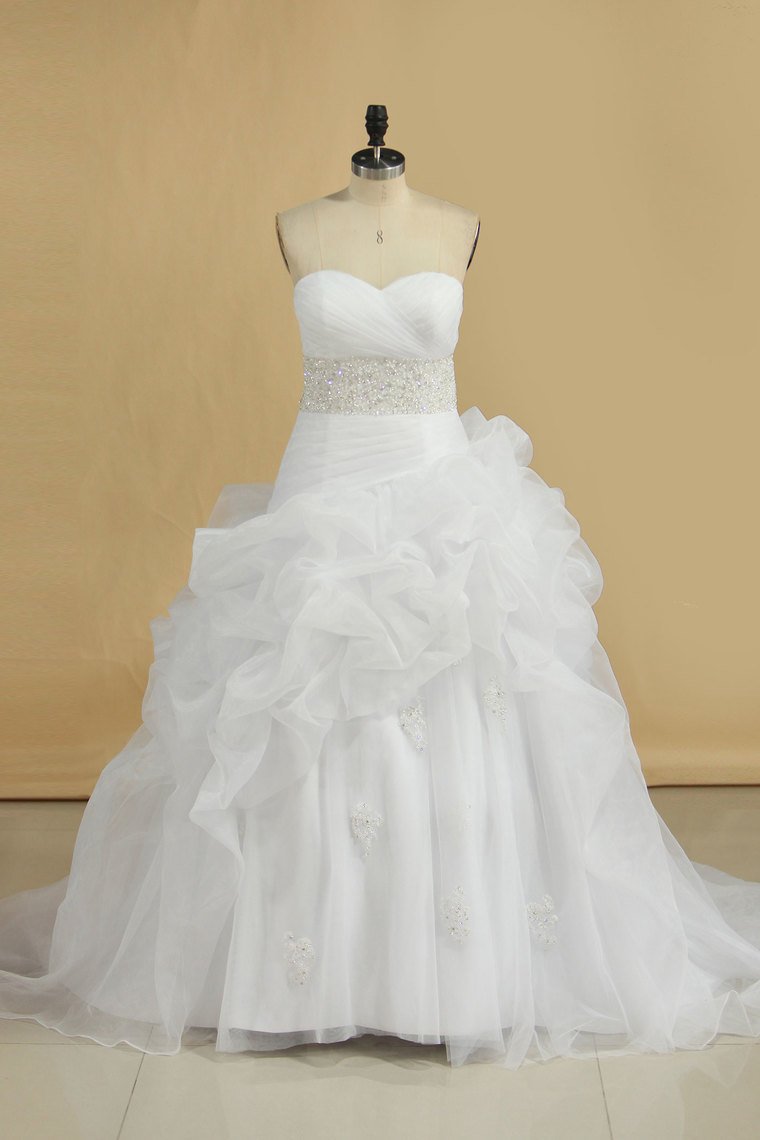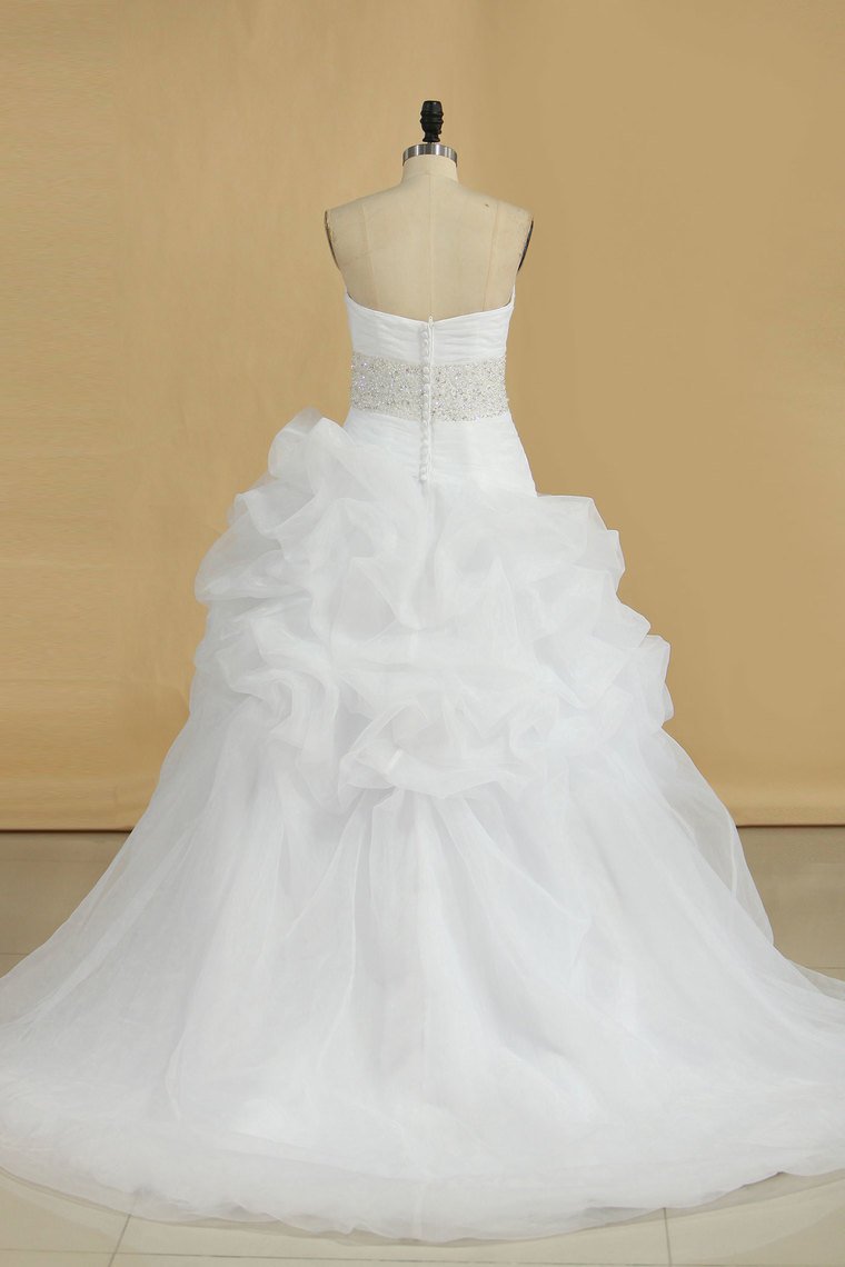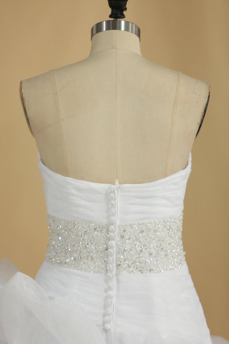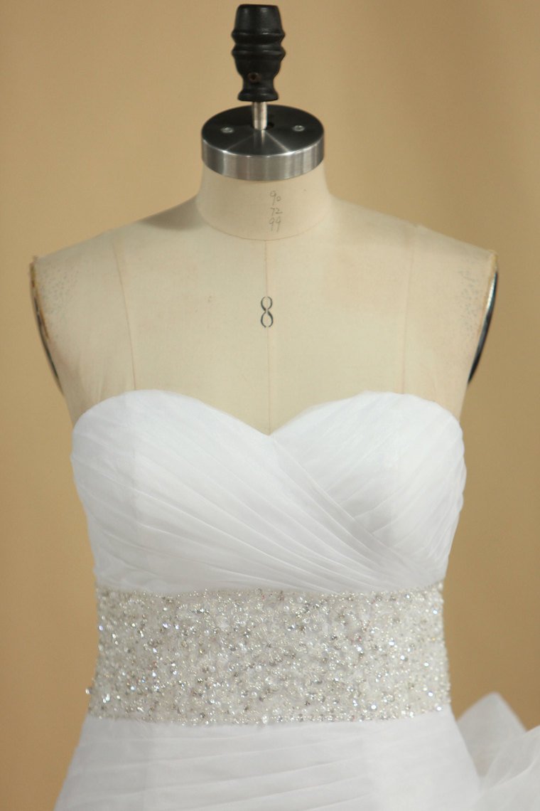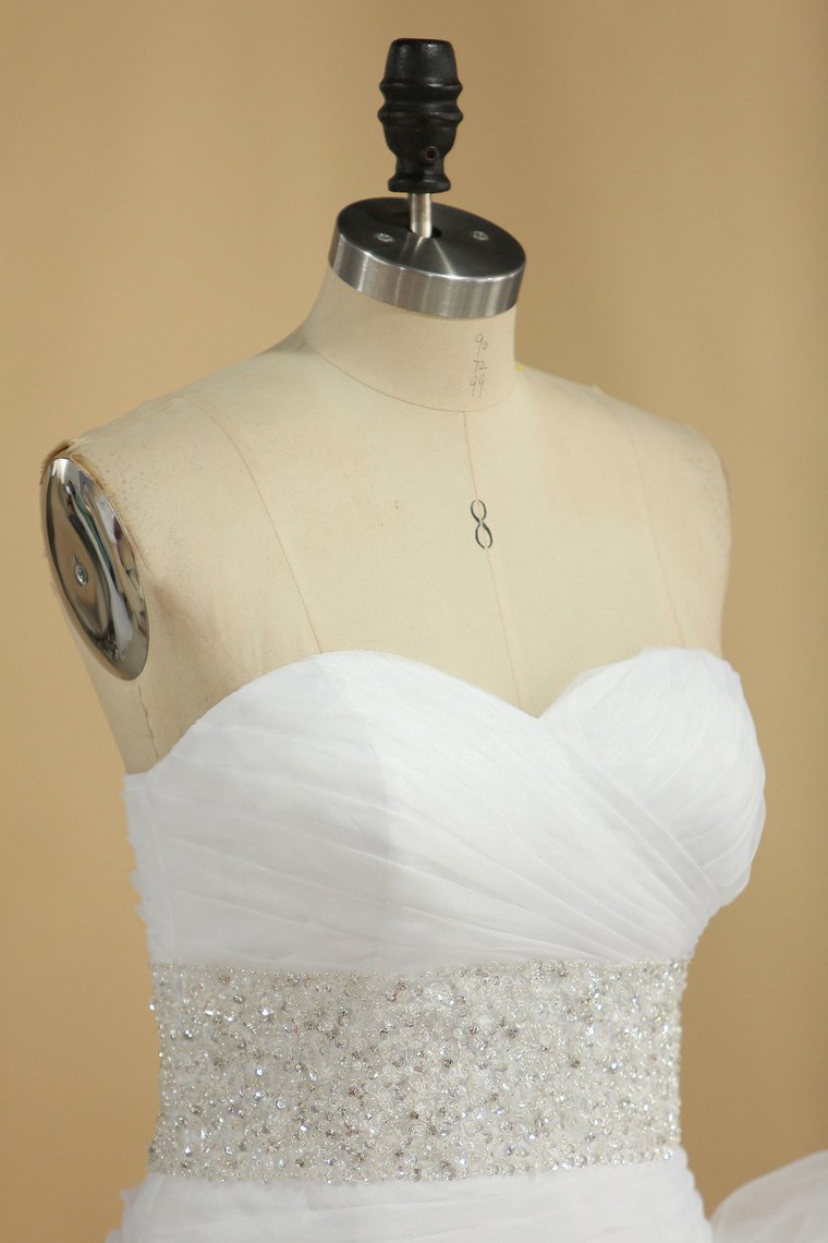 2024 A Line Wedding Dress Sweetheart Ruffles Court Train Beaded Belt Covered Buttons