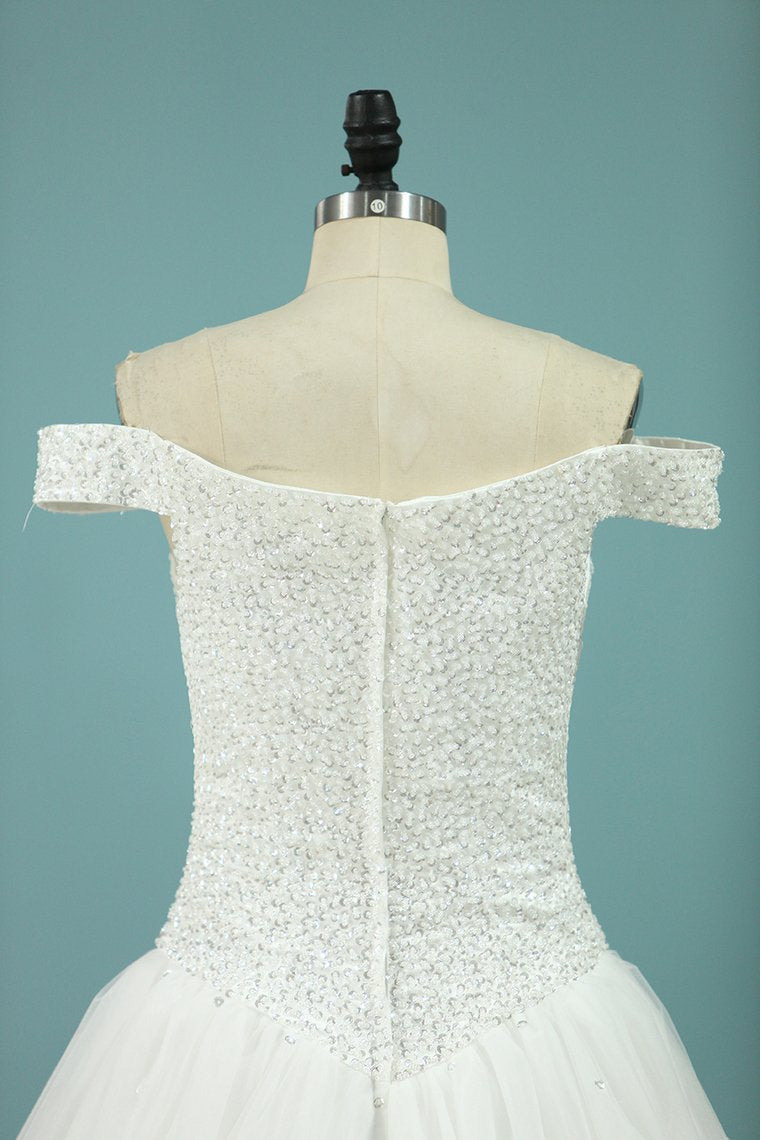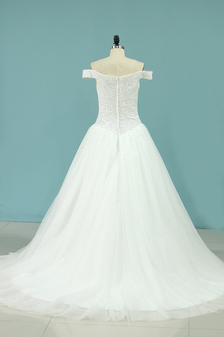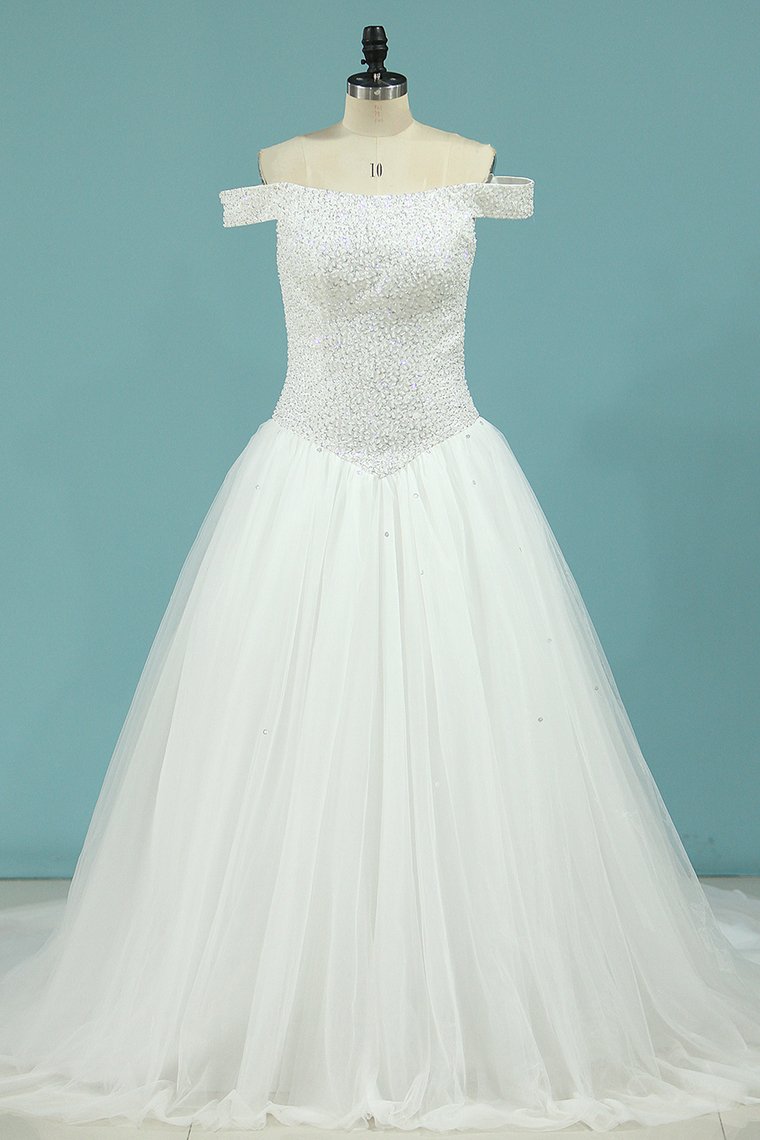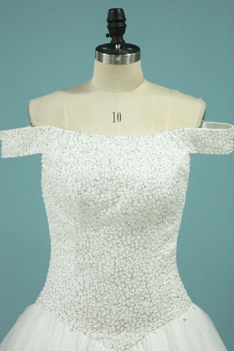 2024 A Line Wedding Dresses Boat Neck Beaded Bodice Chapel Train