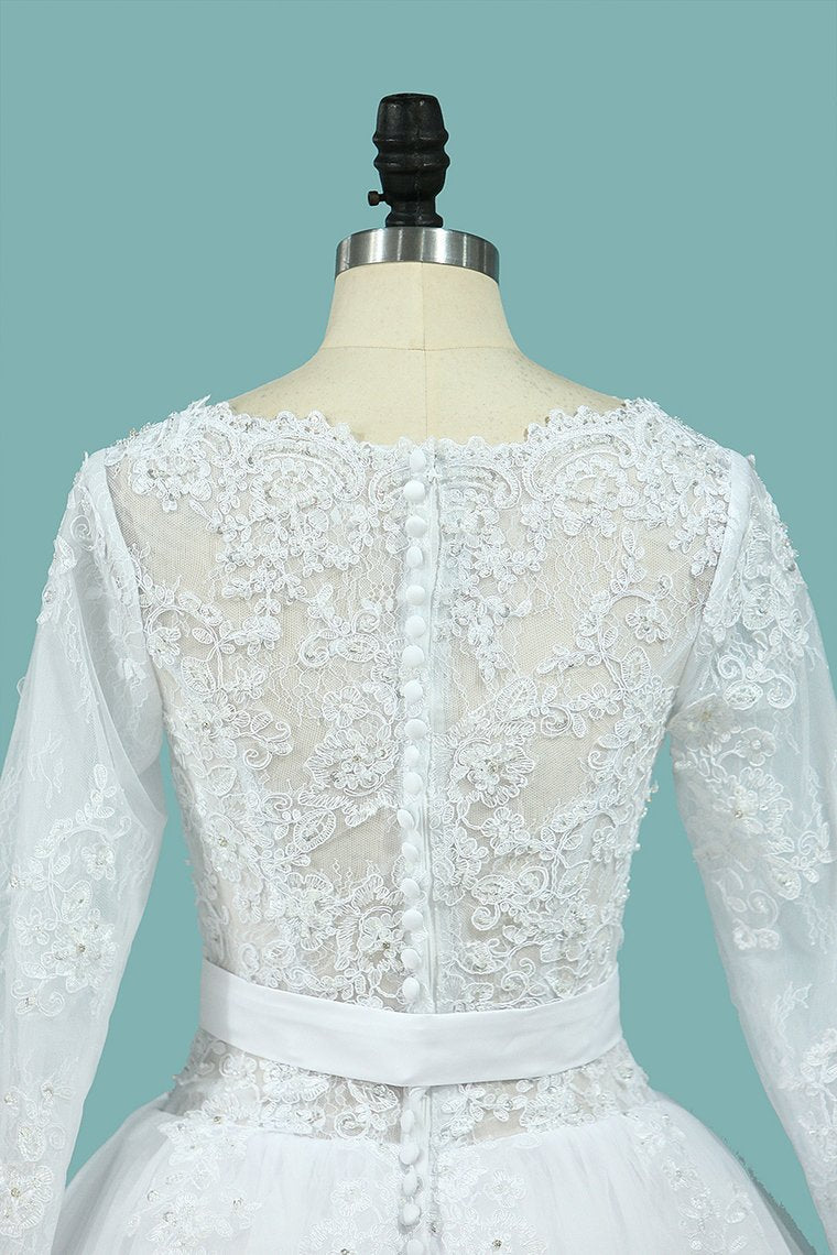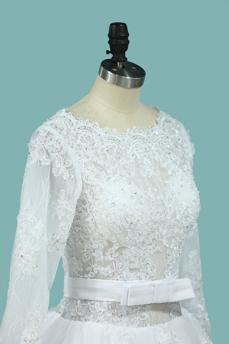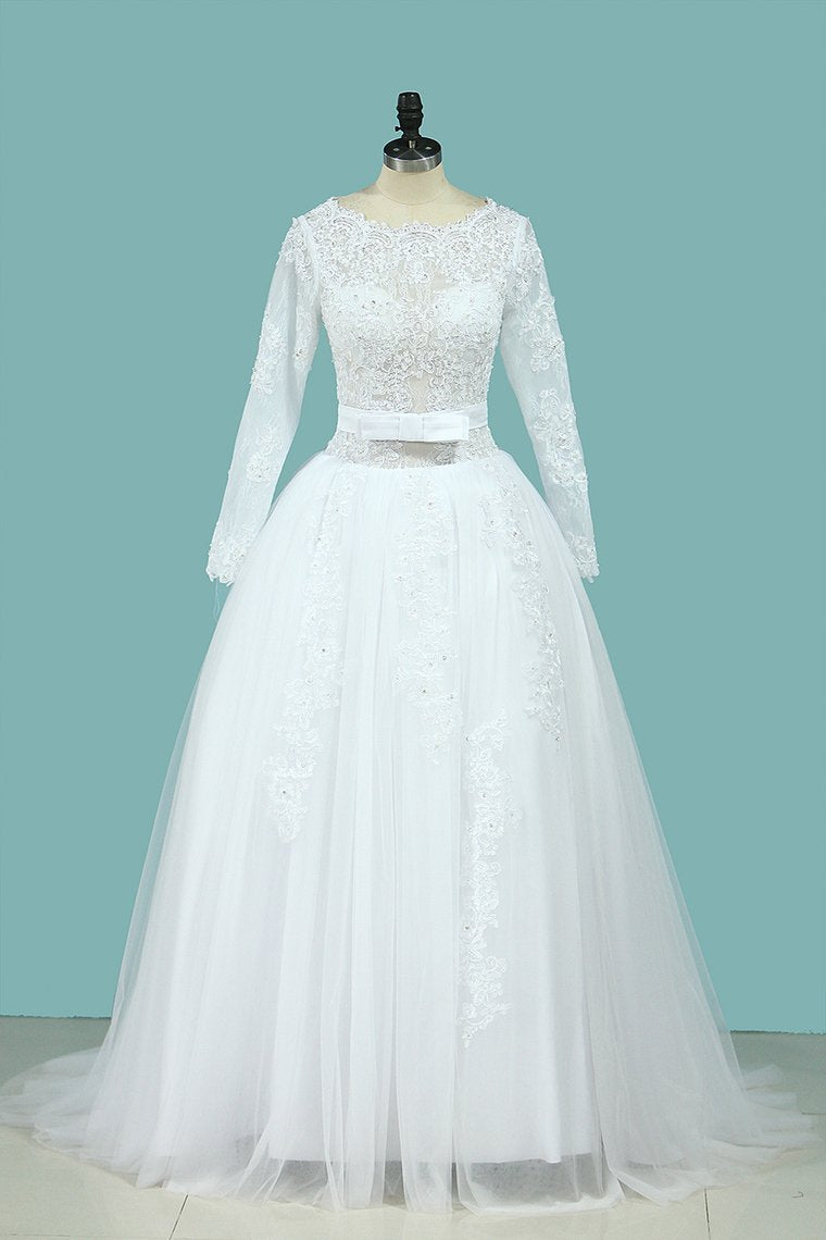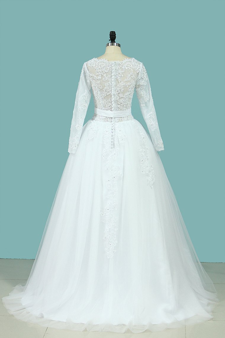 2024 A Line Wedding Dresses Long Sleeves Scoop With Applique Court Train