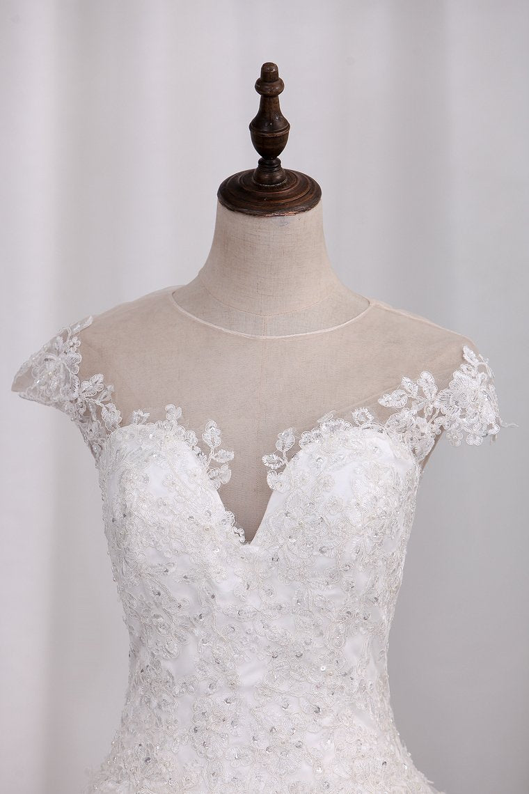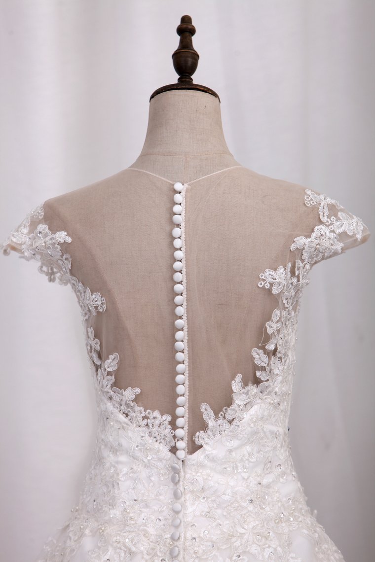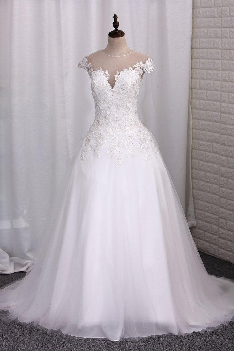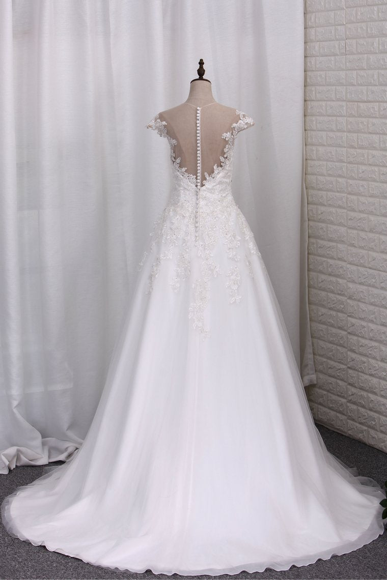 2024 A Line Wedding Dresses Scoop Tulle With Applique Court Train