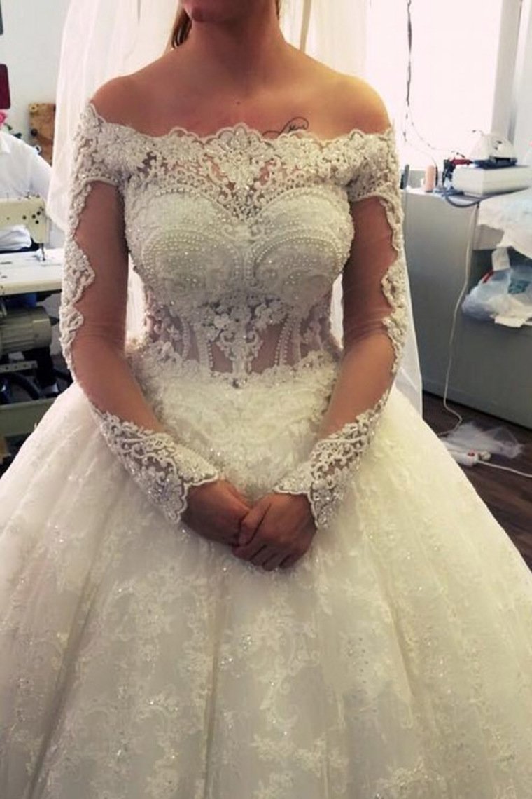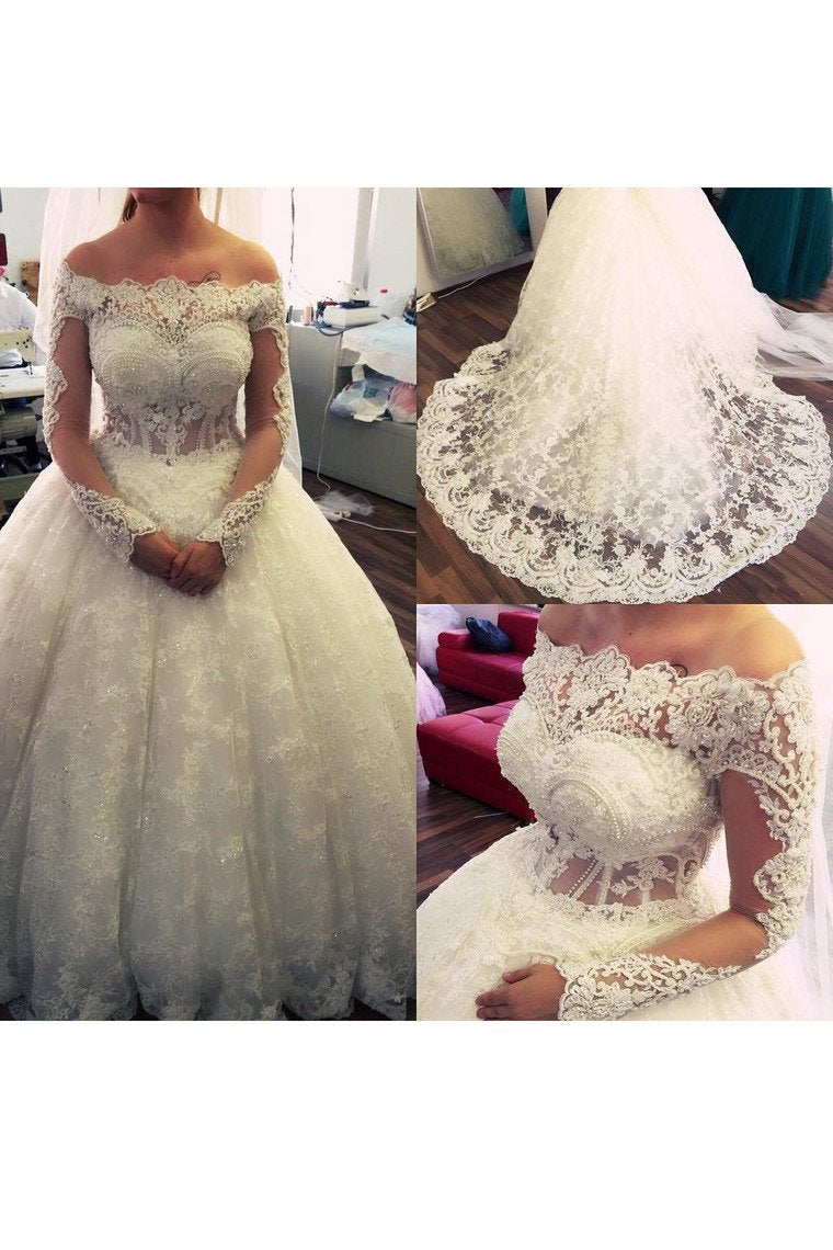 2024 Ball Gown Boat Neck Tulle With Applique And Beads Long Sleeves Wedding Dresses