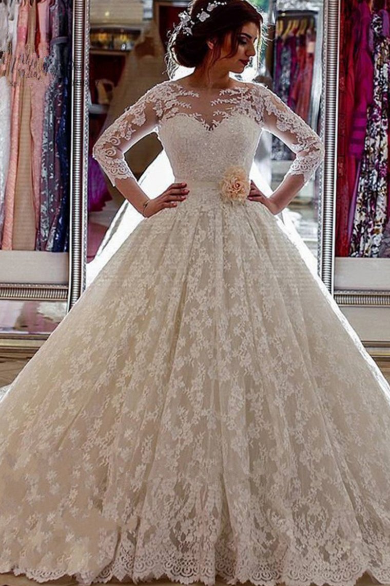 2024 Ball Gown Scoop 3/4 Length Sleeves Wedding Dresses Lace With Applique