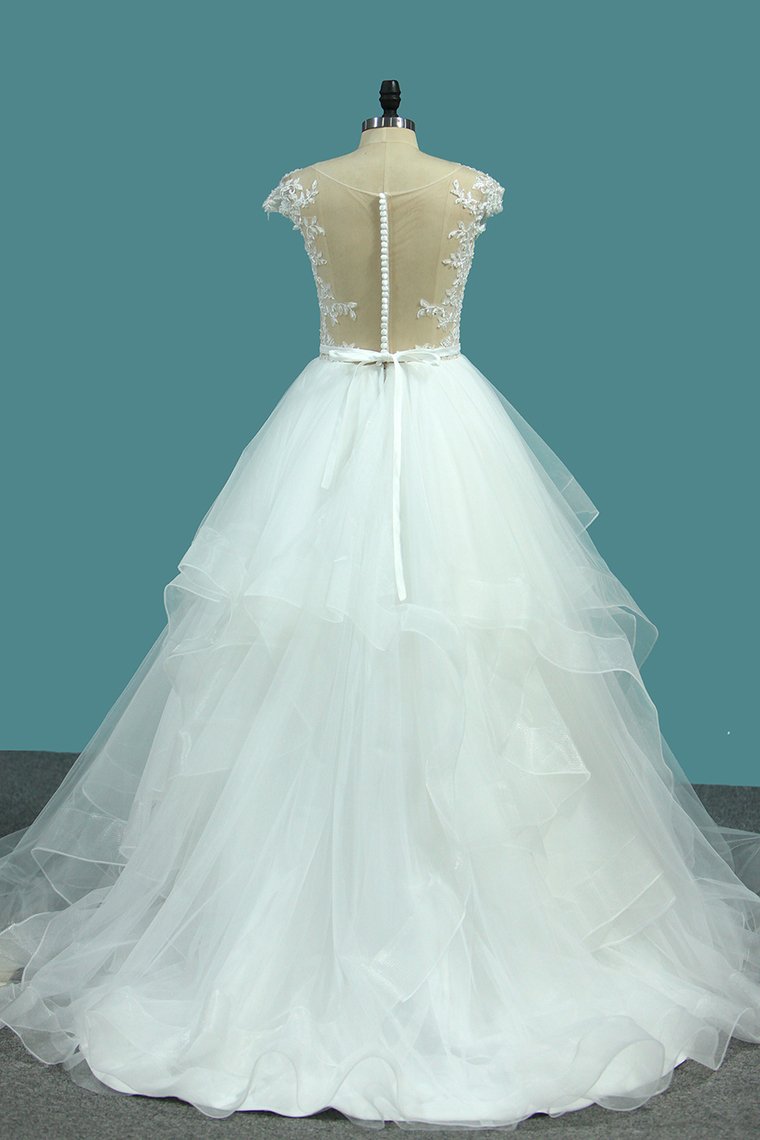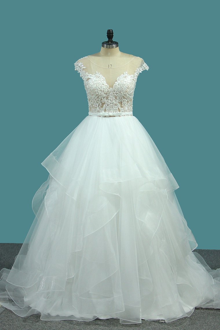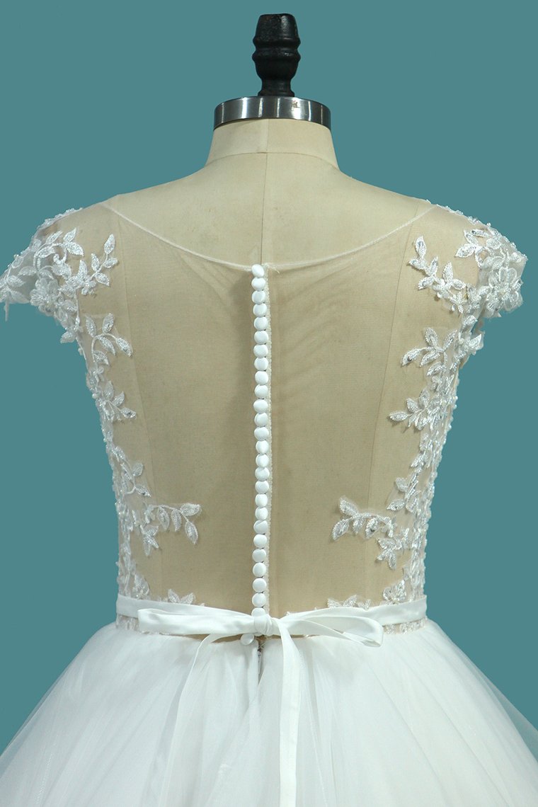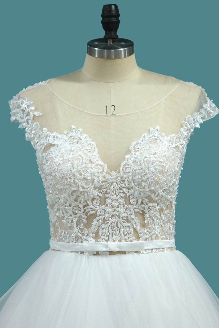 2024 Bateau A Line Tulle Wedding Dresses With Applique And Sash