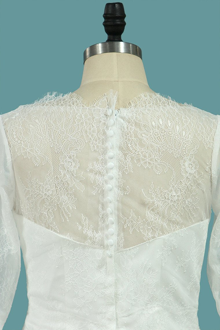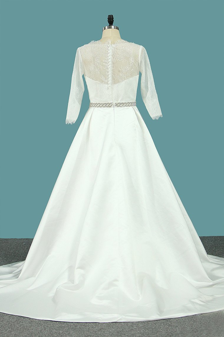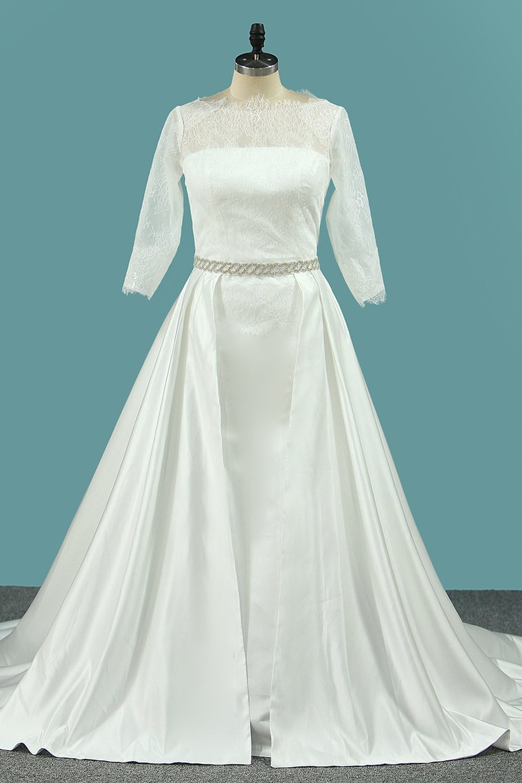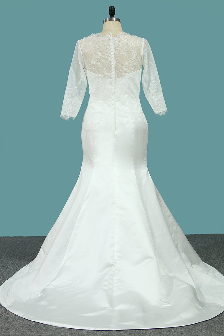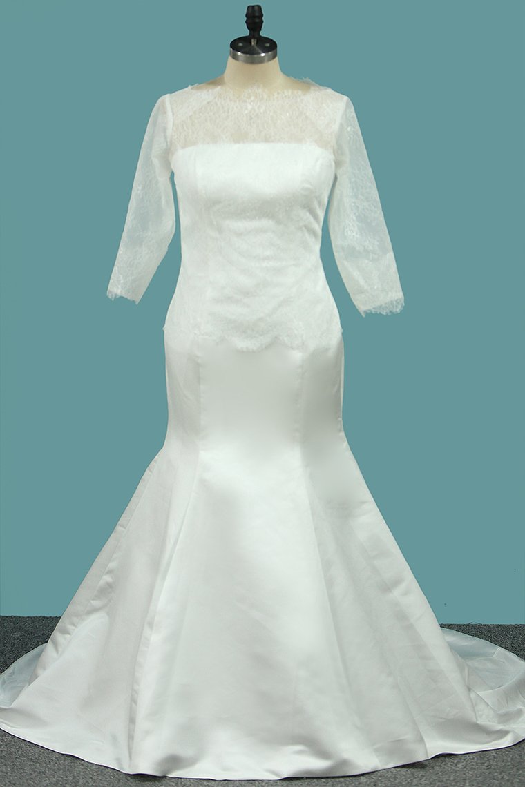 2024 Bateau Mermaid 3/4 Length Sleeves Satin Wedding Dresses Court Train Detachable