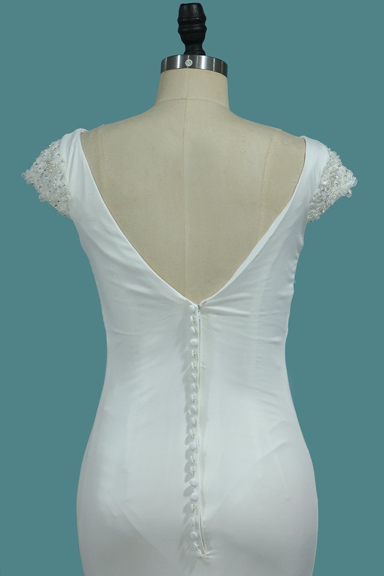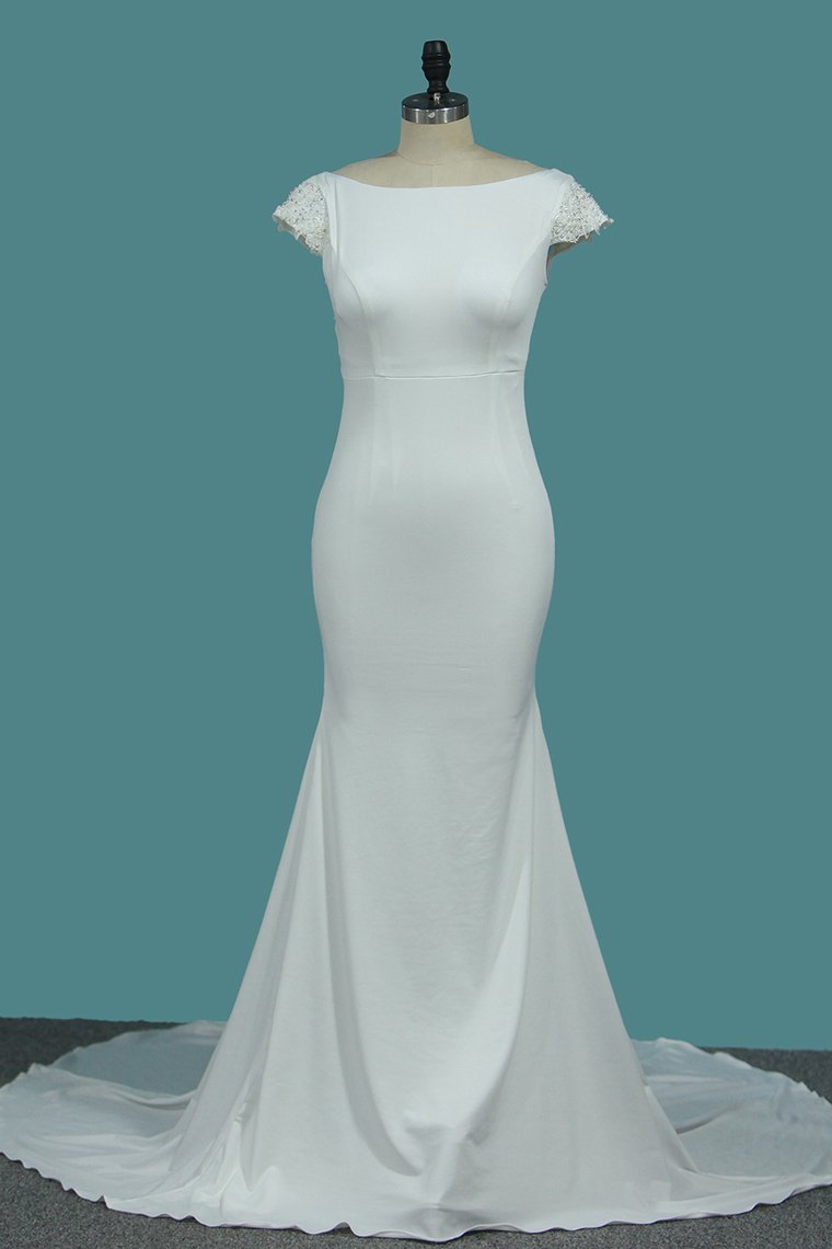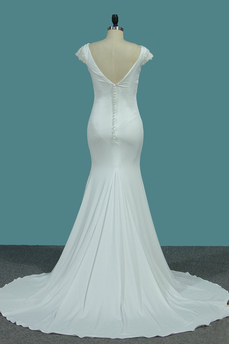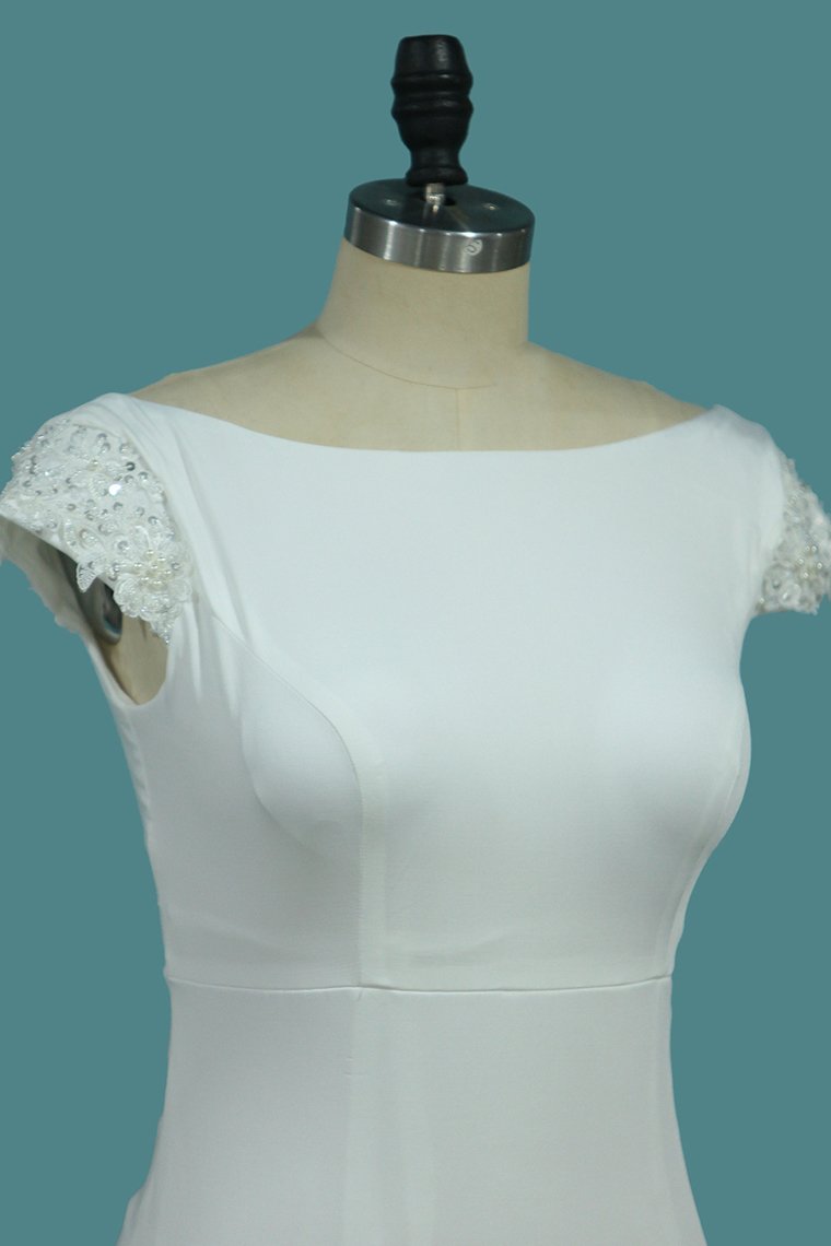 2024 Bateau Short Sleeves Wedding Dresses Open Back Spandex With Beading
