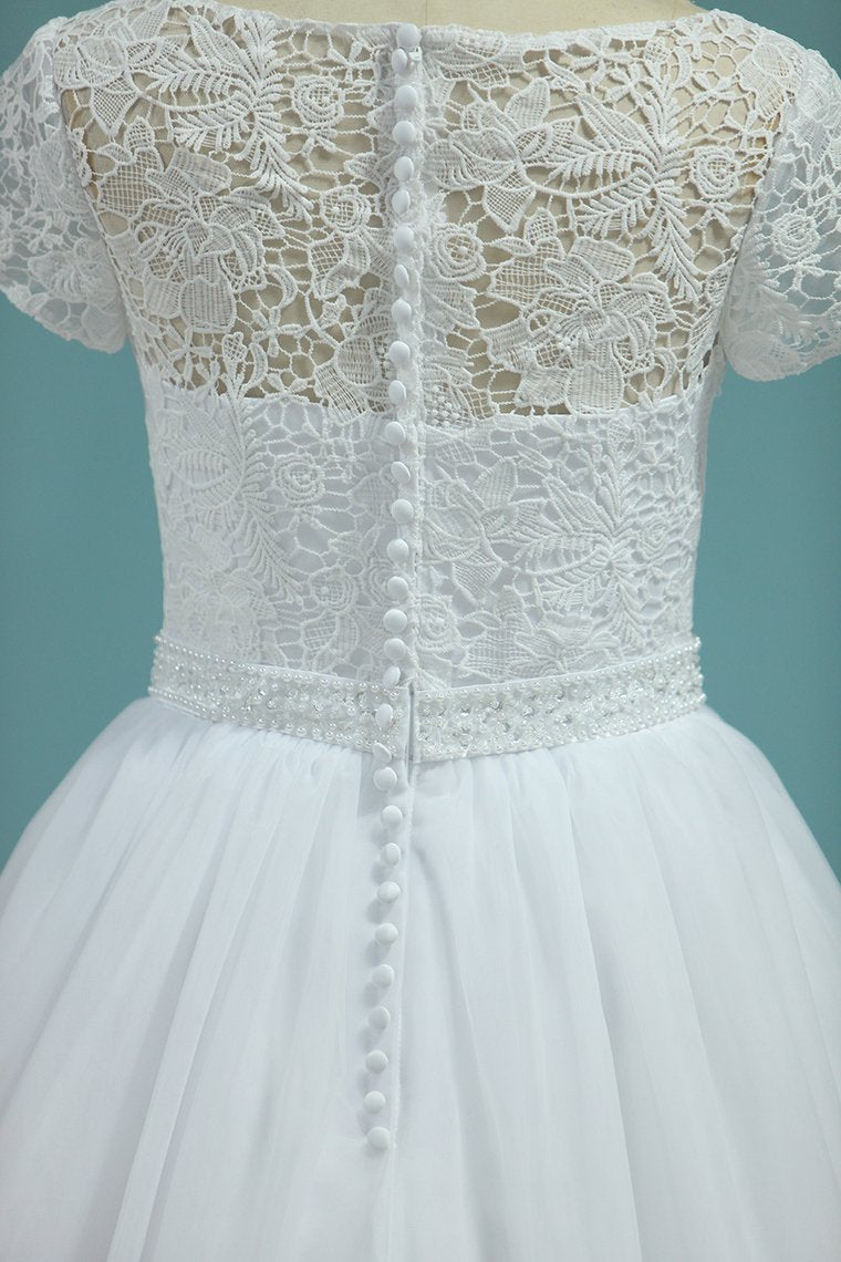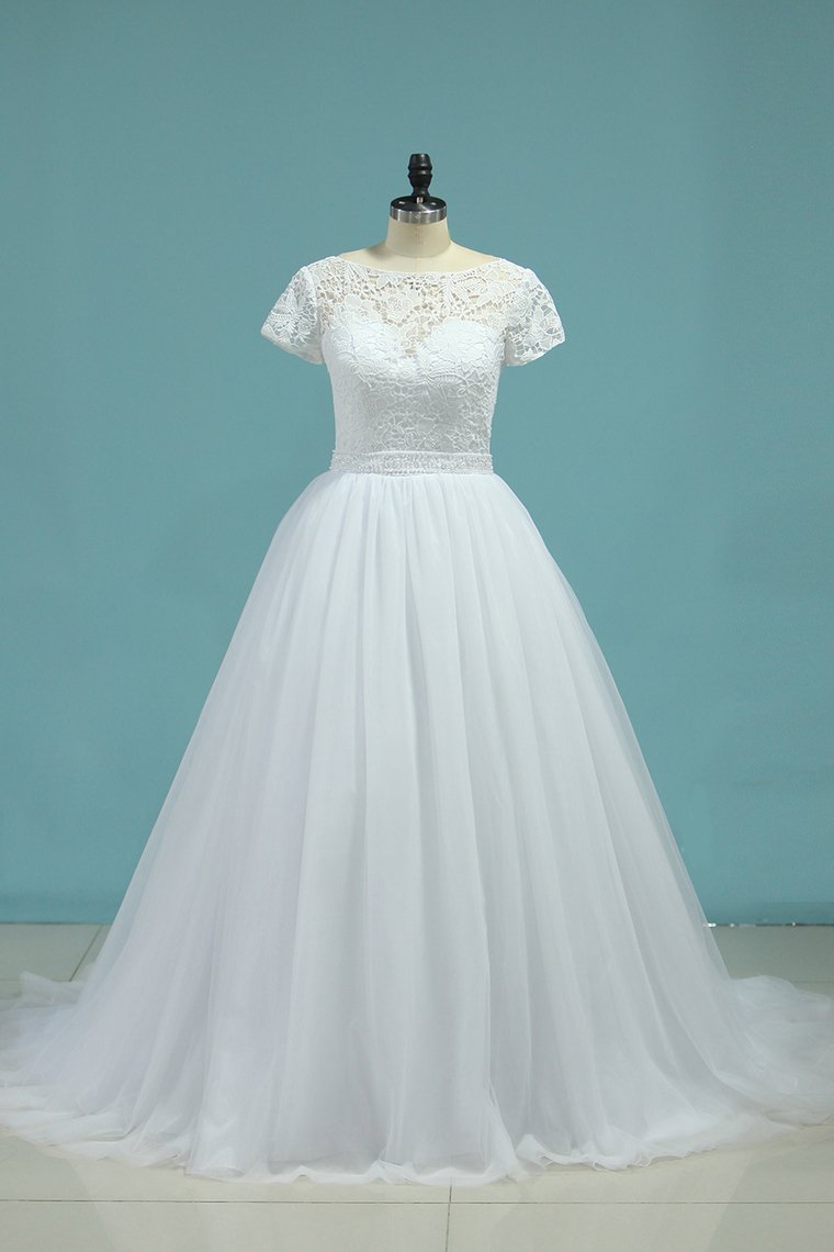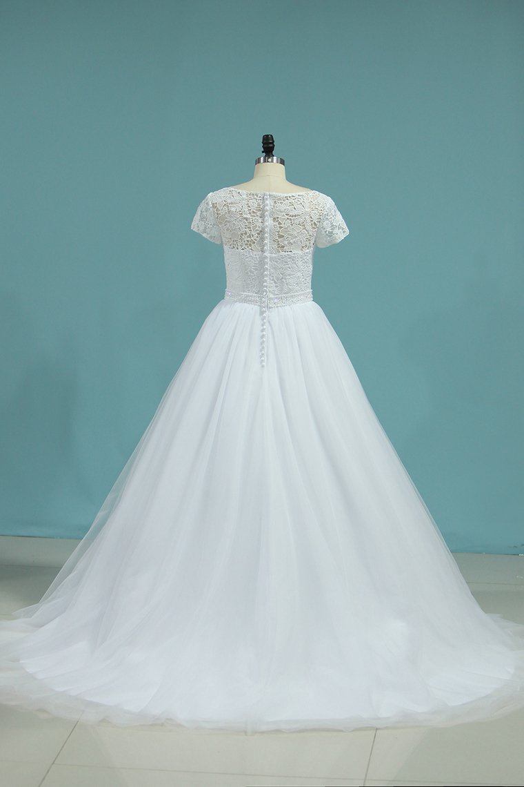 2024 Bateau Wedding Dresses A-Line Tulle Cap Sleeves Zipper Back Court Train