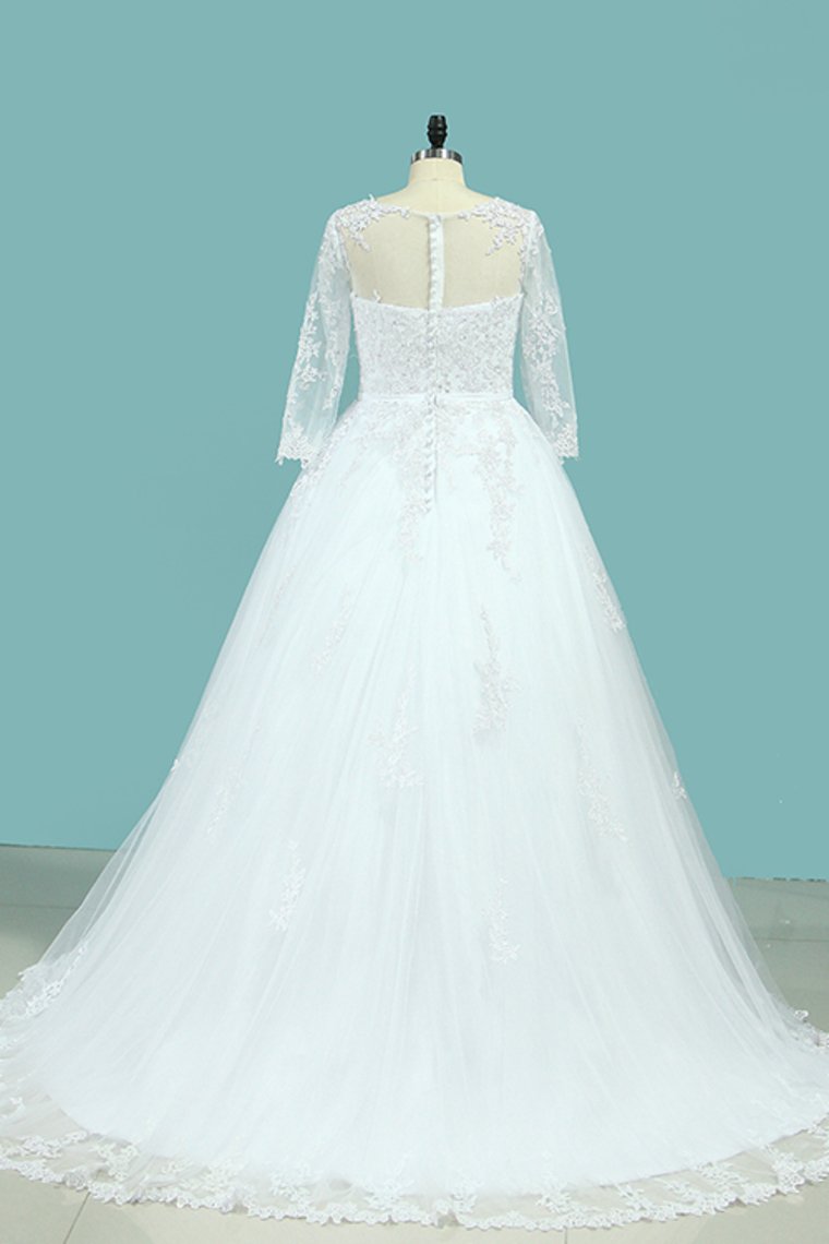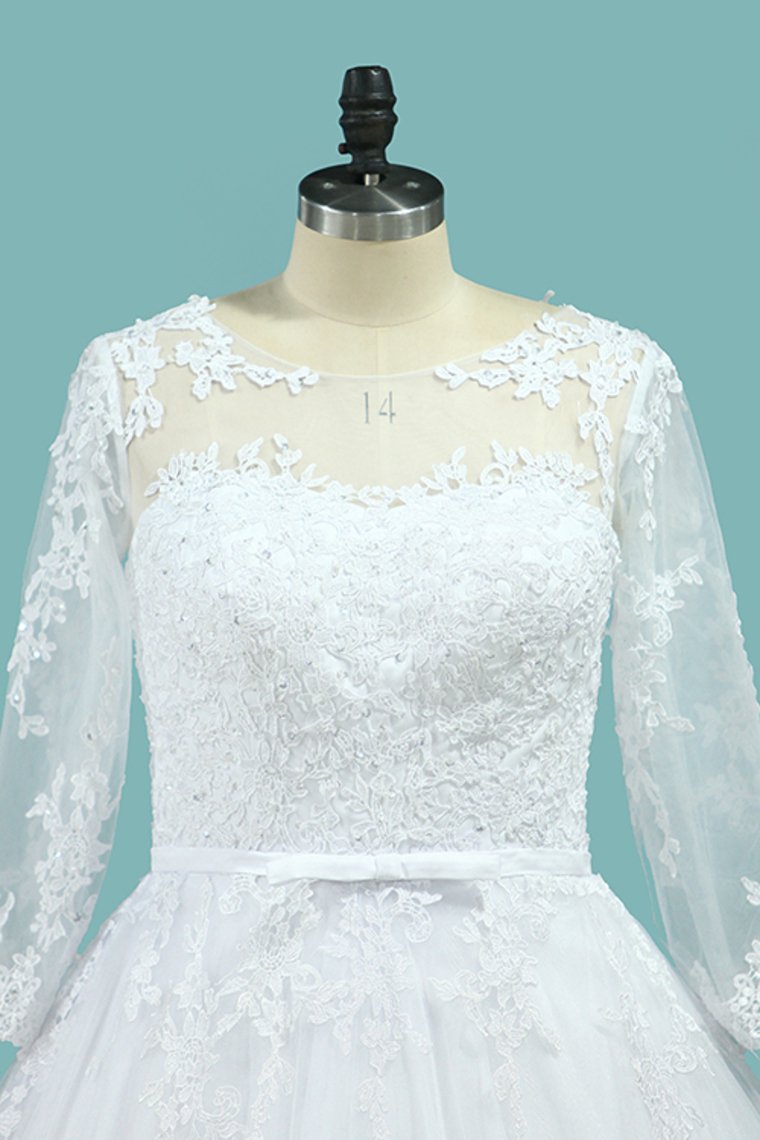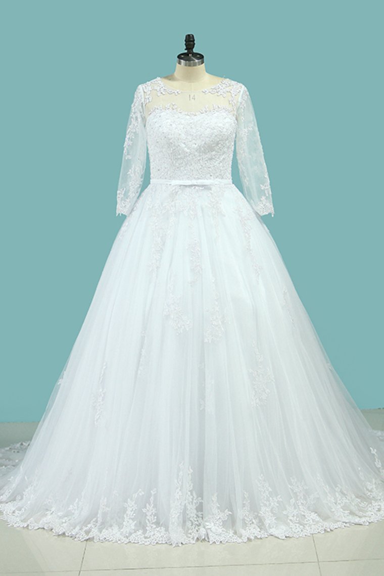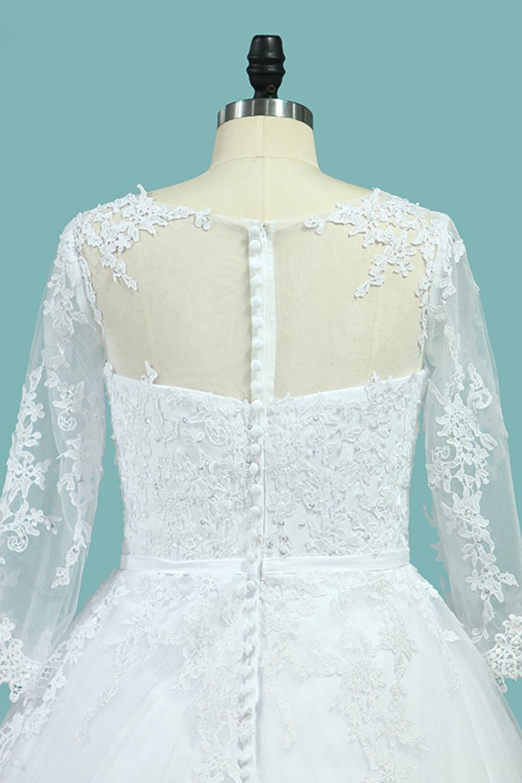 2024 Bateau Wedding Dresses Long Sleeves A Line Court Train Tulle With Applique