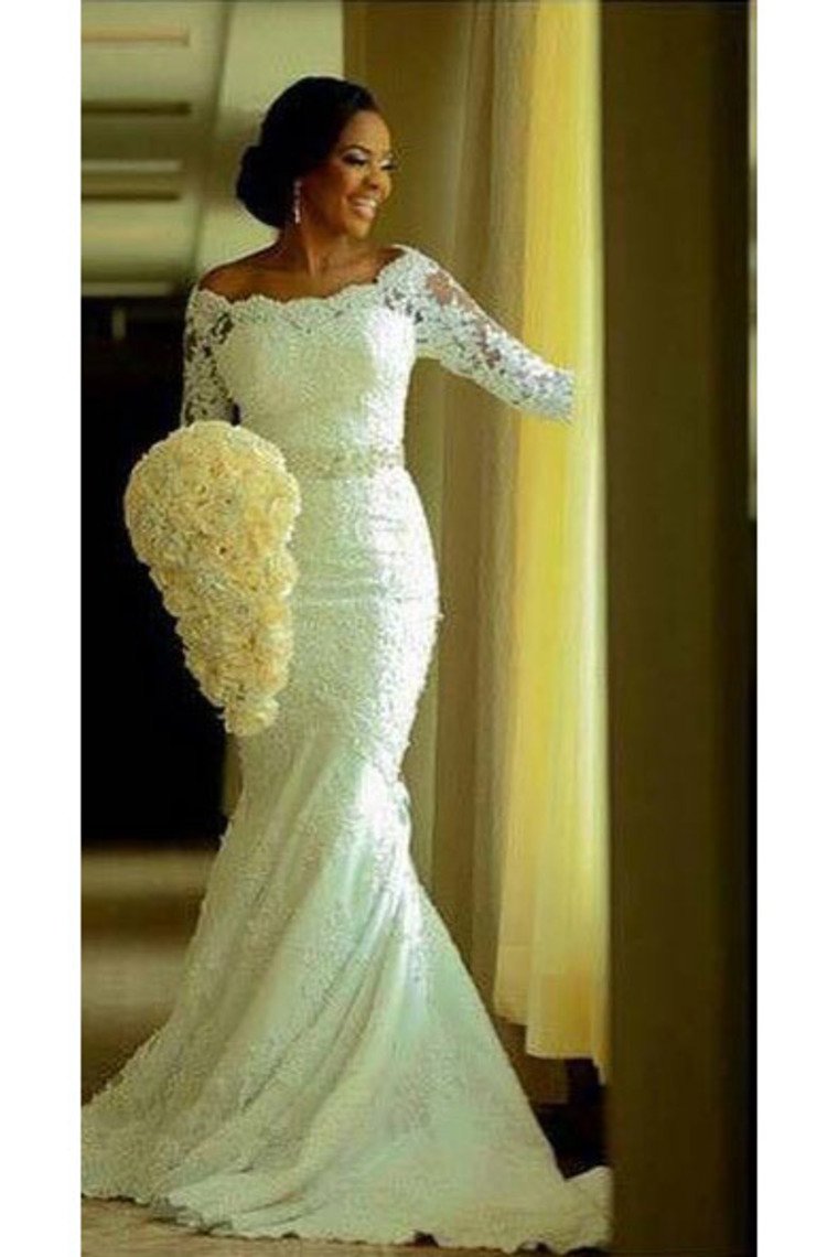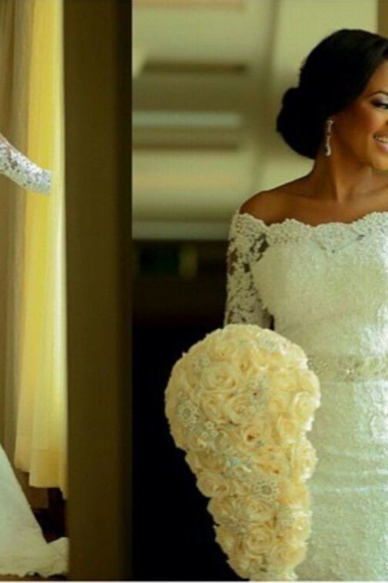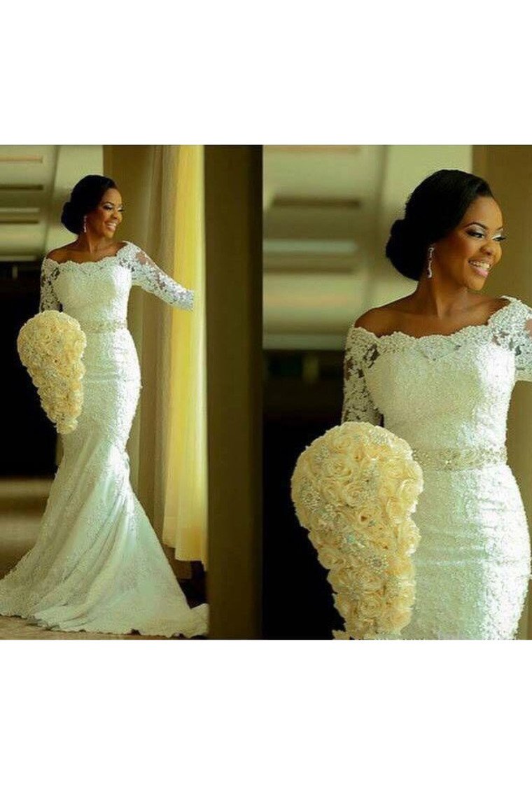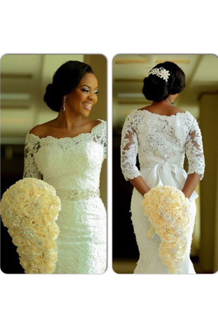 2024 Boat Neck 3/4 Length Sleeves Wedding Dresses Mermaid Tulle With Applique
