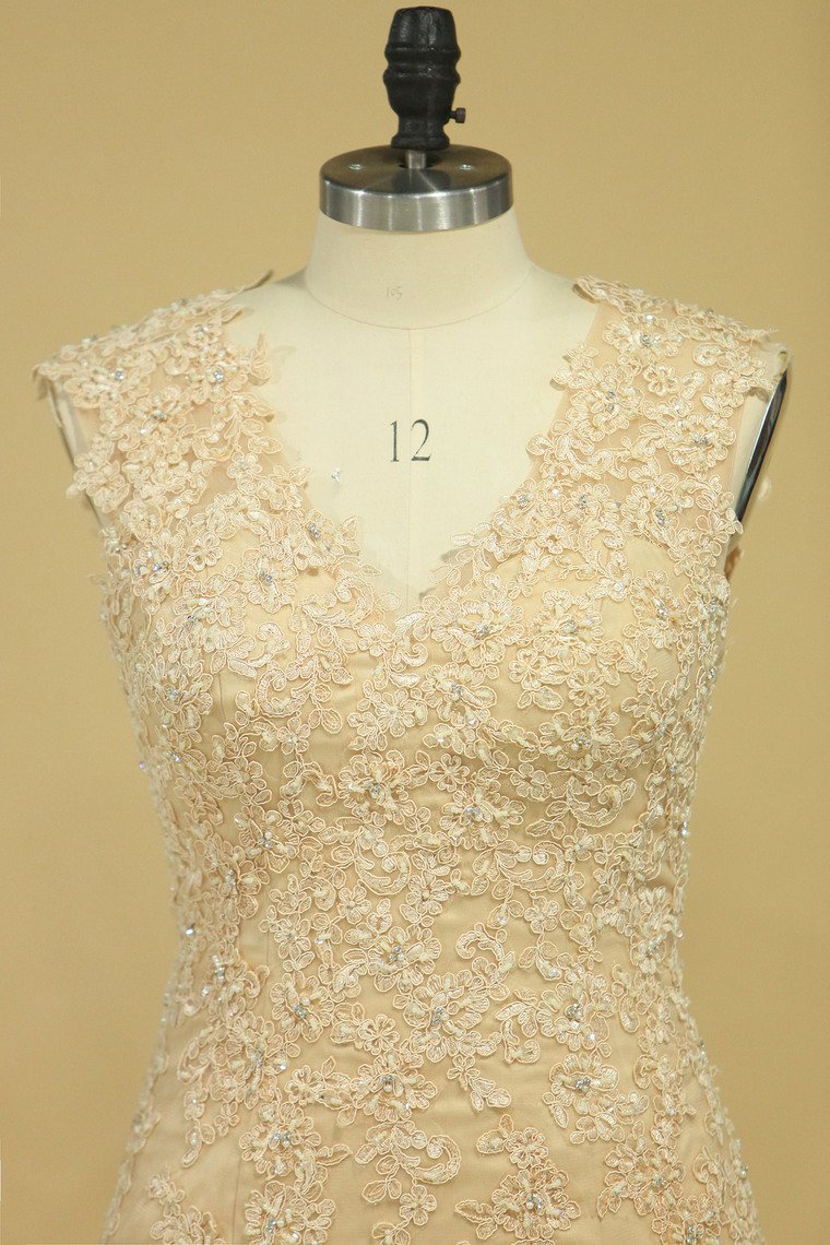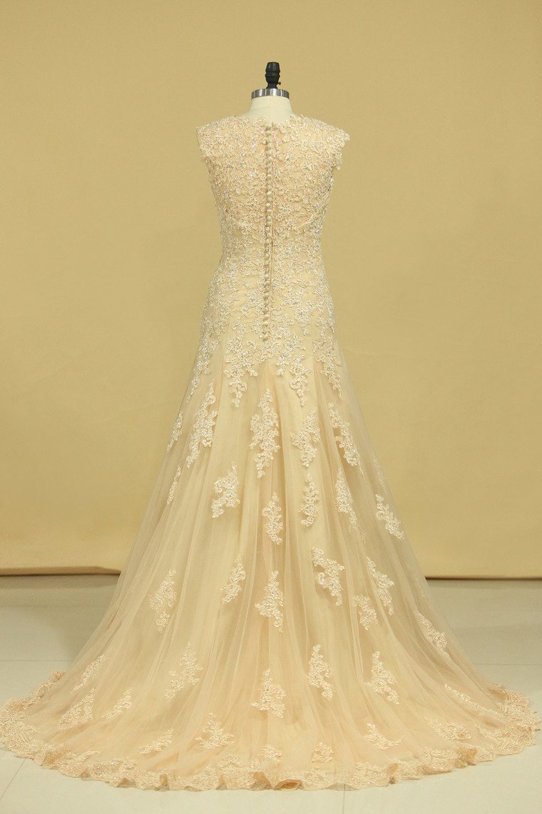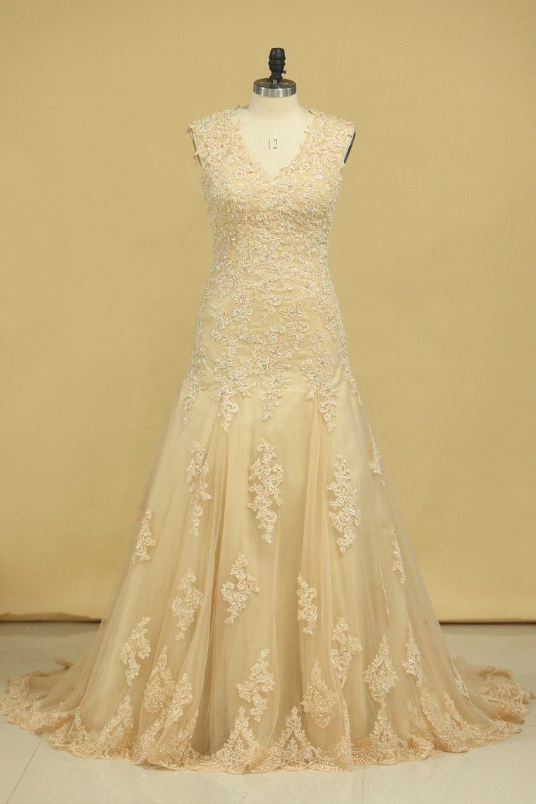 2024 Champagne V-Neck Wedding Dresses A Line Court Train With Applique