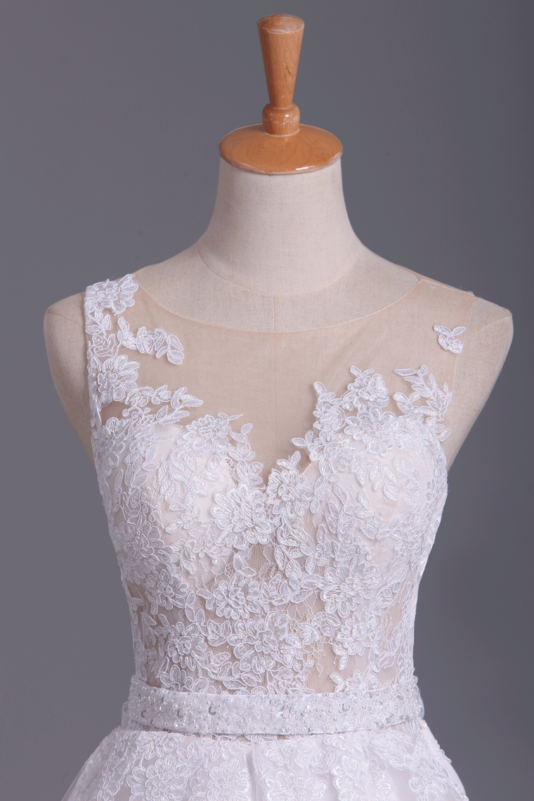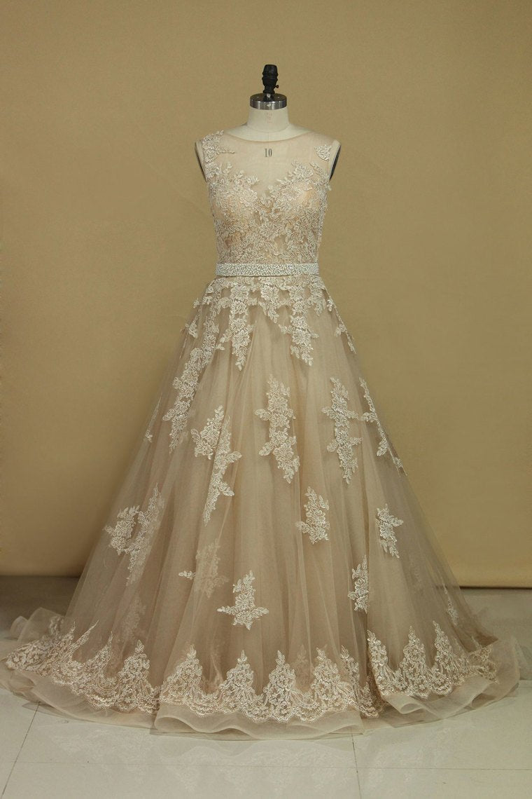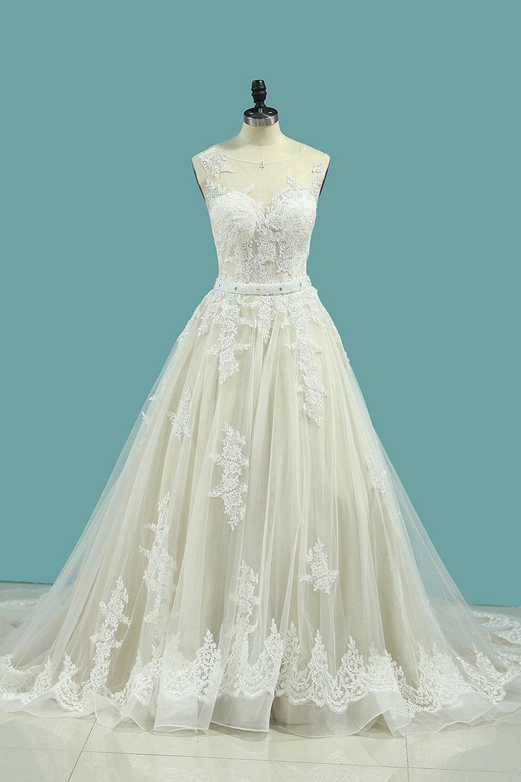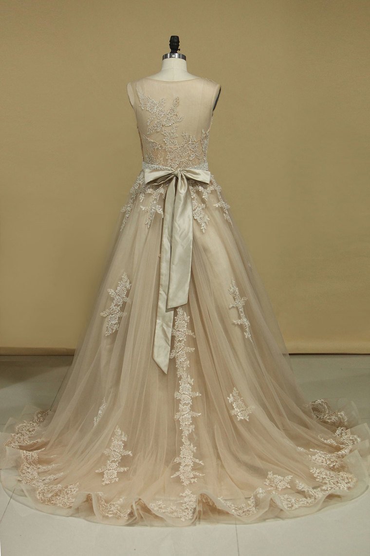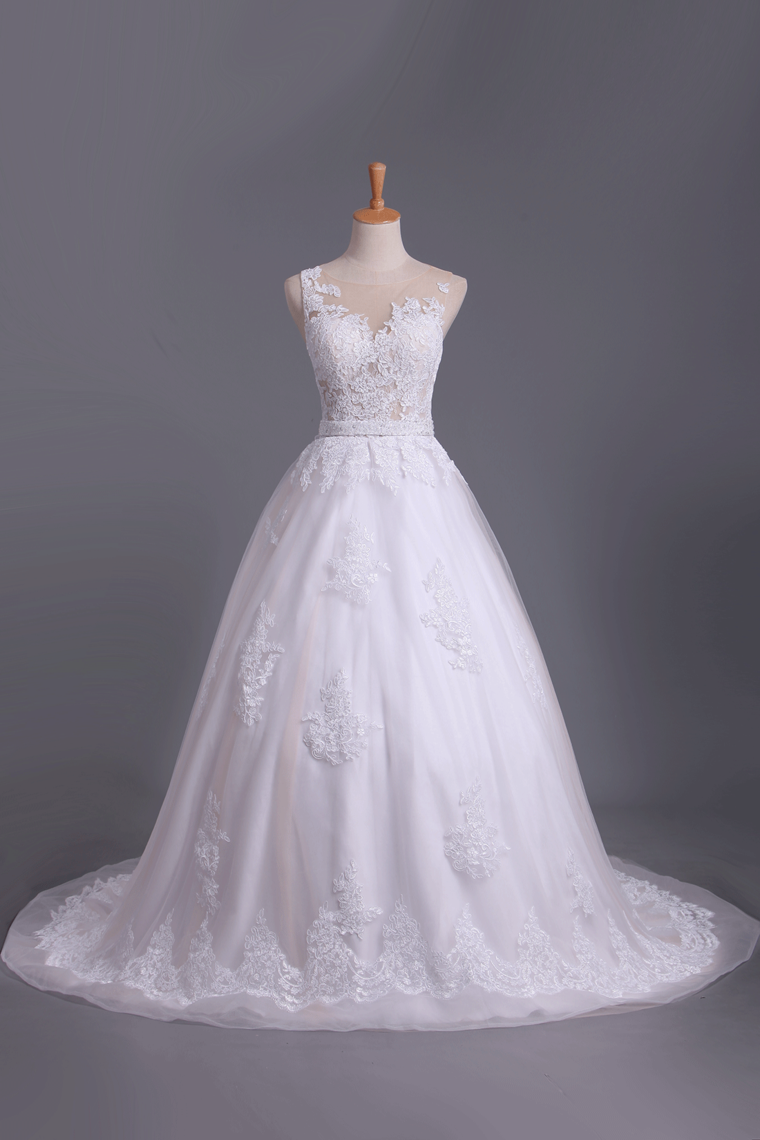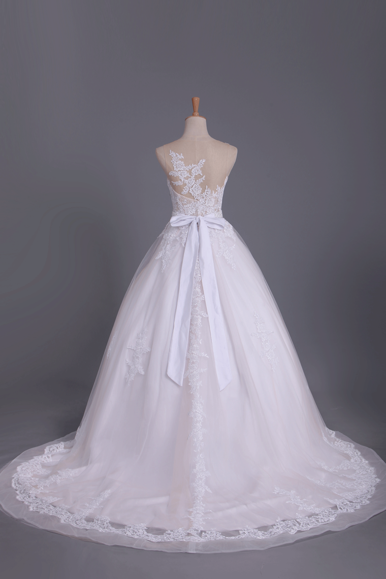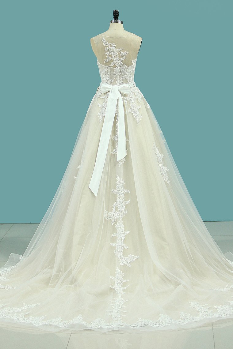 2024 Chapel Train Wedding Dresses Bateau Tulle With Applique And Sash A Line