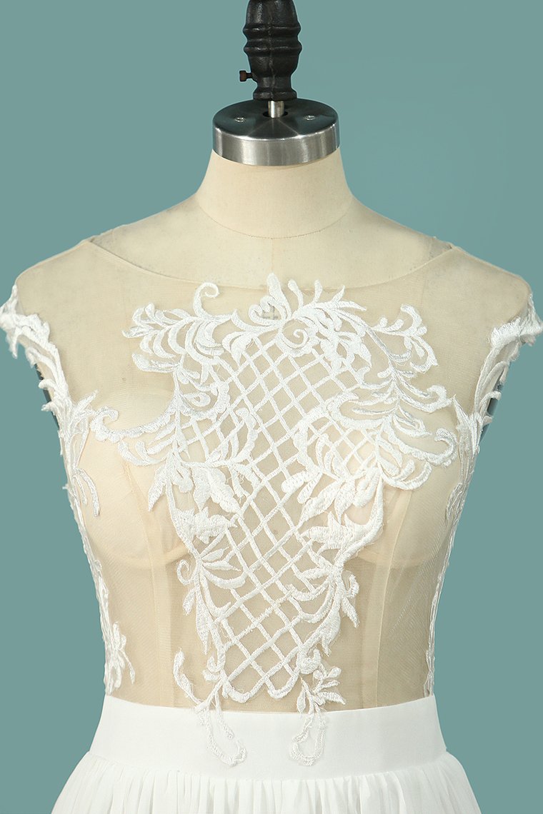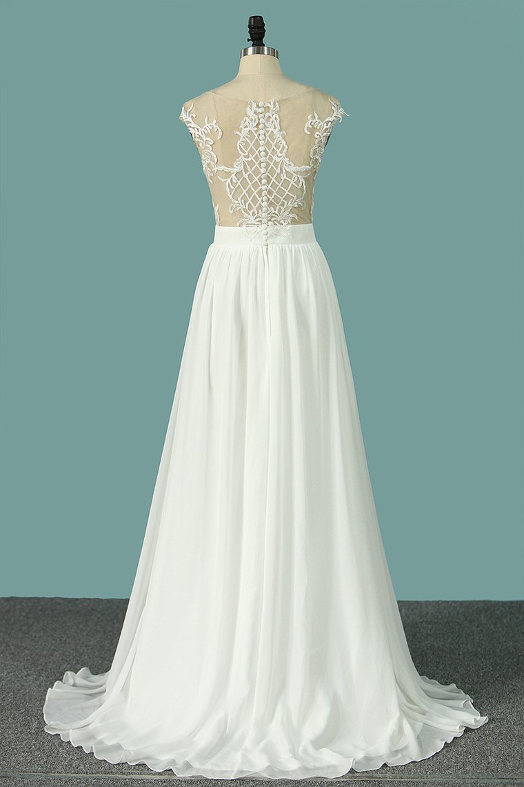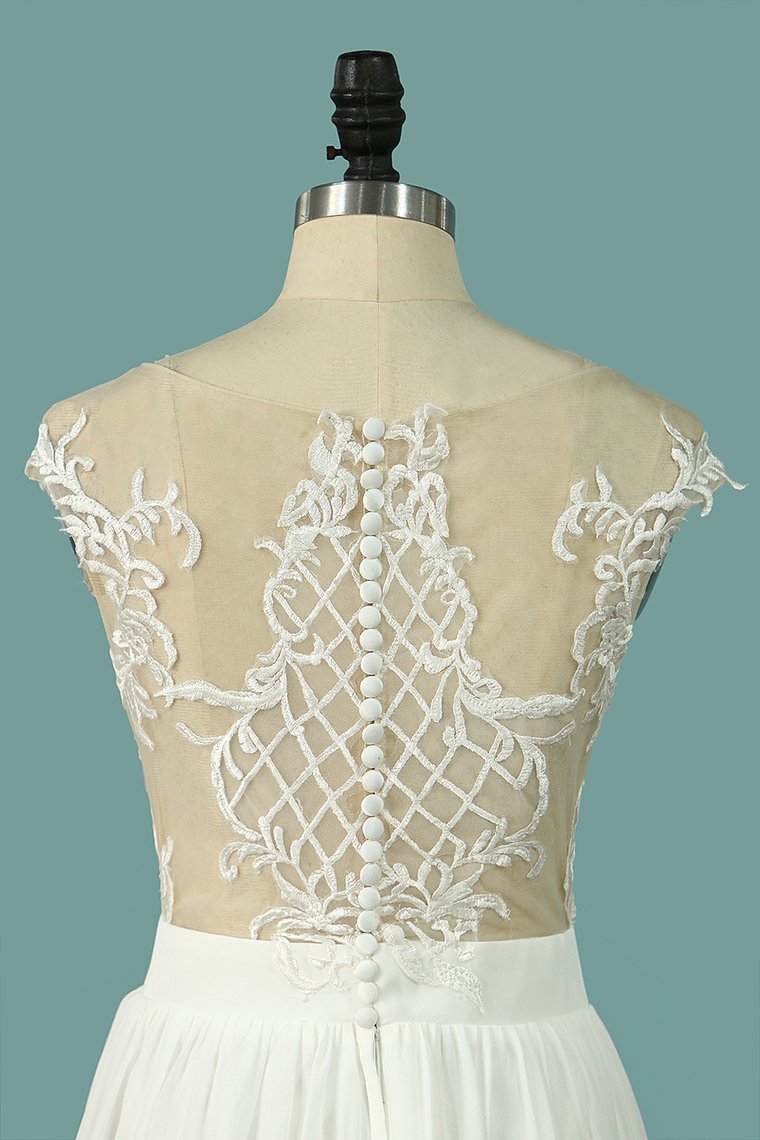 2024 Chiffon Wedding Dresses Scoop Cap Sleeves With Applique And Slit