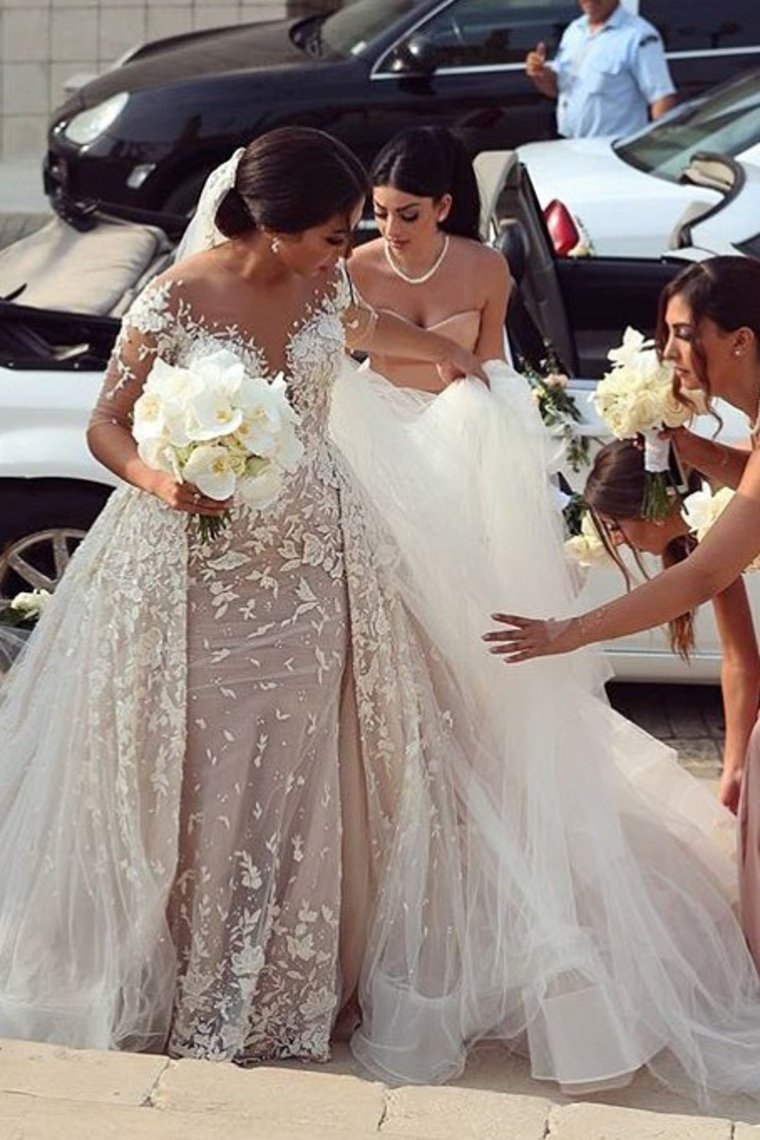 2024 Detachable Train Wedding Dresses Scoop Sheath Tulle With Applique