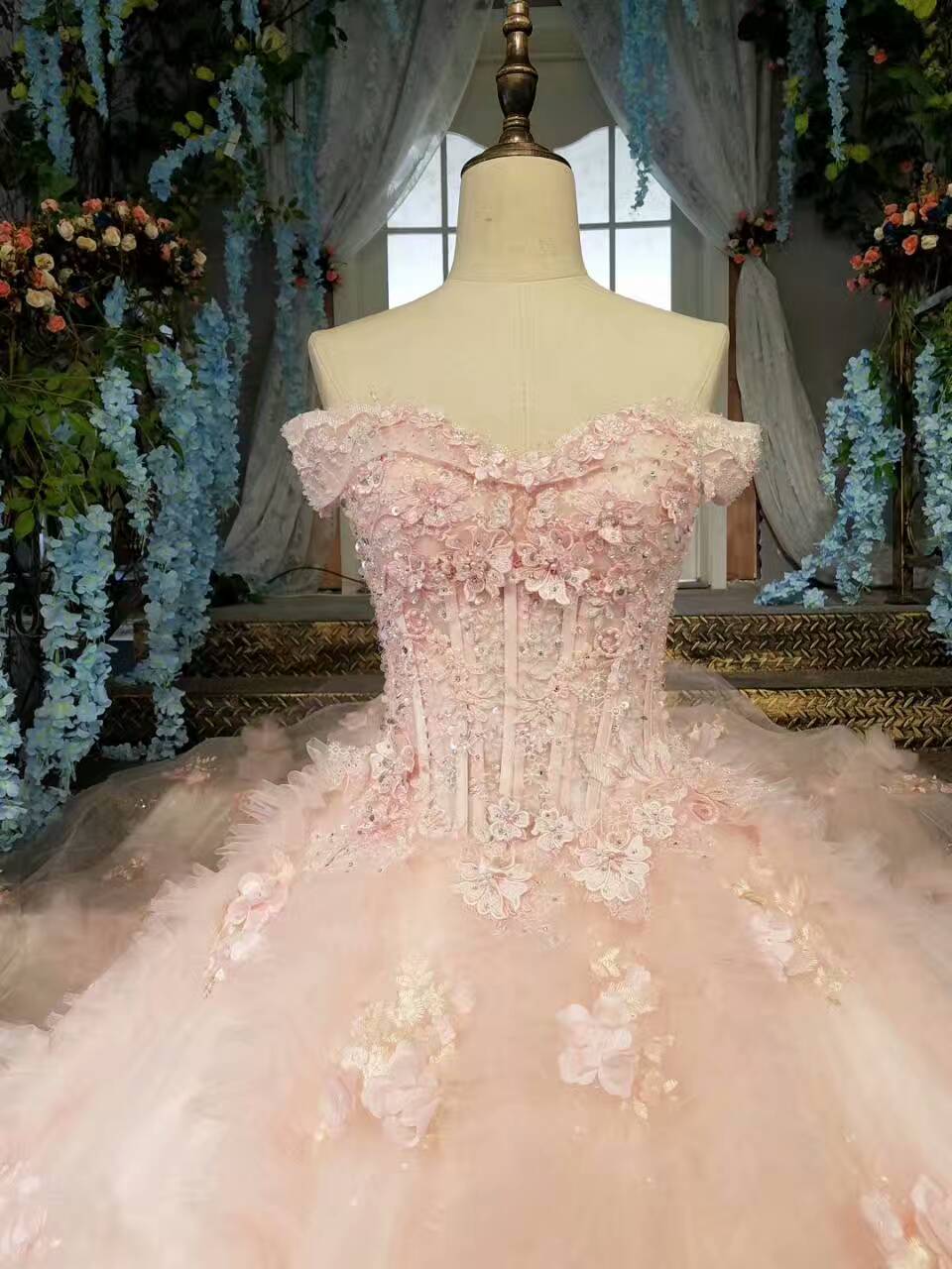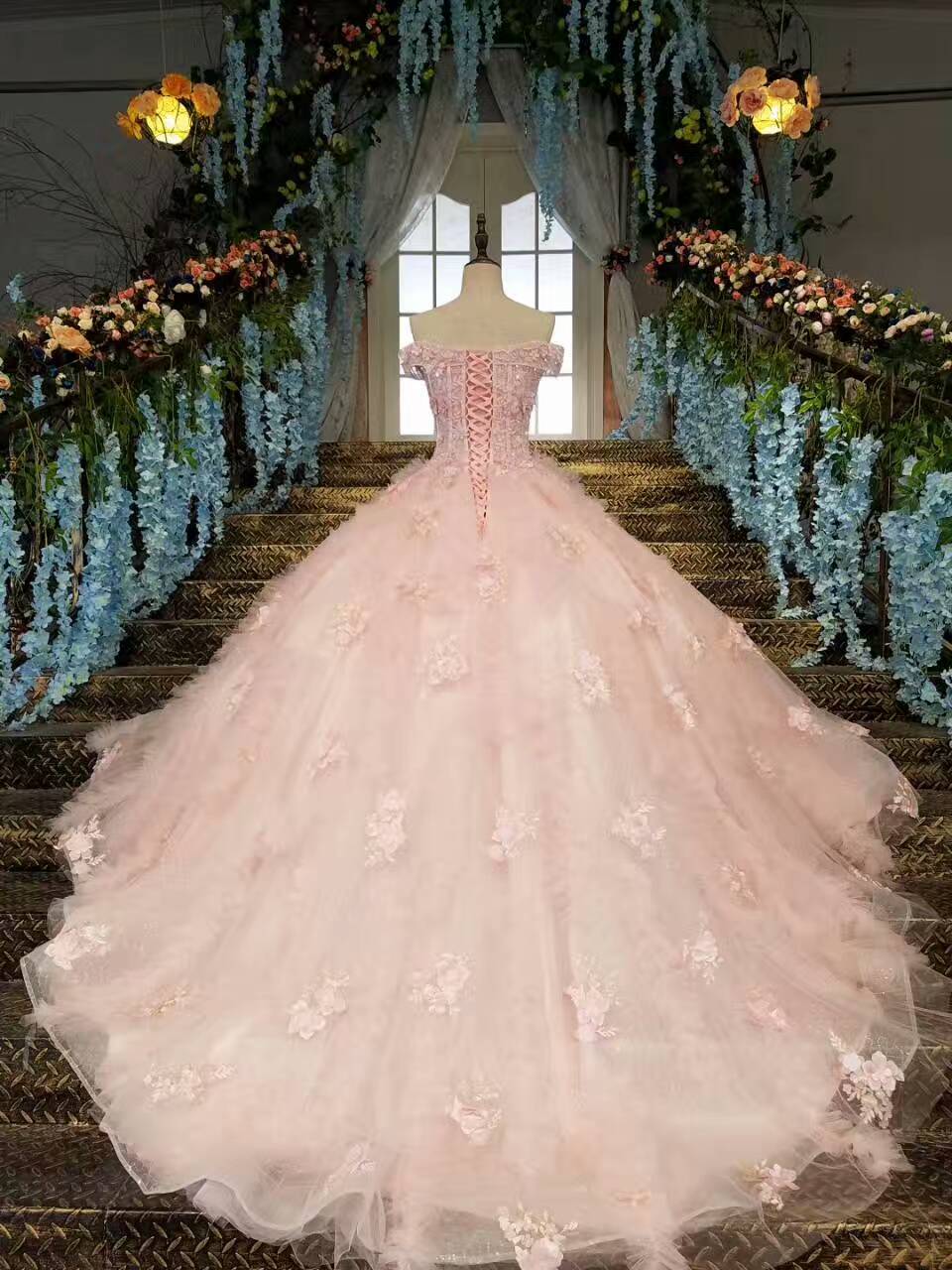 2024 Fantastic Pink Wedding Dresses Lace Up With Beads And Handmade Flowers Ball Gown