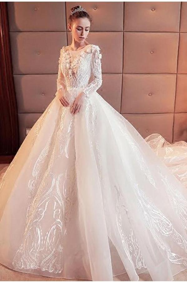 2024 Gorgeous Scoop Lace Appliques Flowers White Organza Long Sleeve Wedding Dresses RS177