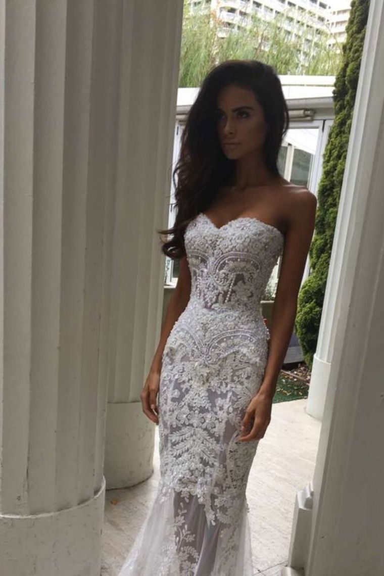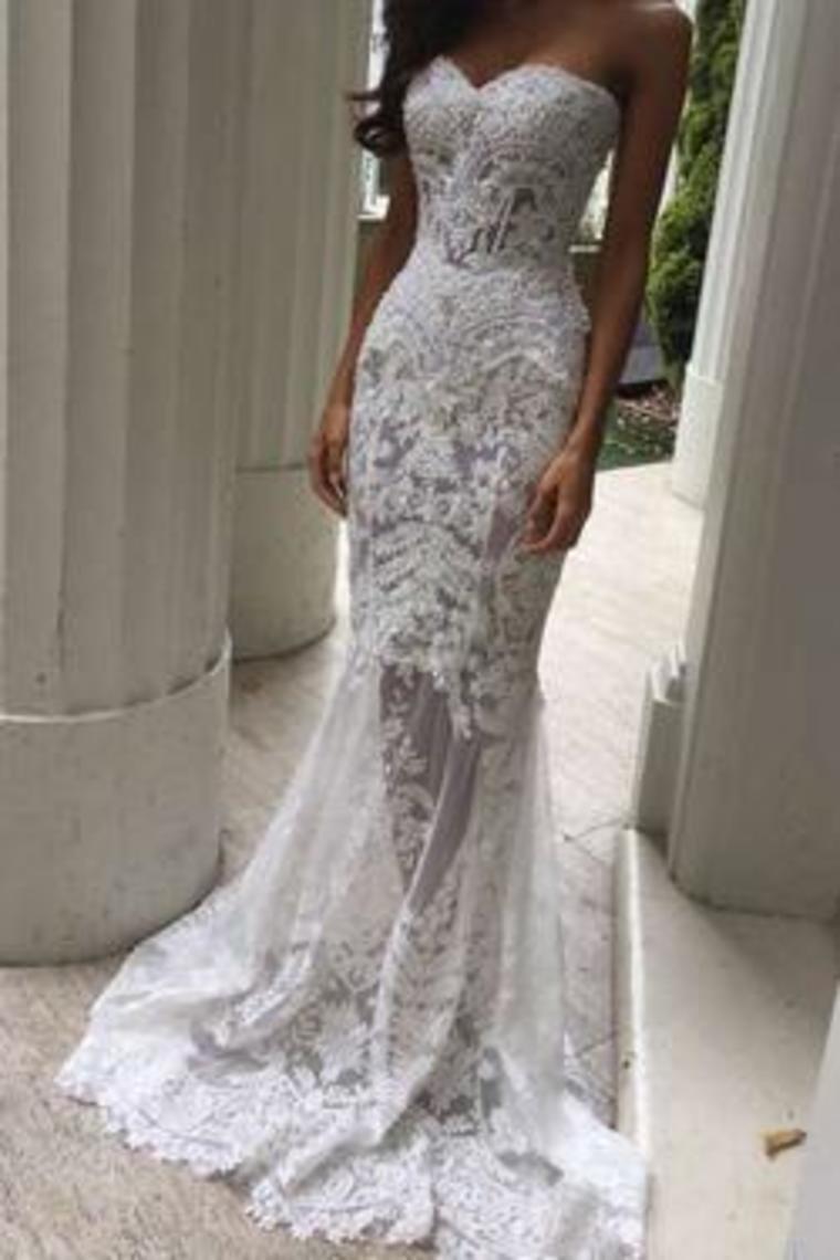2024 Hot Selling Sweetheart Wedding Dresses Sheath With Applique And Beads Sweep Train