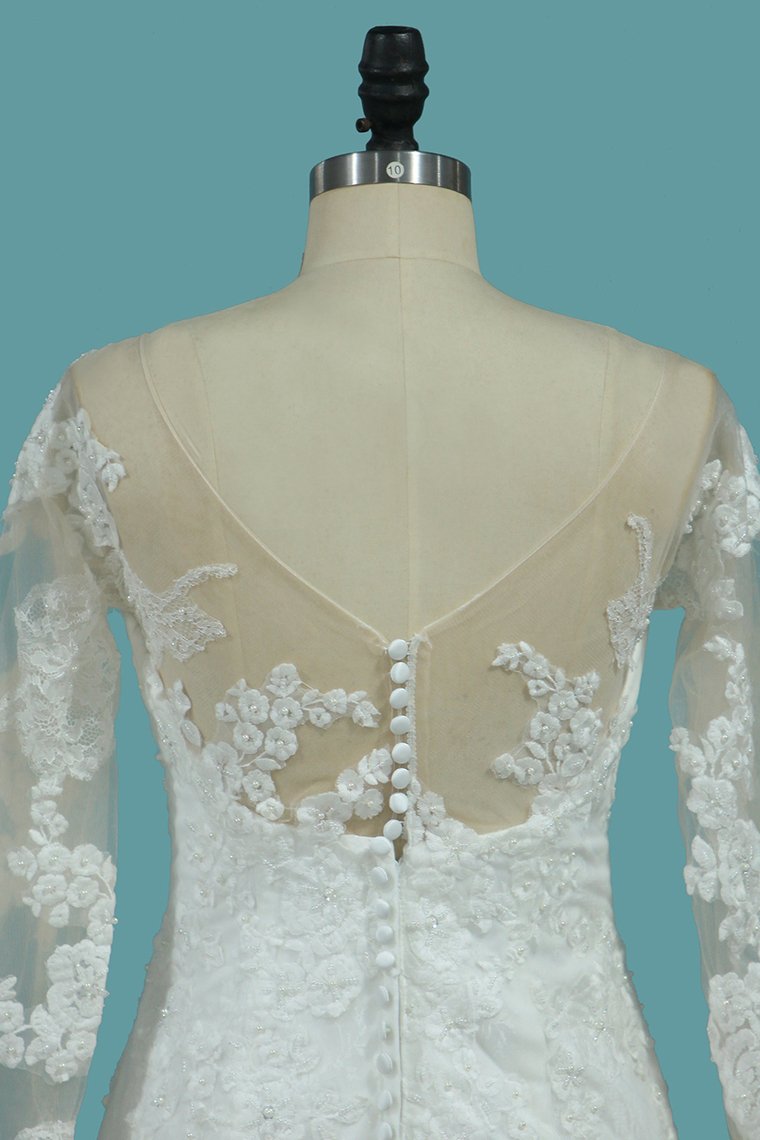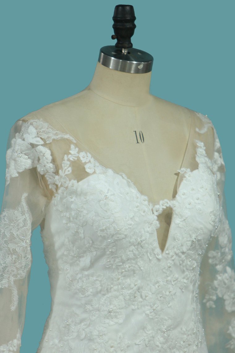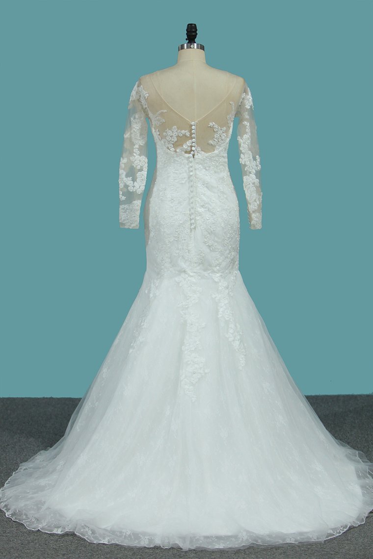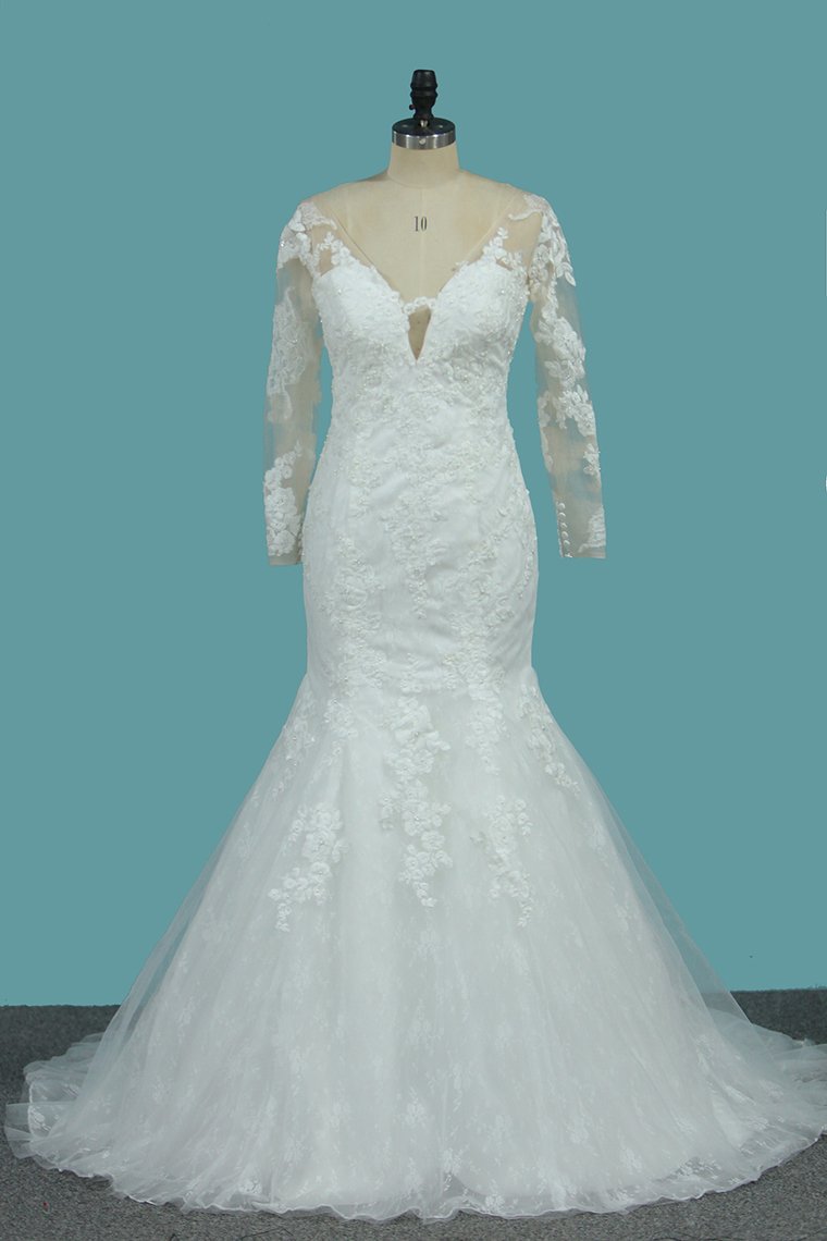 2024 Lace Mermaid V Neck Long Sleeve Wedding Dresses With Applique