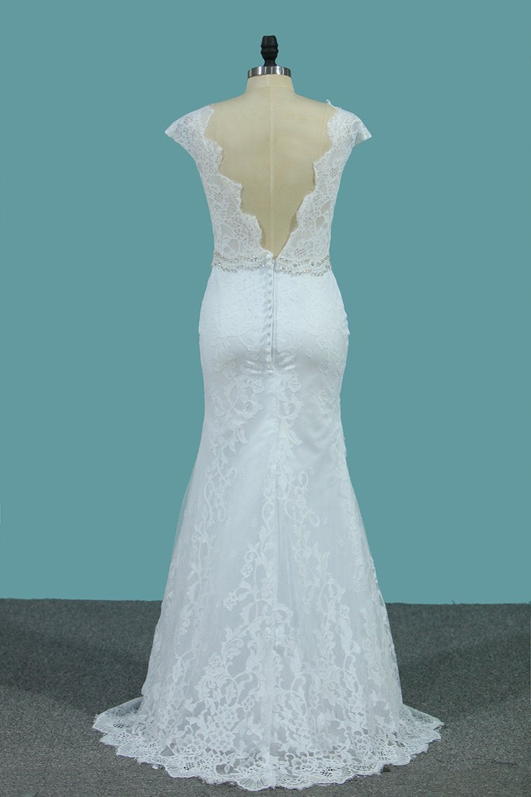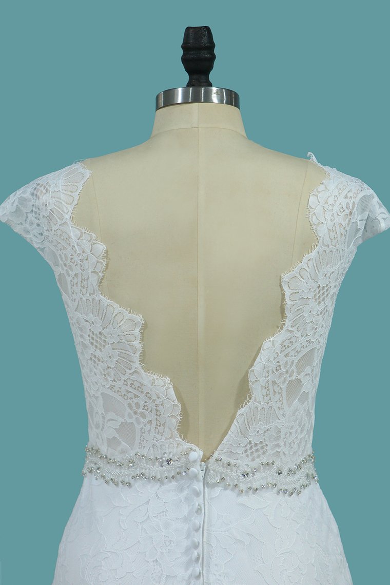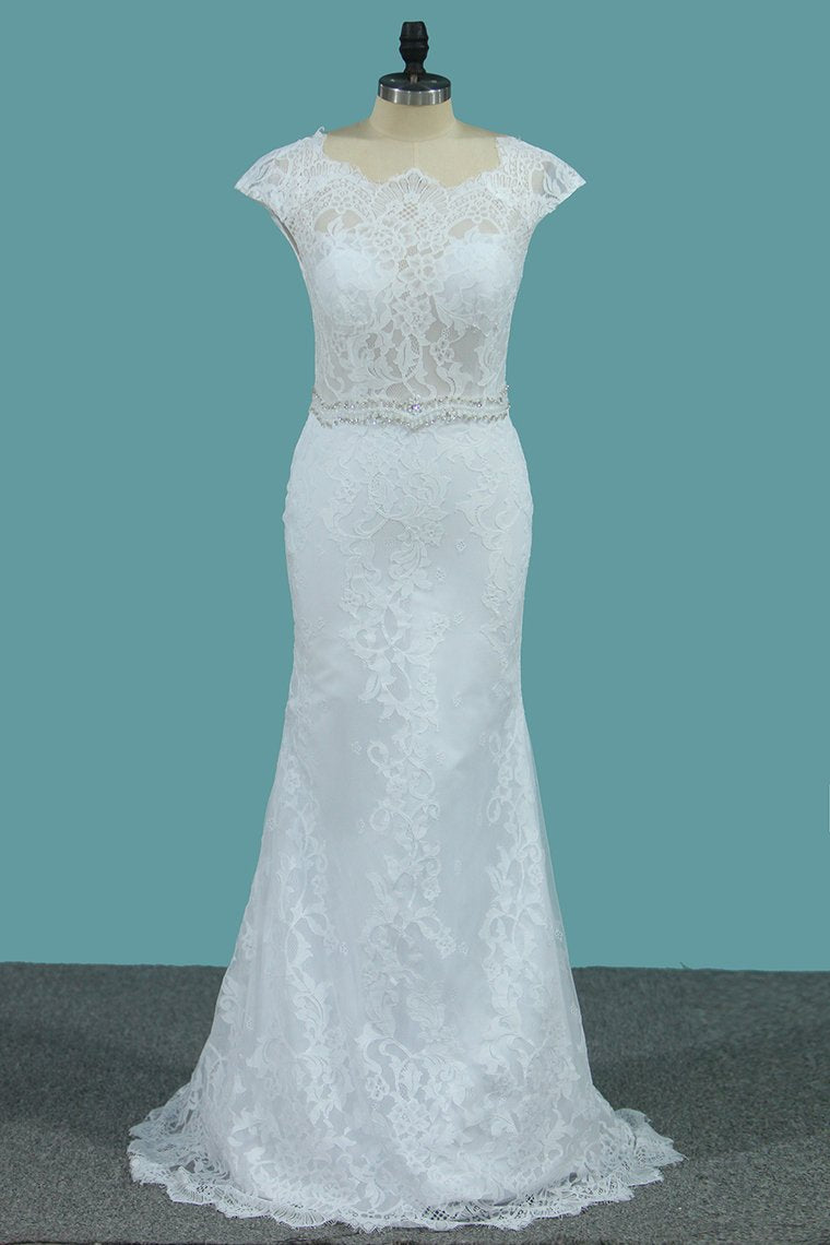 2024 Lace Wedding Dresses Scoop With Beaded Waistline Covered Button Open Back