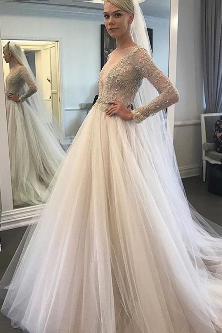2024 Long Sleeves Bateau Wedding Dresses Tulle A Line With Applique Court Train