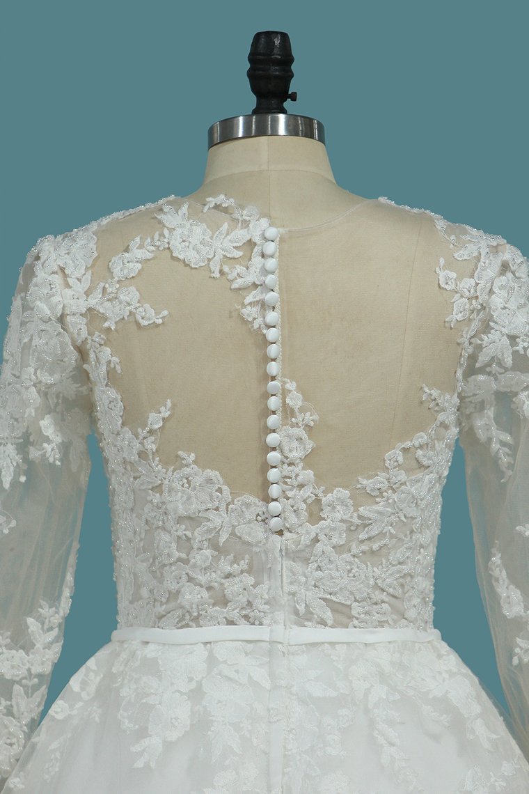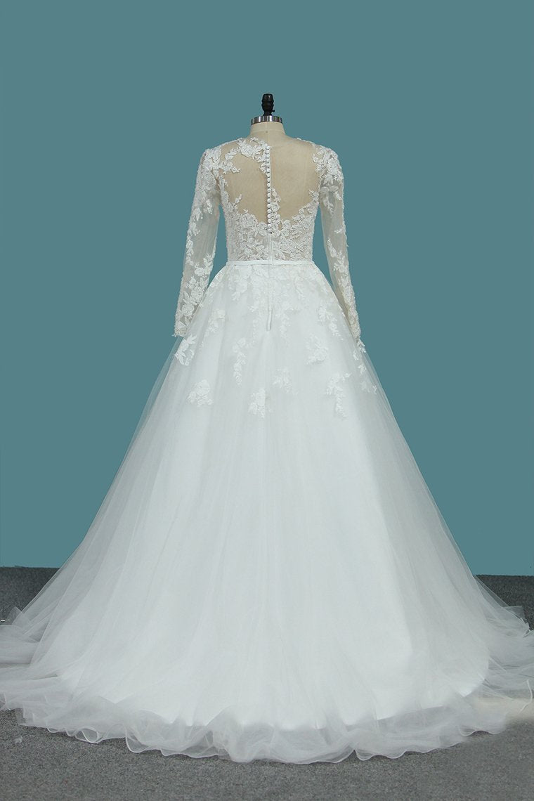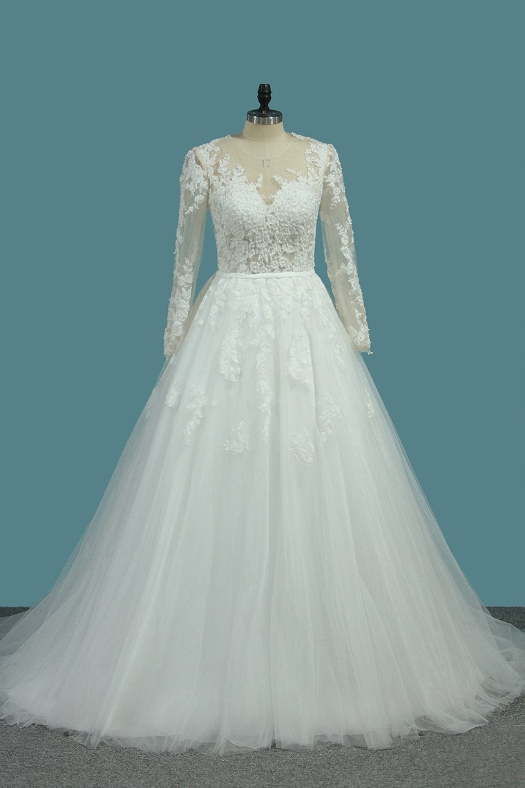 2024 Long Sleeves Scoop Tulle A Line Wedding Dresses With Applique Court Train