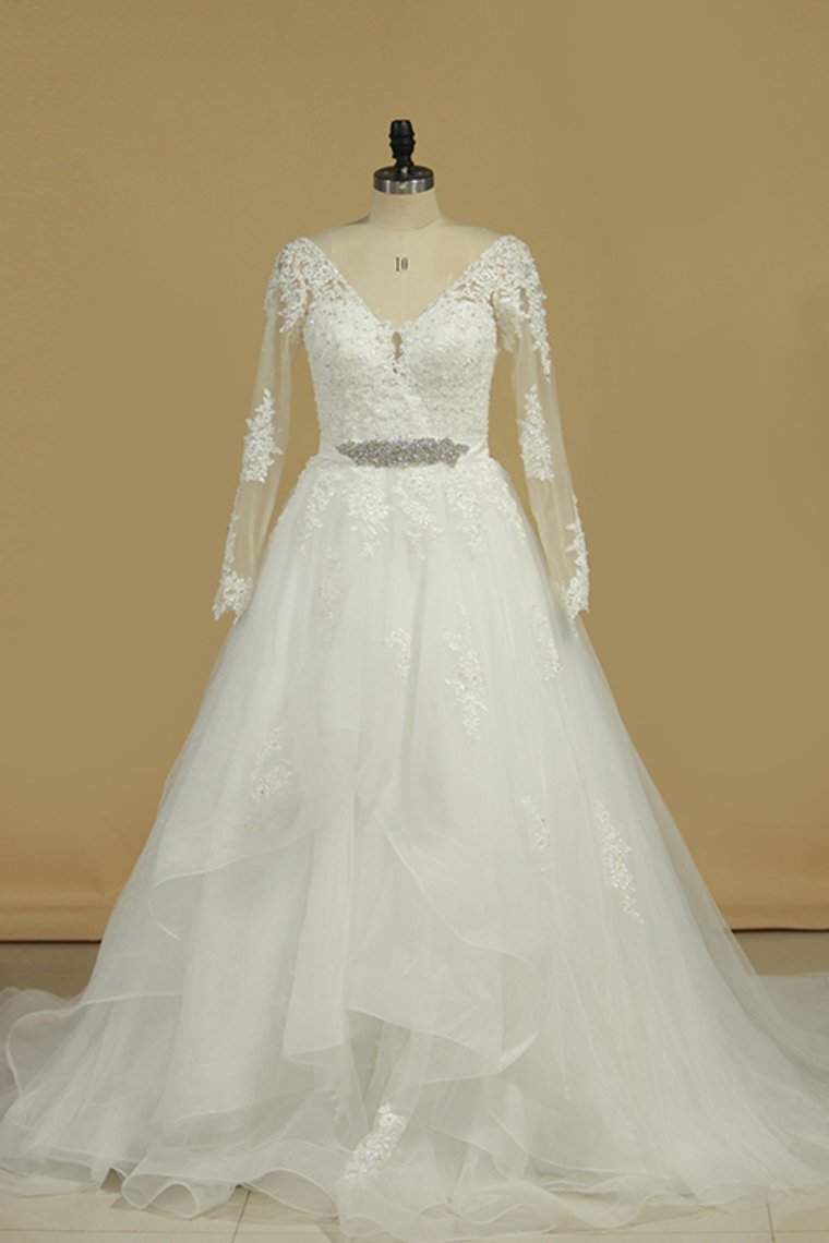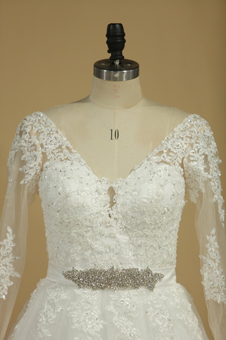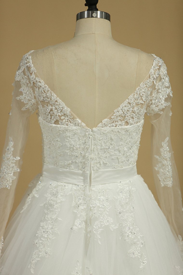 2024 Long Sleeves V Neck Tulle With Applique A Line Wedding Dresses