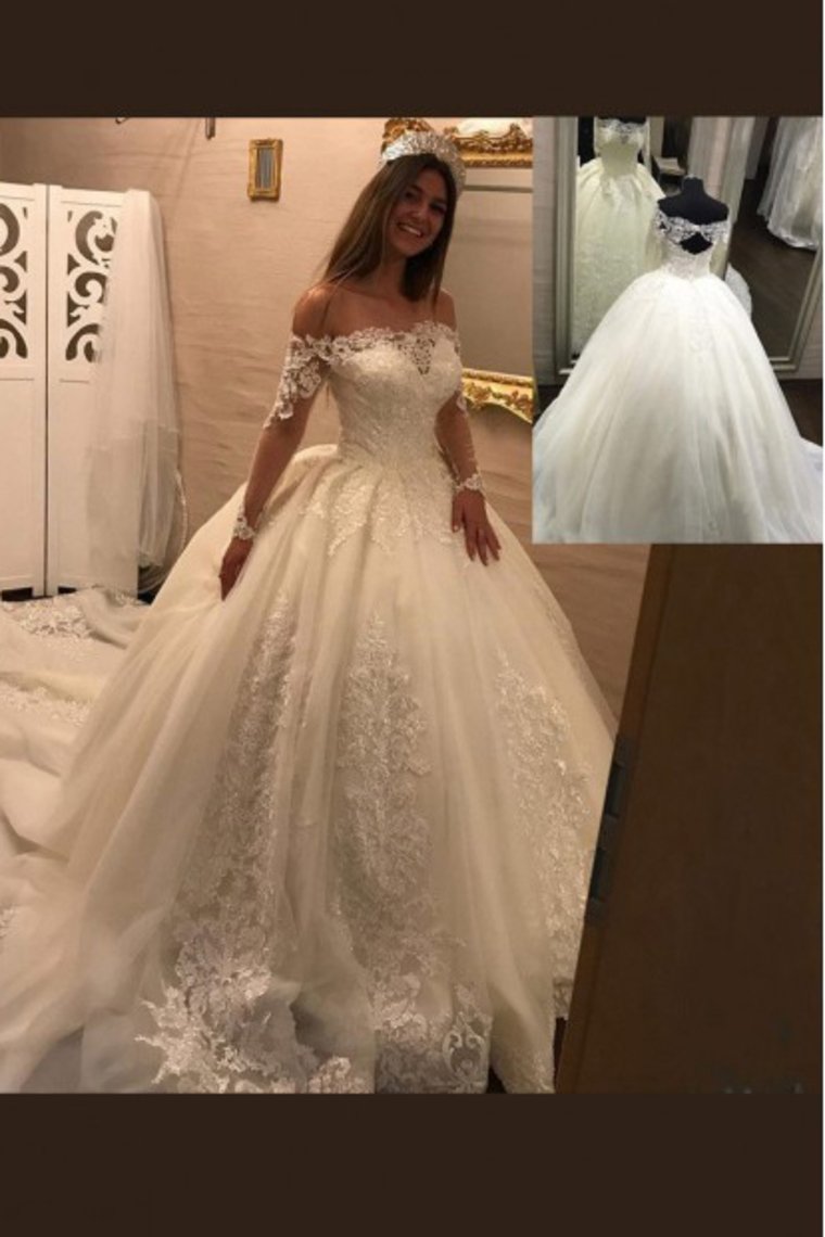 2024 Luxurious Ball Gown Wedding Dresses Long Sleeves Boat Neck Tulle With Applique