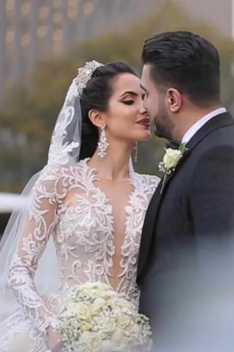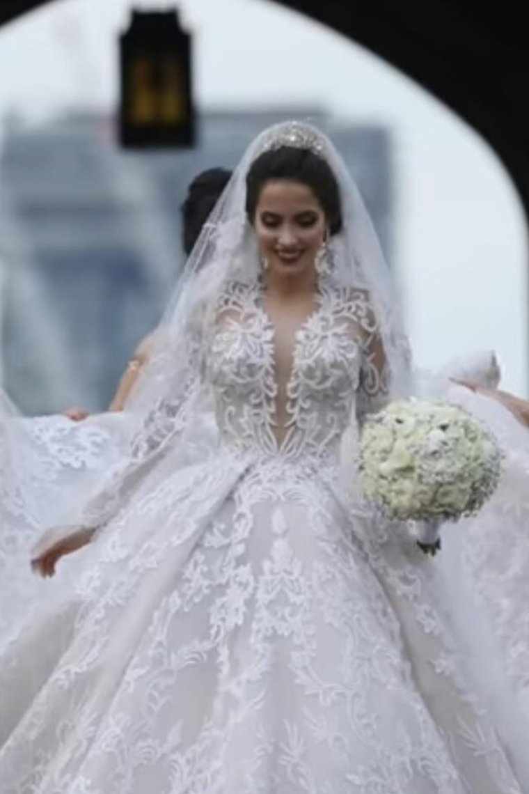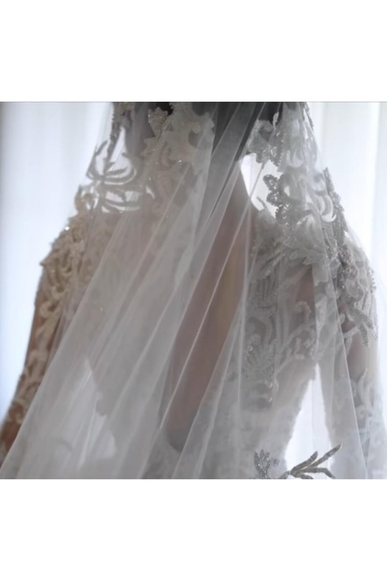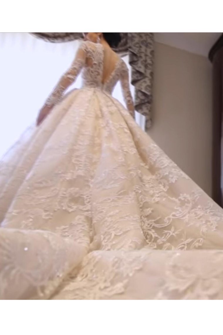 2024 Luxurious Long Sleeves Scoop A Line Lace Wedding Dresses With Pearls Royal Train
